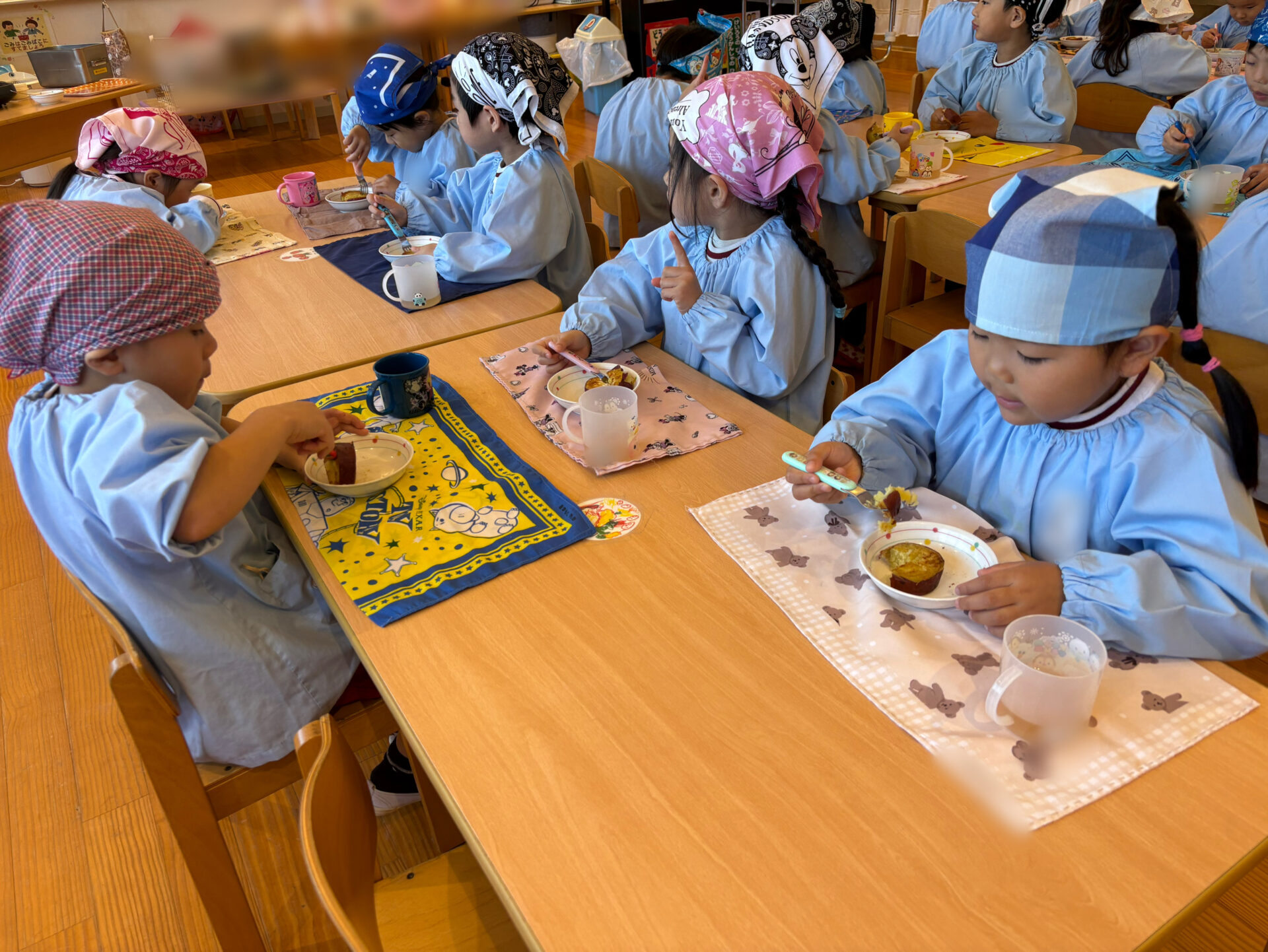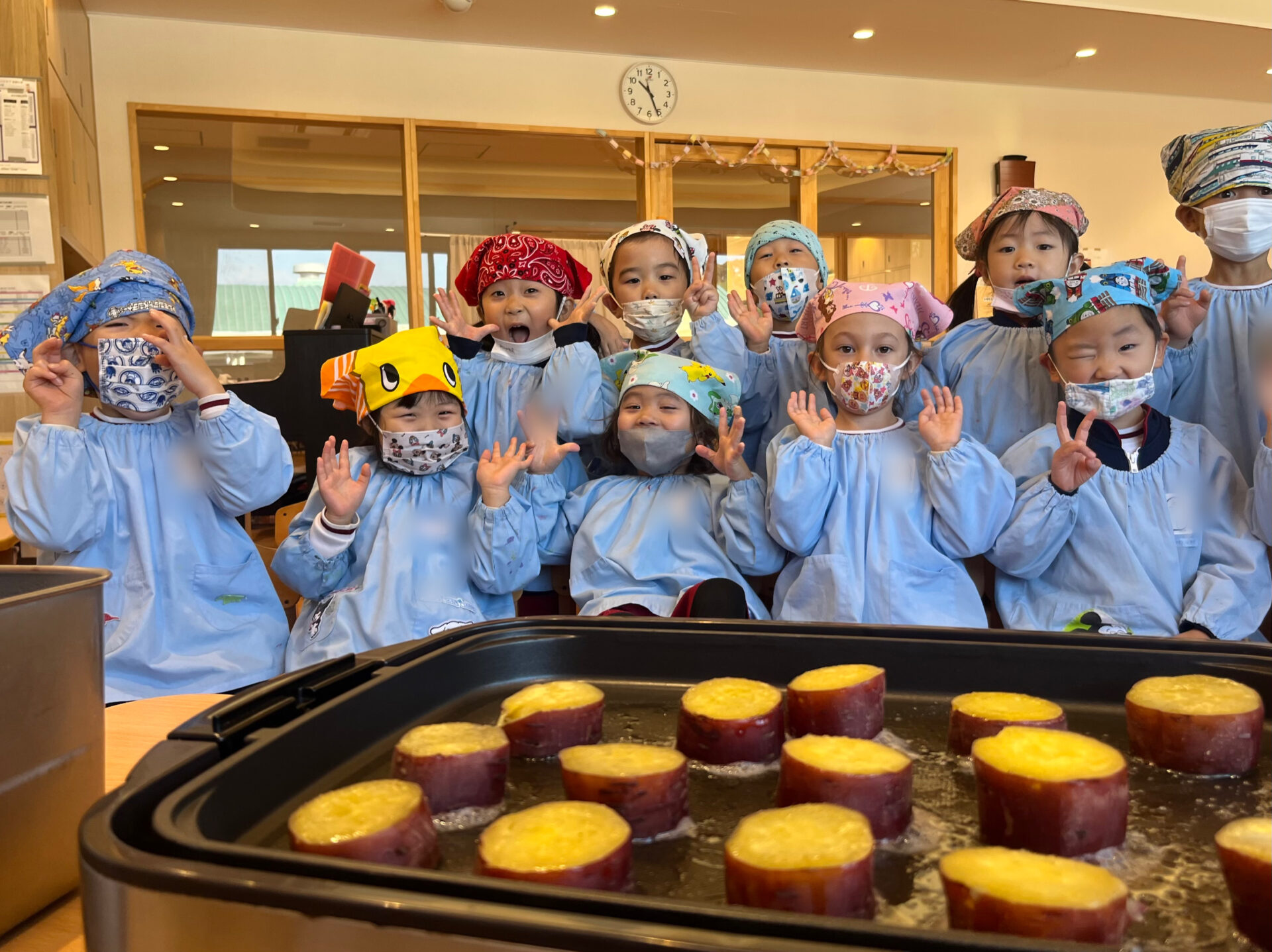 インフルエンザ感染予防のため、クラスごとに分かれて実施し、クッキングは保育教諭のデモンストレーションを見せる形で楽しみました✨