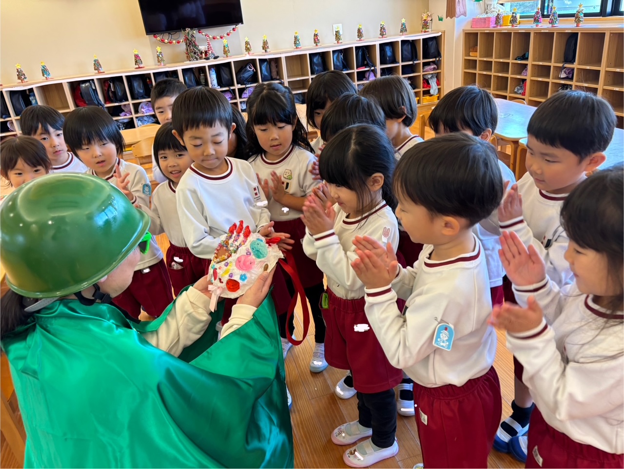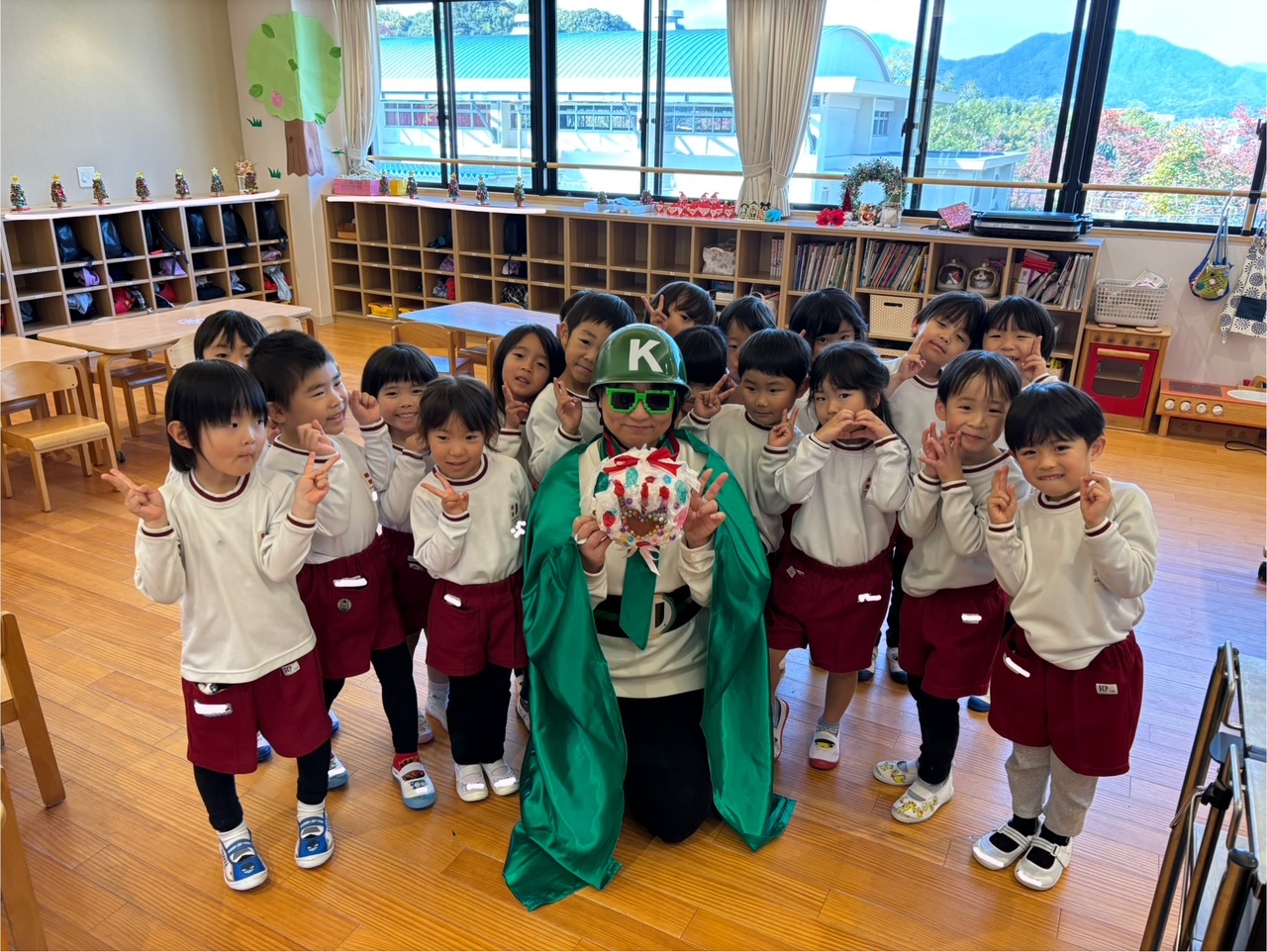 グリーンレンジャーにやっと会えた💚と園児の思いがあふれ出し、お誕生日🎂を祝う歌を歌ったり、たくさんのお話をしたりしました。