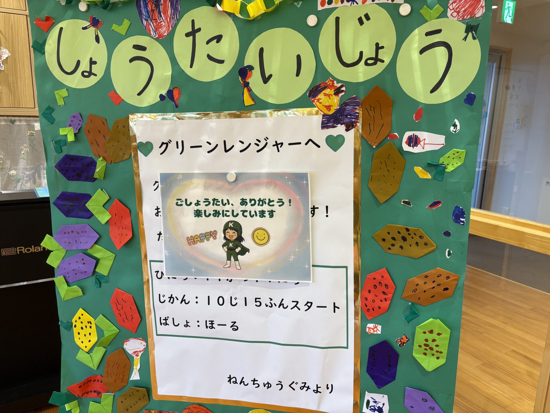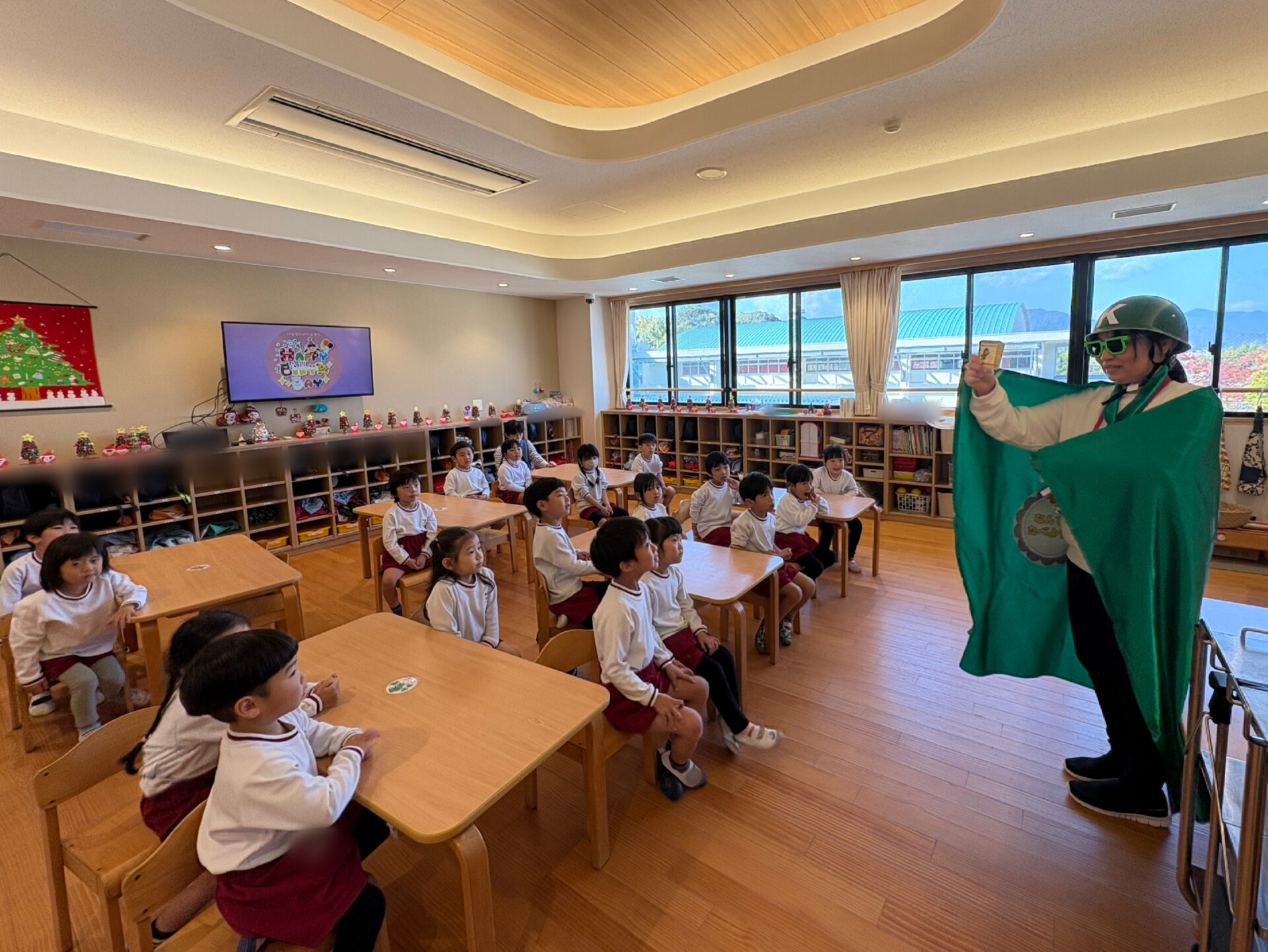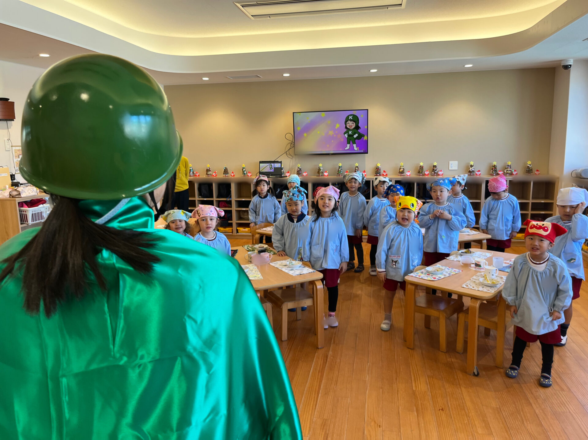 グリーンレンジャーにやっと会えた💚と園児の思いがあふれ出し、お誕生日🎂を祝う歌を歌ったり、たくさんのお話をしたりしました。