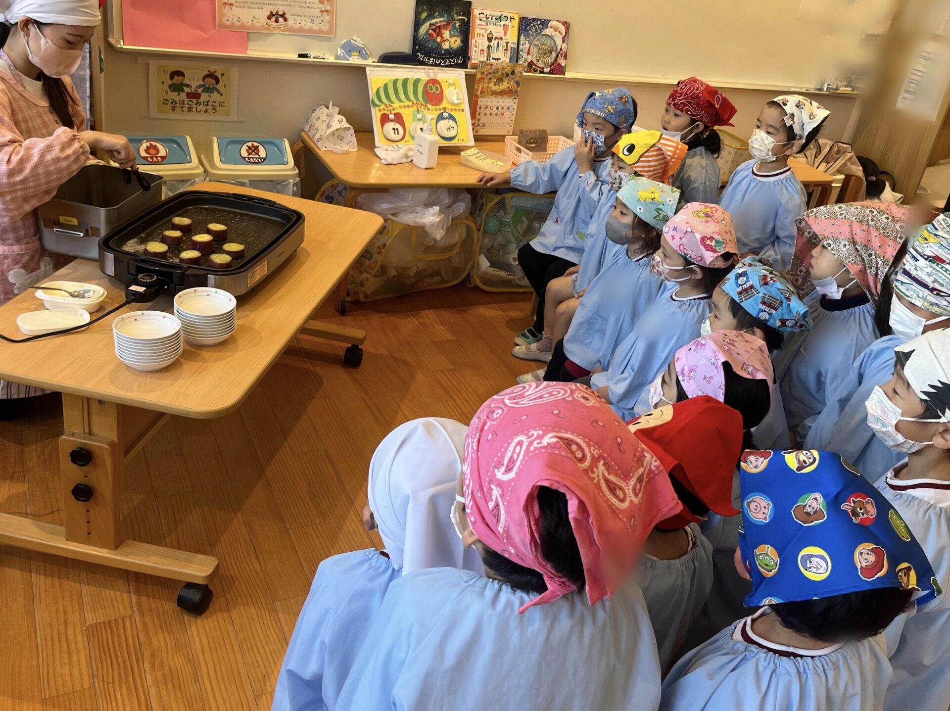 インフルエンザ感染予防のため、クラスごとに分かれて実施し、クッキングは保育教諭のデモンストレーションを見せる形で楽しみました✨