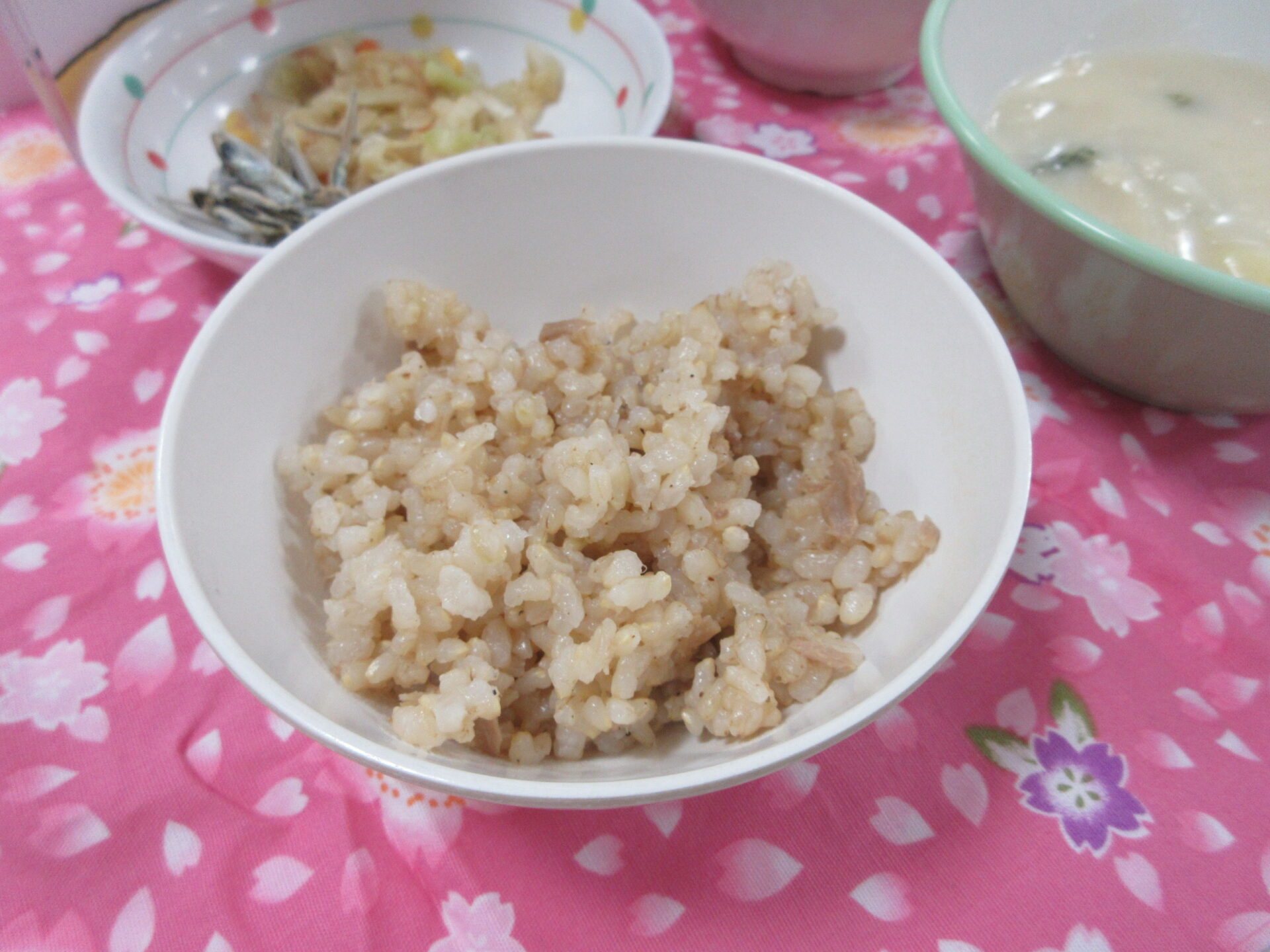 発芽玄米ご飯にツナが混ぜてあり、人気の味でした。豆乳シチューは温かく濃厚でとても美味しかったです。