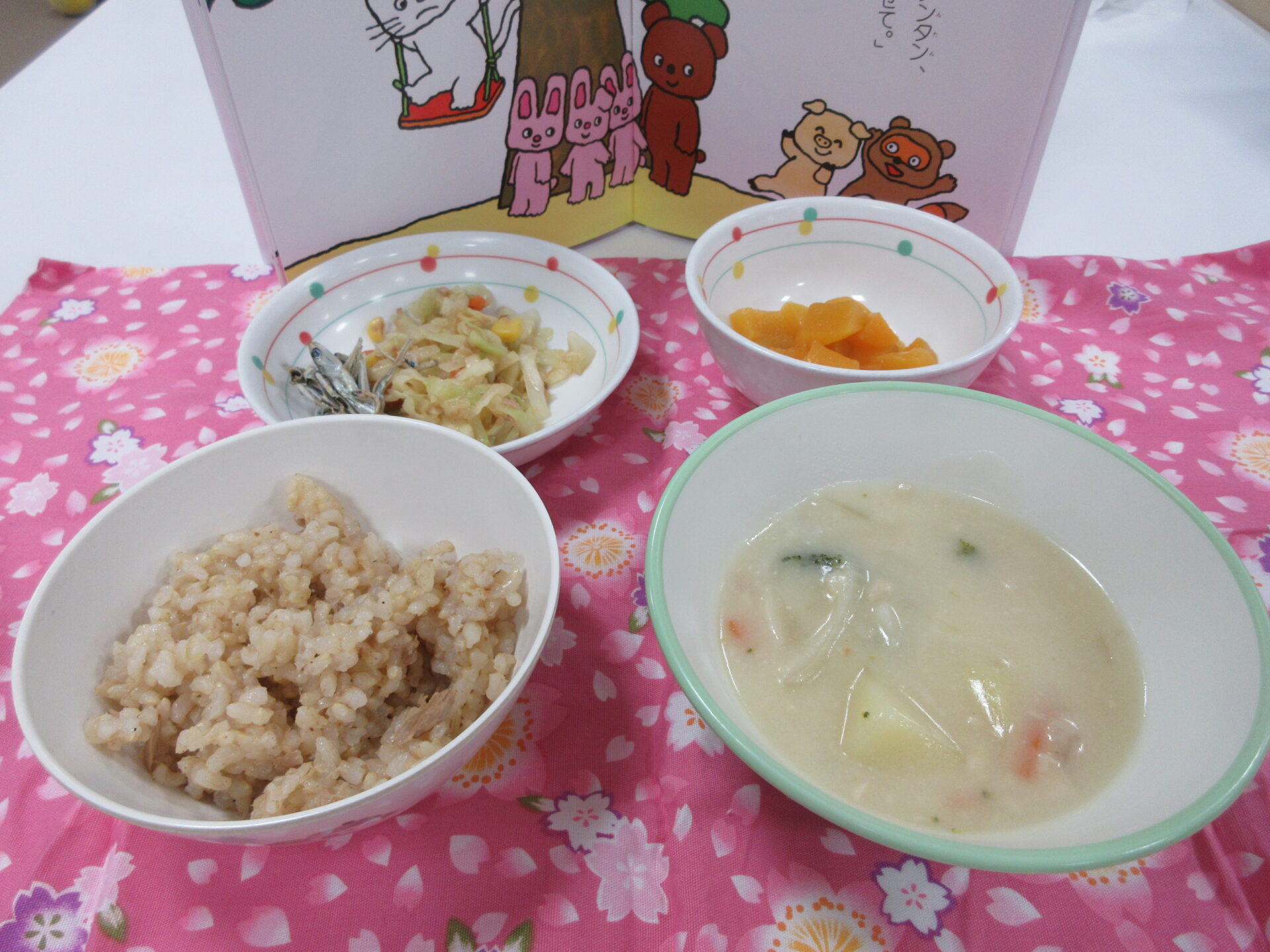 発芽玄米ご飯にツナが混ぜてあり、人気の味でした。豆乳シチューは温かく濃厚でとても美味しかったです。