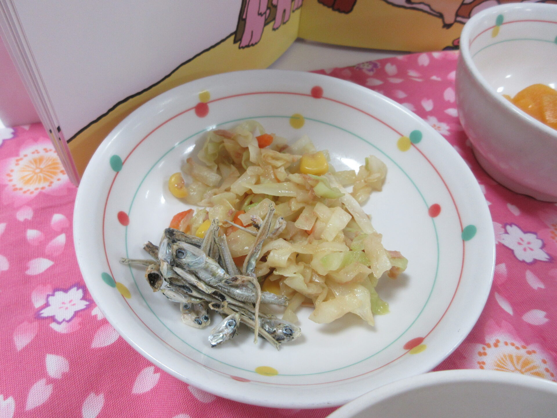 【ツナご飯 豆乳シチュー コーンサラダ 黄桃缶 食べる煮干し】