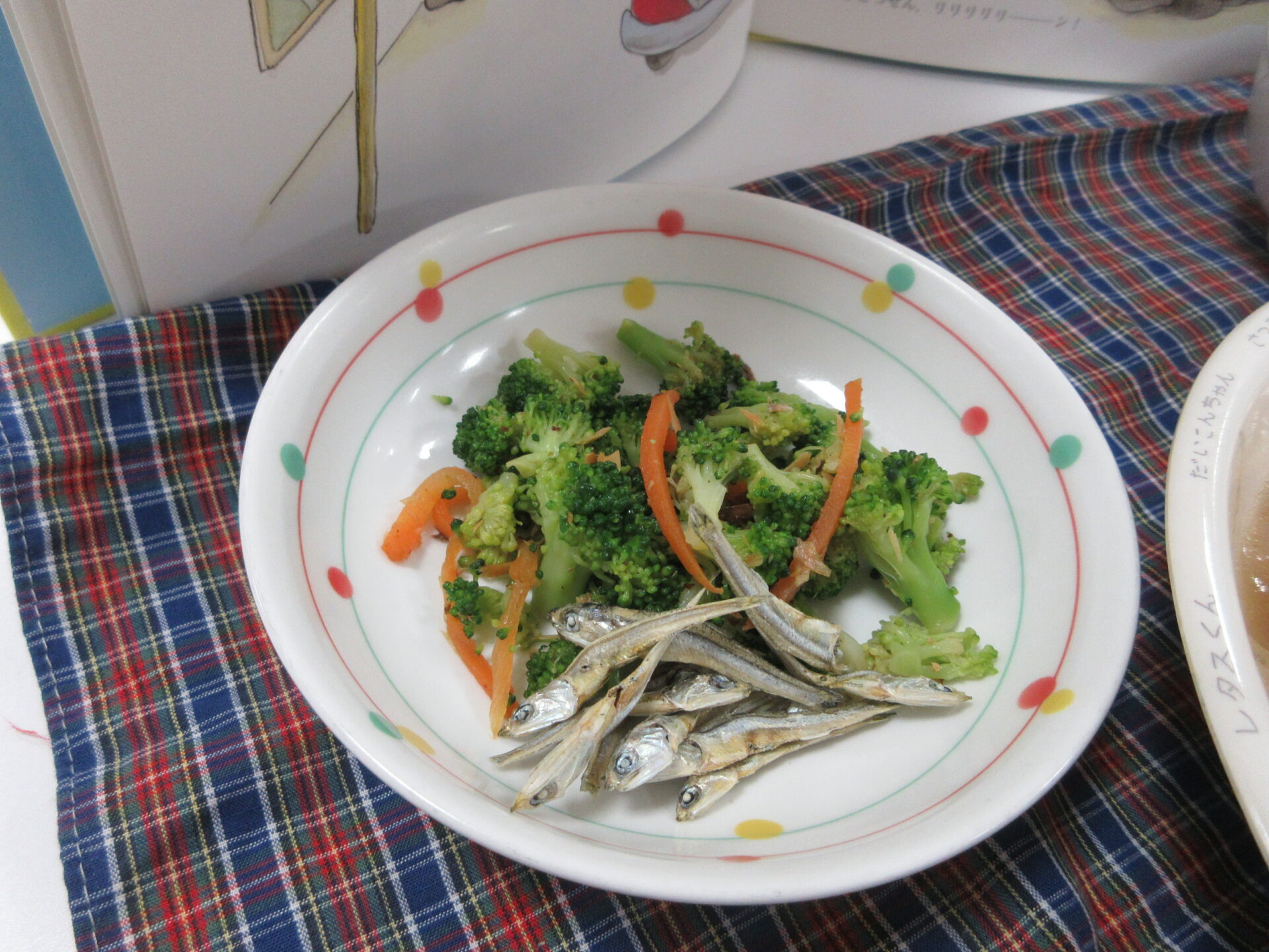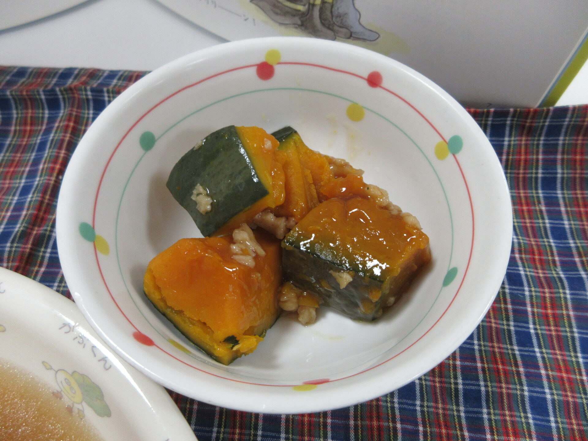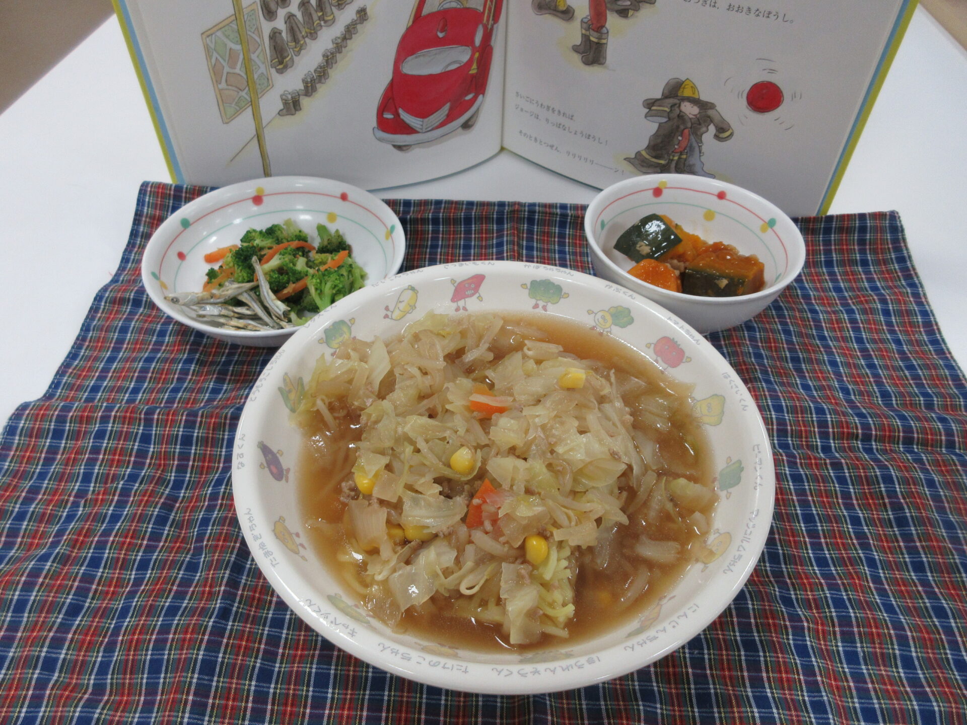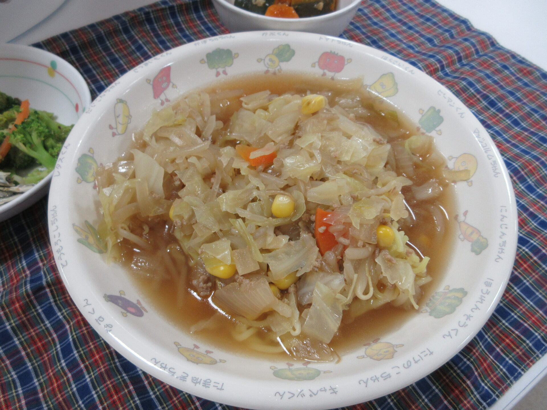 きゃべつの甘い系ちゃんぽん麺は、園児の大好きメニューです。ツルツルとたくさん食べました。そぼろ煮はとろみもあり美味しかったです。