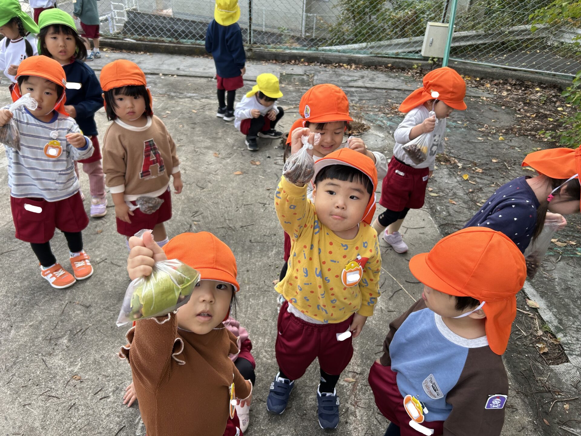 異年齢でのかかわりの中で、やさしく見守ったり真似をしたりしながらお互いに刺激を受け、心がほっこりするお散歩となりました。「もっとどんぐり拾いしたいなあ!」「またお散歩行こうね!」