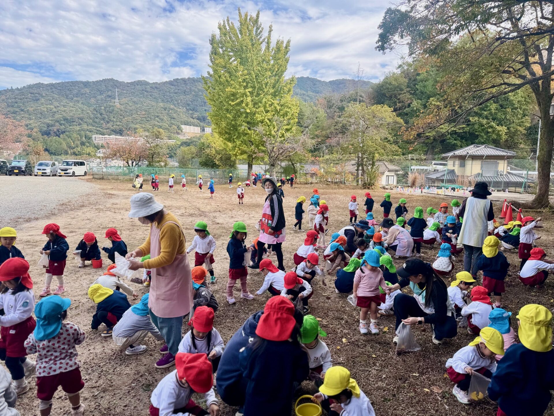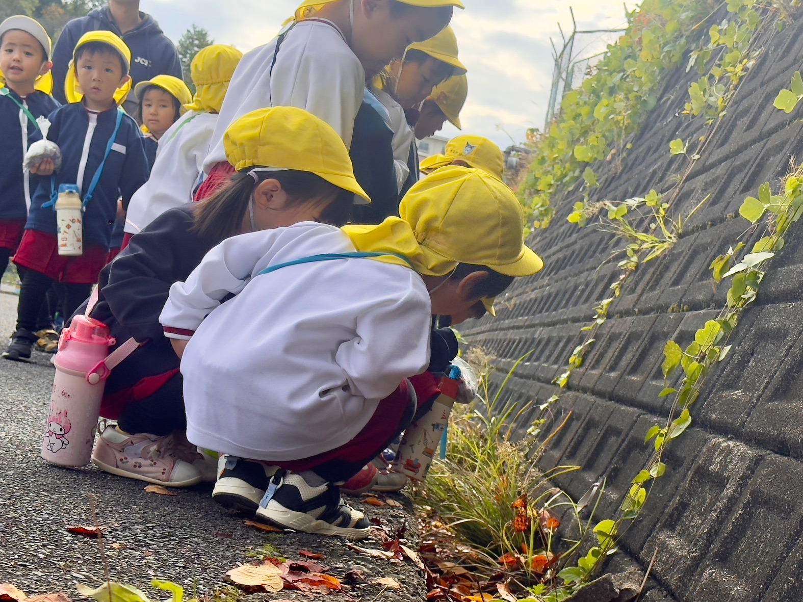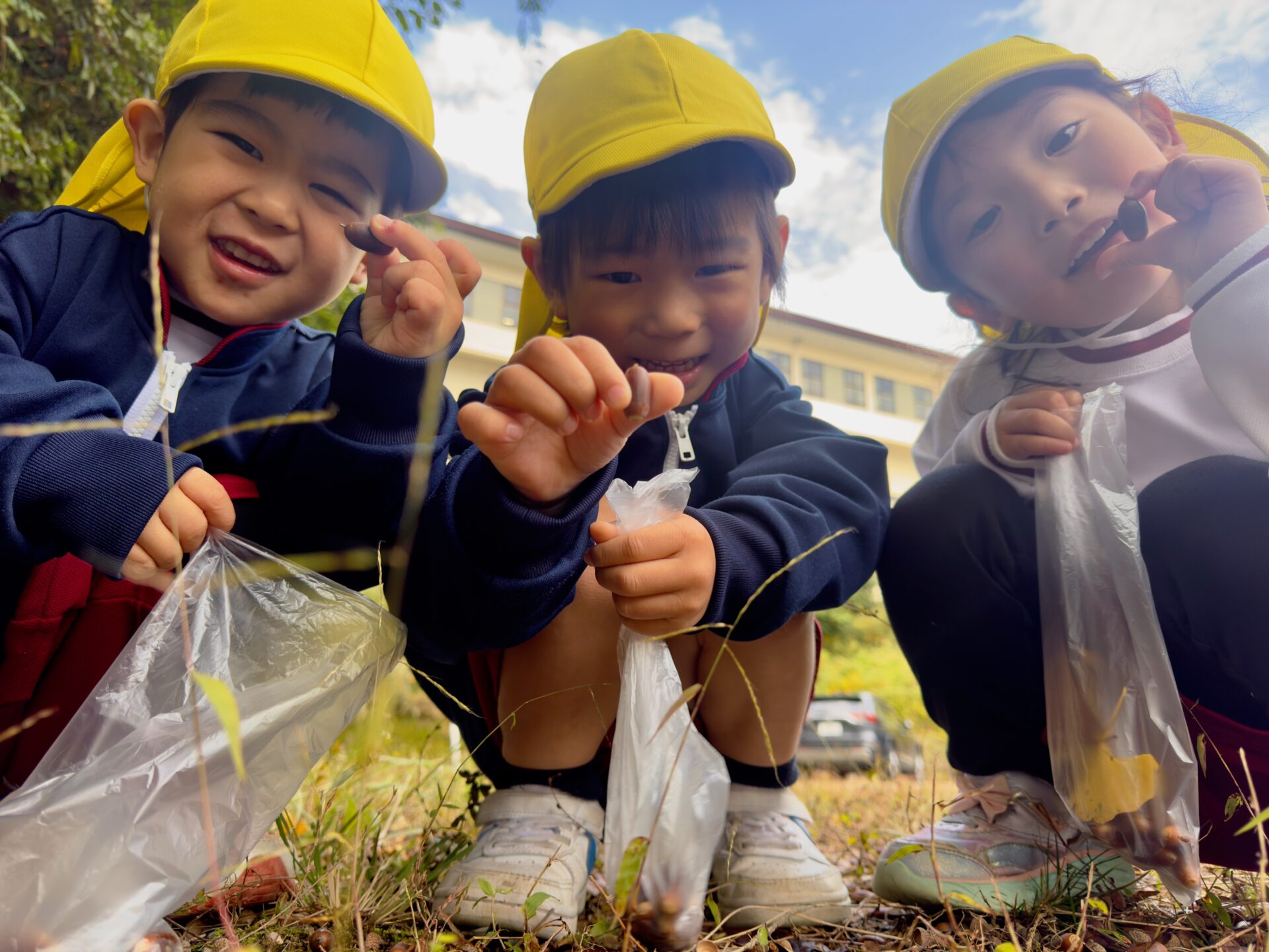 落ち葉を踏む音に耳をすませたり、「どんぐりあった!」「ちっちゃいのかわいいね💕」と秋の実を見ては嬉しそうに見せ合う園児たち。袋いっぱいにどんぐりや落ち葉を集めて大満足のお土産になりました。