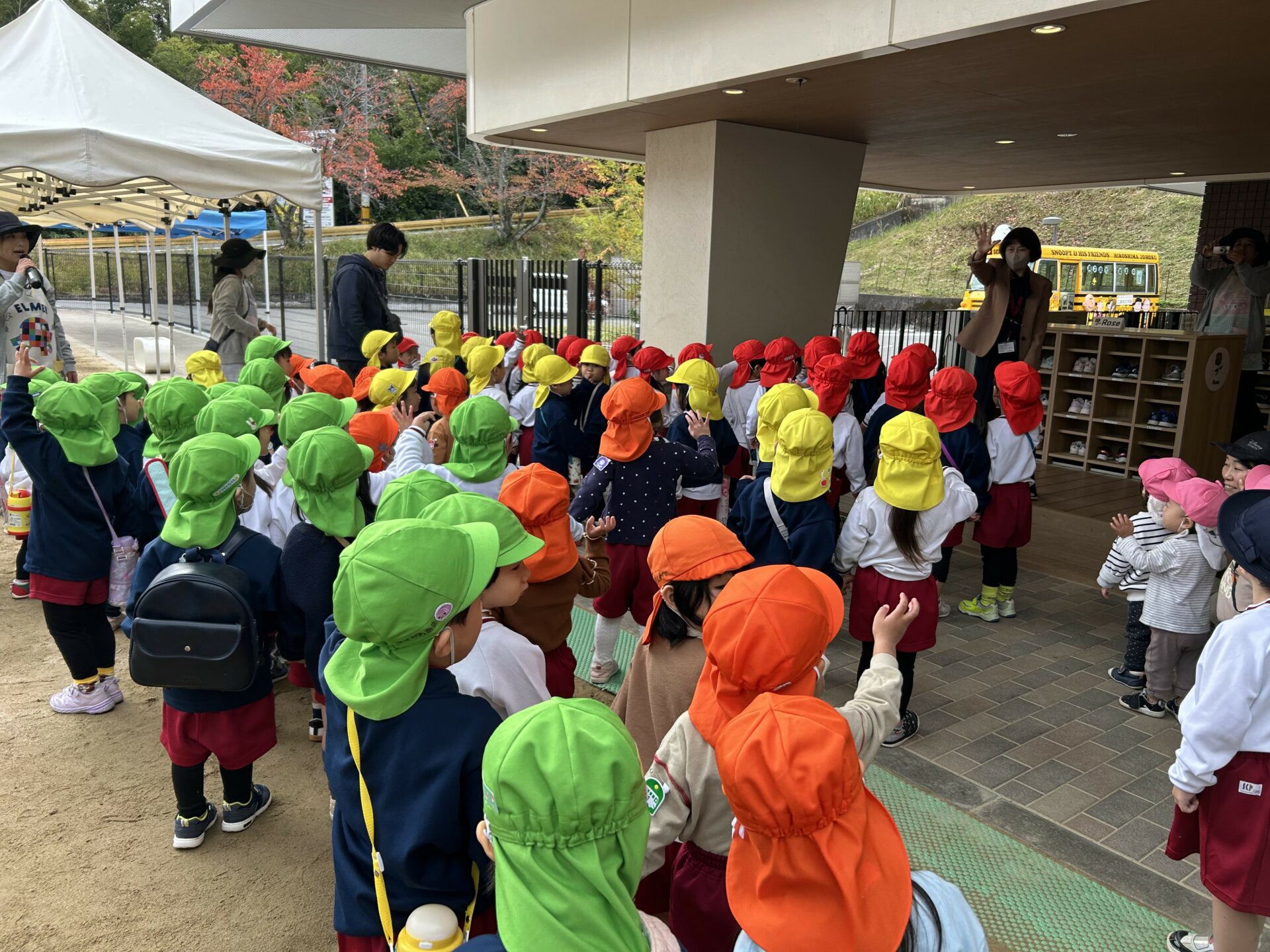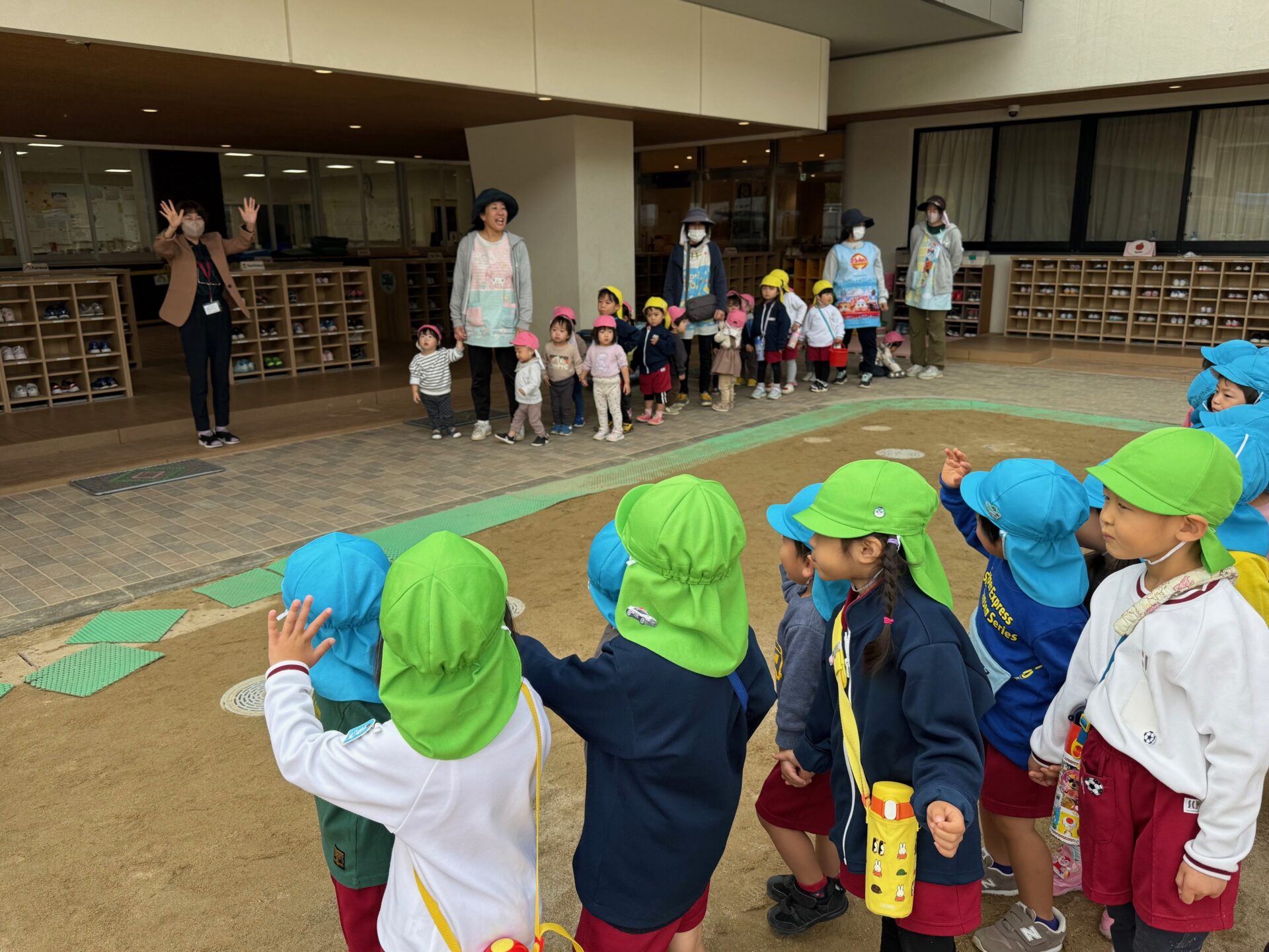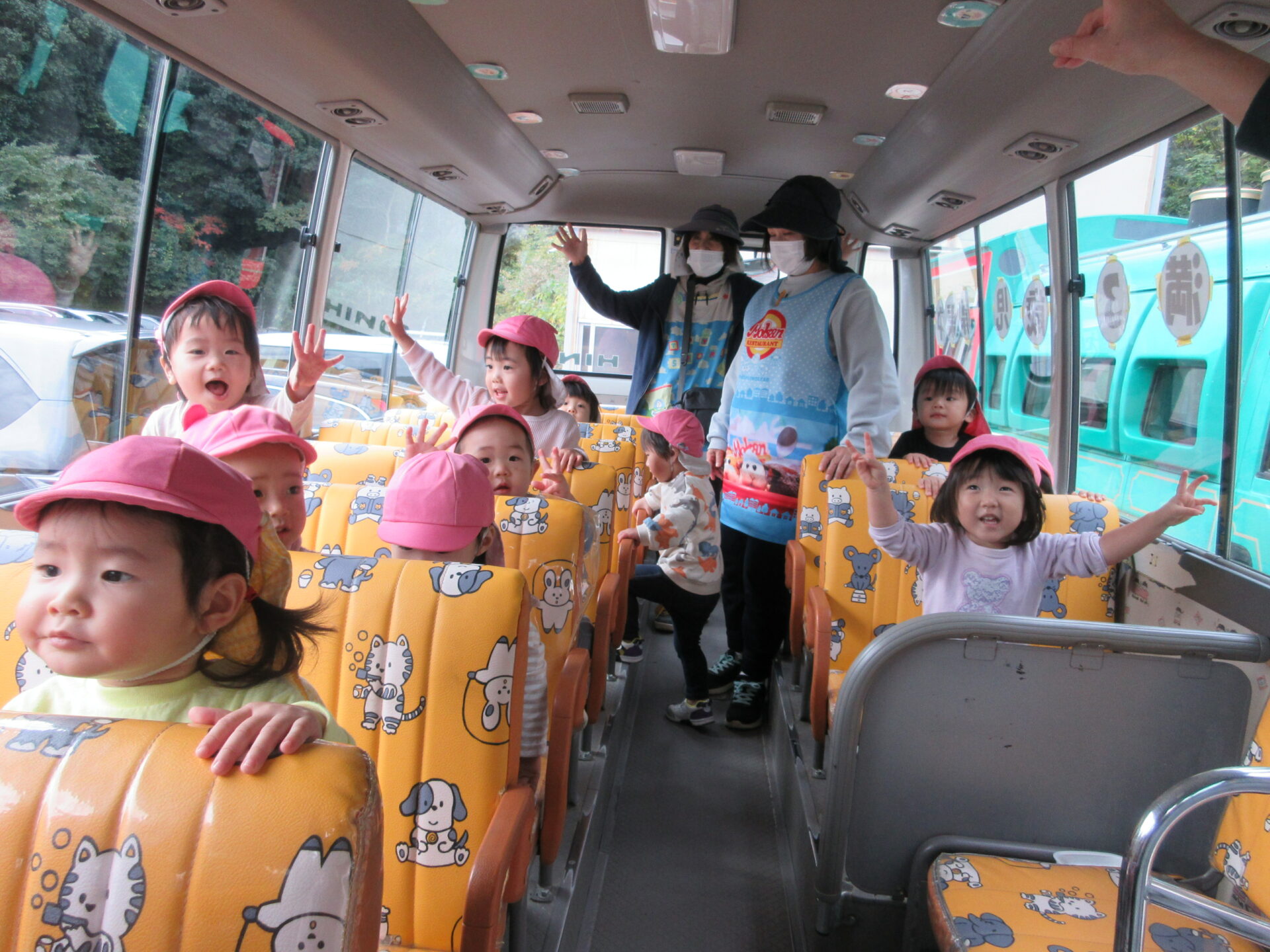 乳児部と年少組で一緒に第2園庭へ散歩に行きました。年少児は小さな友達の手をそっとつないで歩いたり、「こっちだよ!」と道を教えたりするなど頼もしい姿が見られました。乳児部の園児も一緒に手をつないで上手に歩くことができました。Rabbit組は、第2園庭に駐車中の園バスに乗って“大型バス”の歌を元気よく歌いました🚌