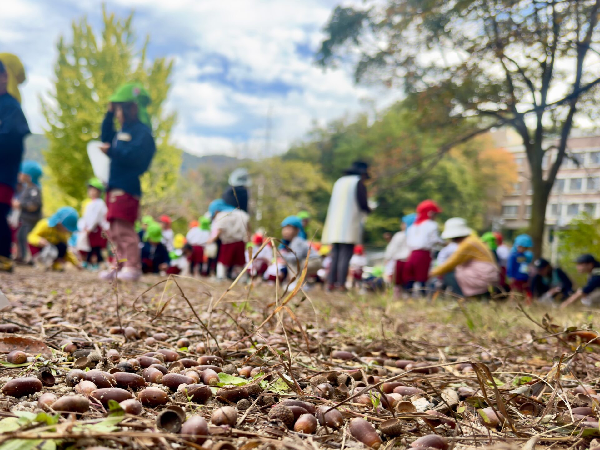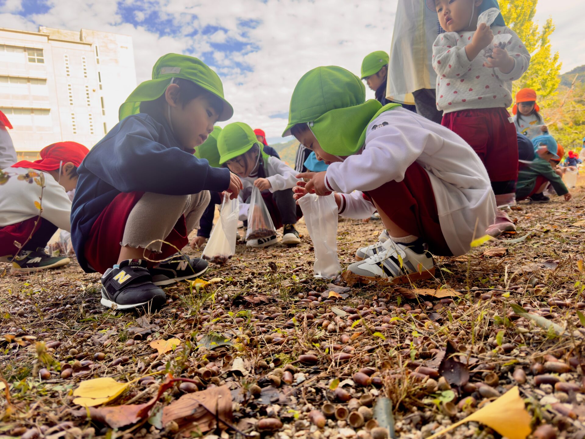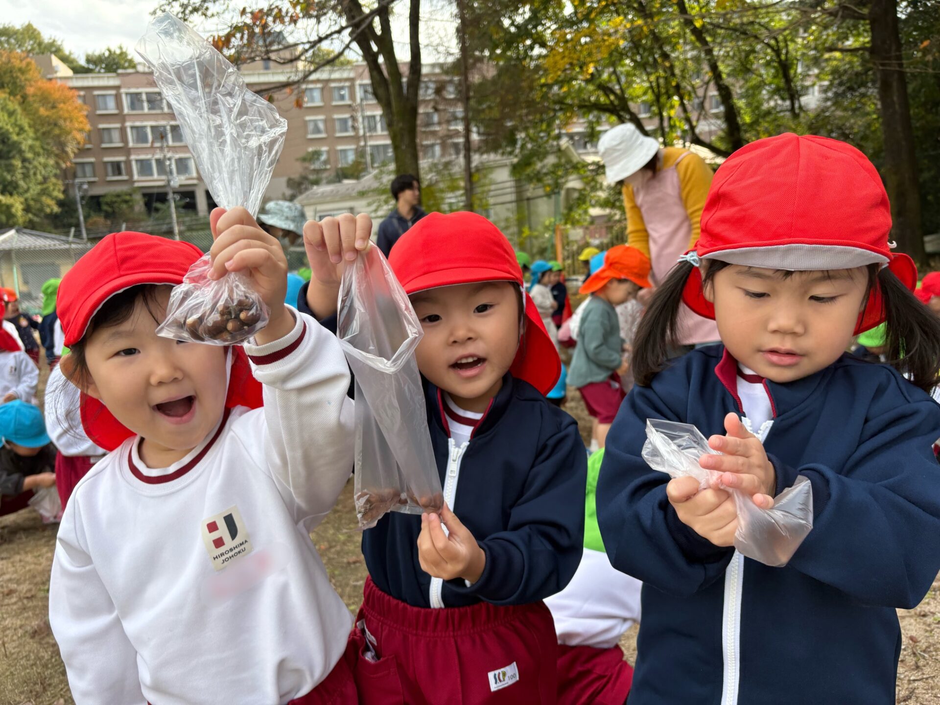 落ち葉を踏む音に耳をすませたり、「どんぐりあった!」「ちっちゃいのかわいいね💕」と秋の実を見ては嬉しそうに見せ合う園児たち。袋いっぱいにどんぐりや落ち葉を集めて大満足のお土産になりました。