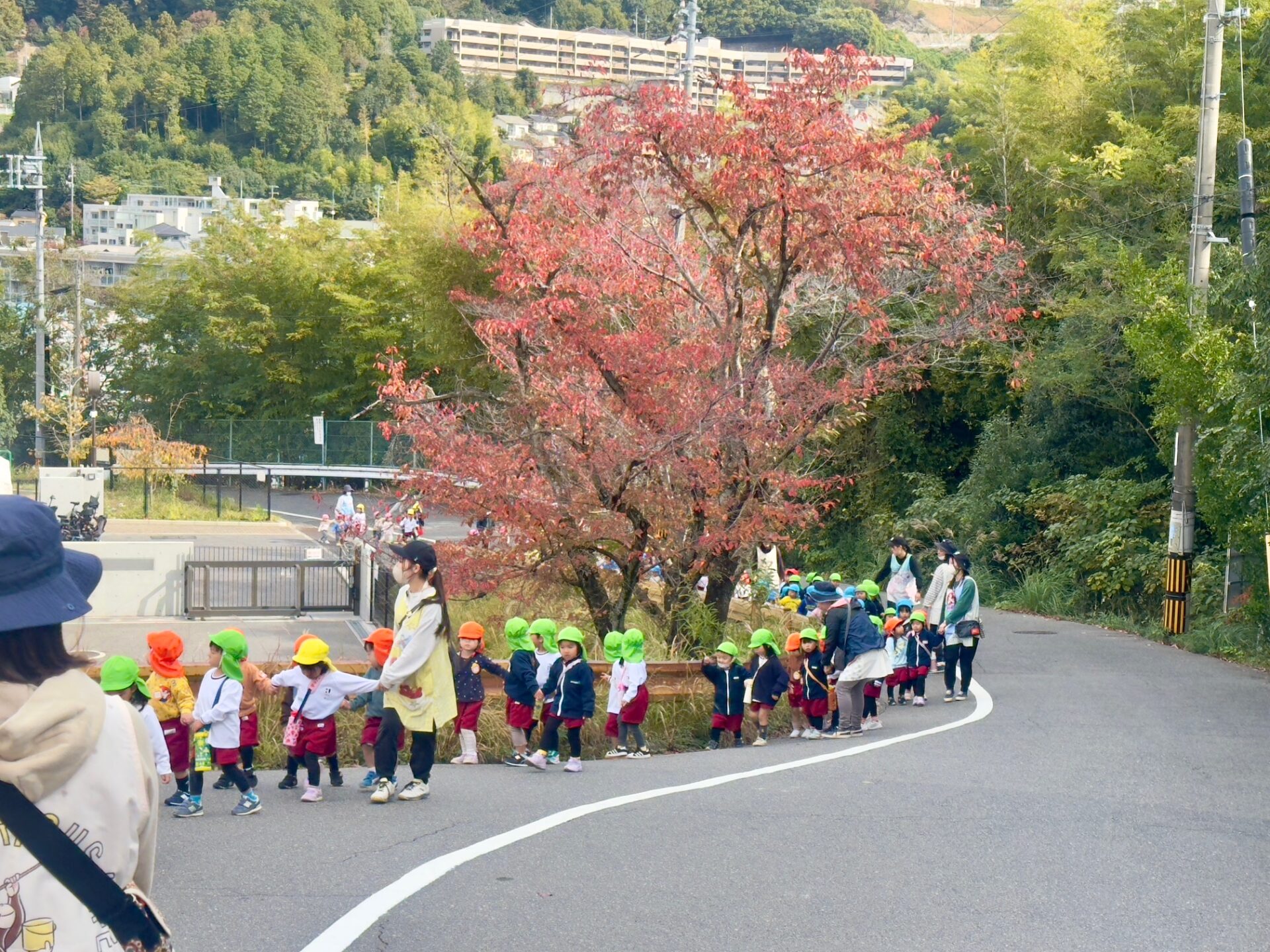 異年齢でのかかわりの中で、やさしく見守ったり真似をしたりしながらお互いに刺激を受け、心がほっこりするお散歩となりました。「もっとどんぐり拾いしたいなあ!」「またお散歩行こうね!」
