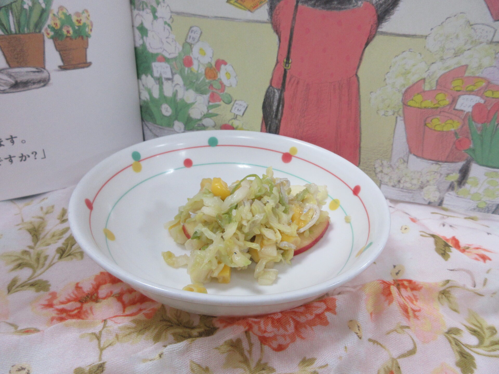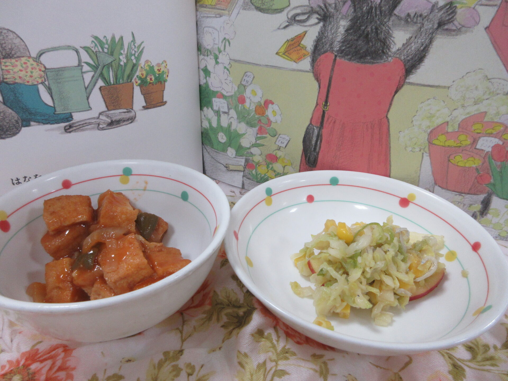 園児好みの甘い味で厚揚げもパクパク食べました。🍎りんごサラダはあっさりと美味しかったです。