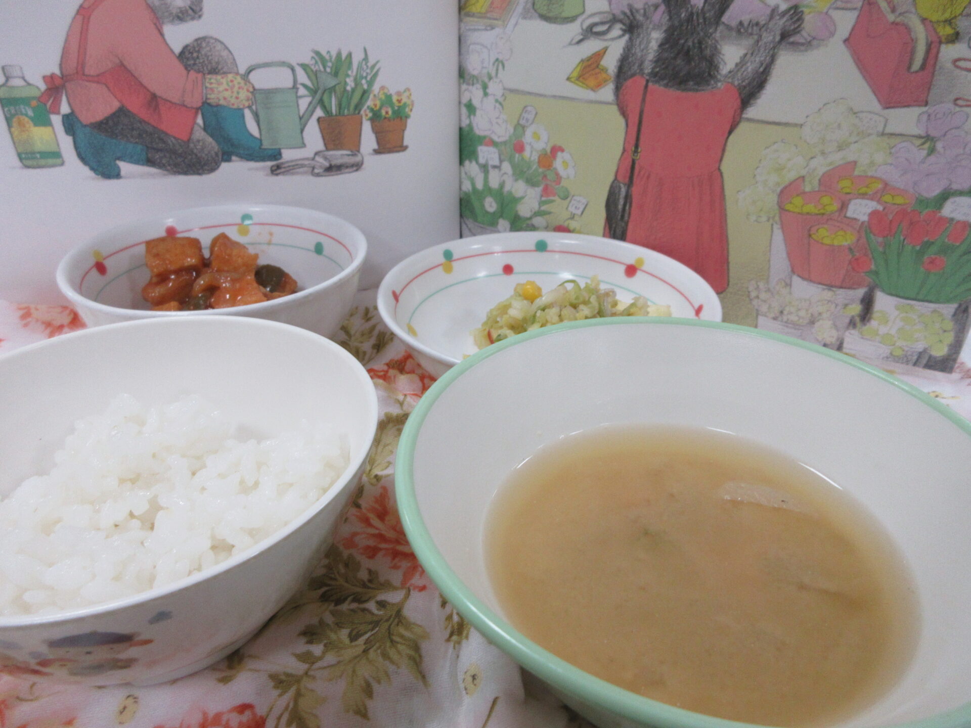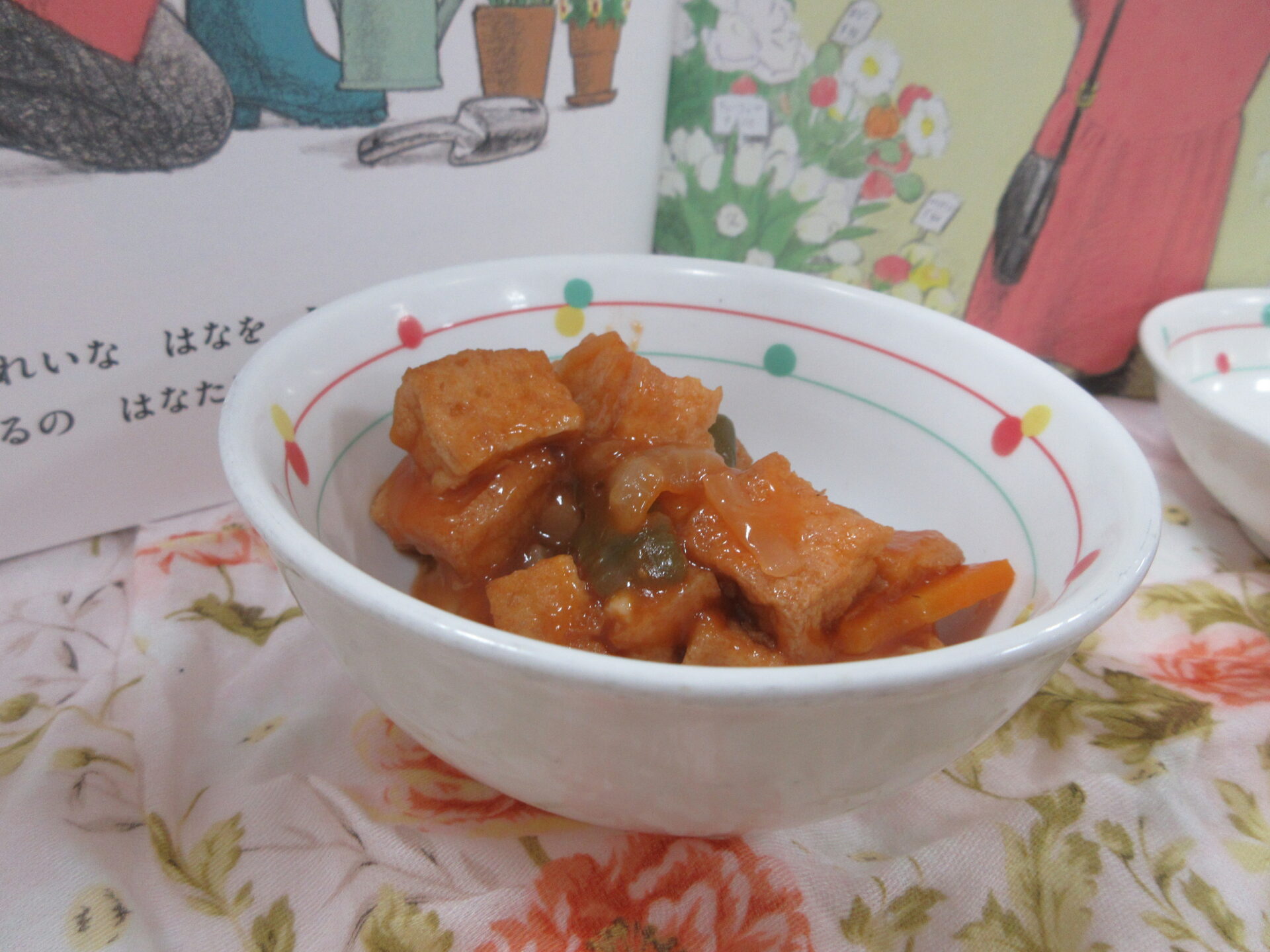 園児好みの甘い味で厚揚げもパクパク食べました。🍎りんごサラダはあっさりと美味しかったです。