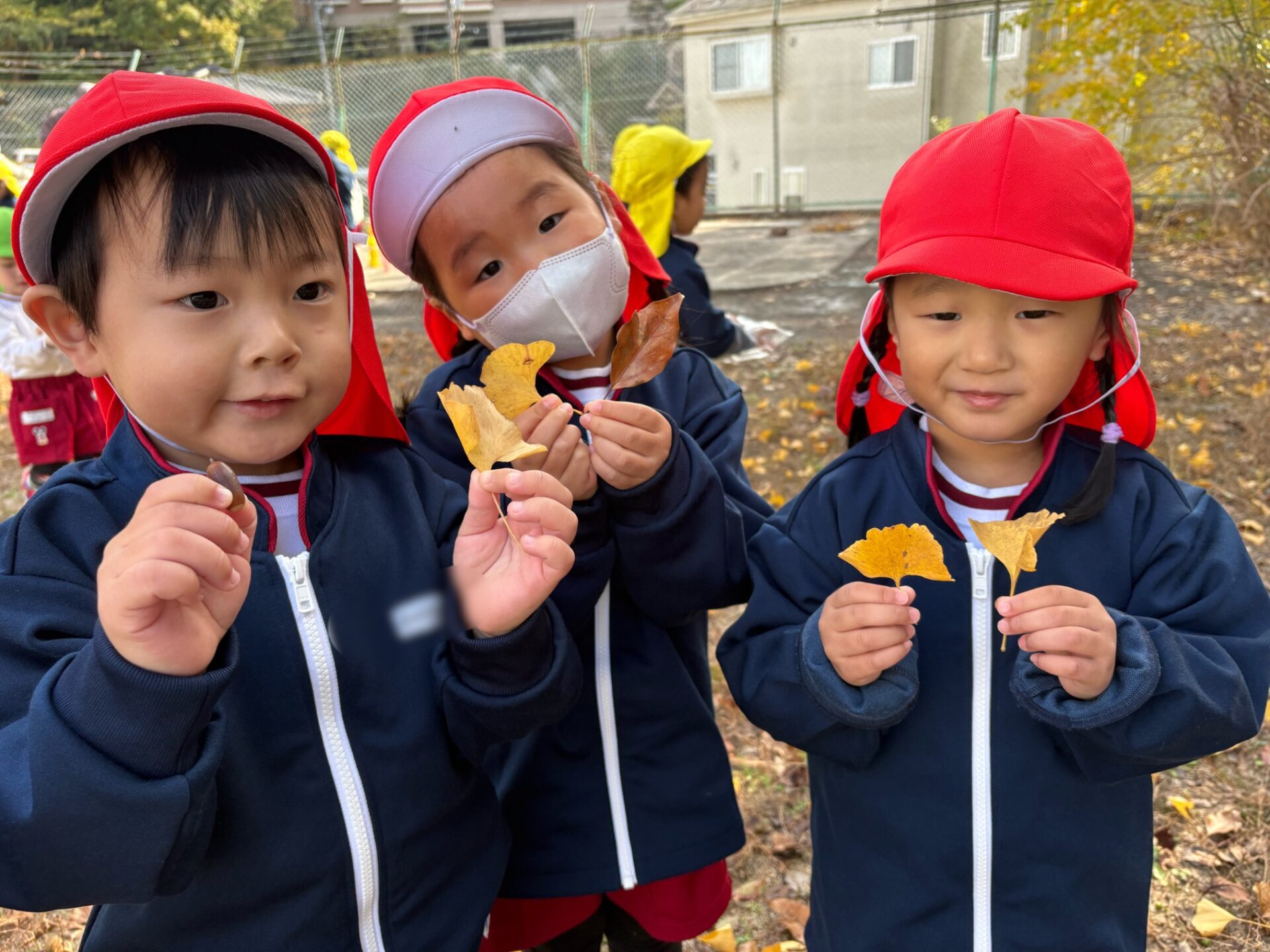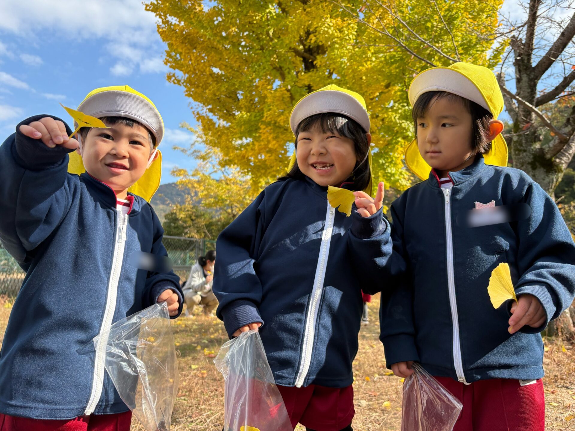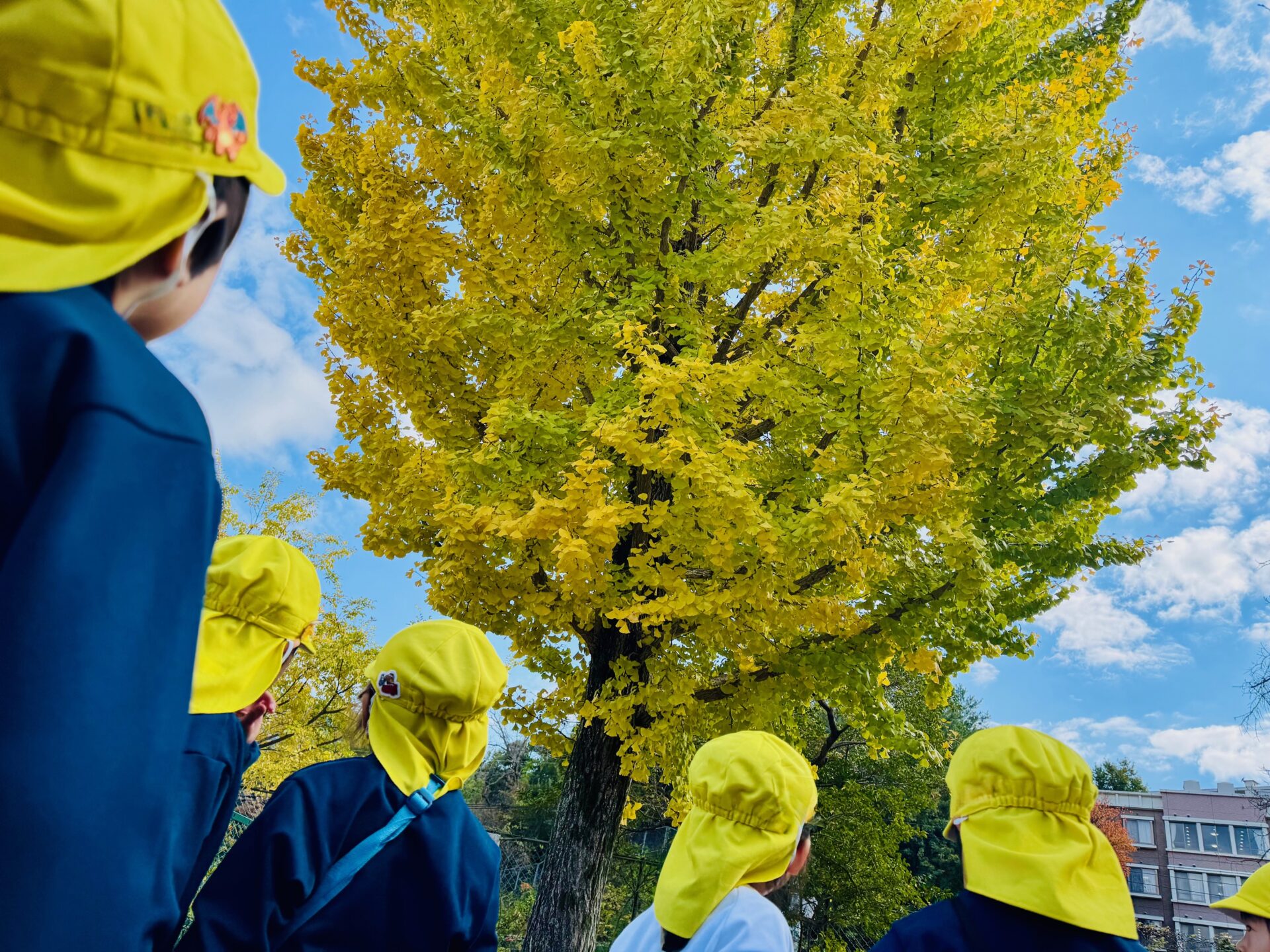 第2園庭に到着して目に飛び込んできたのは黄色く色づき始めた立派なイチョウの木。あともう少しで全て黄色になりそうです。「わあ、すごいね~」と見上げる園児たち。「全部黄色になったら、その後は葉っぱが落ちてきて、この辺りが黄色いじゅうたんを敷いたみたいになるんだよ」と保育教諭に教えてもらい「へえー、見て見たい!」とさらに期待を高めていました。