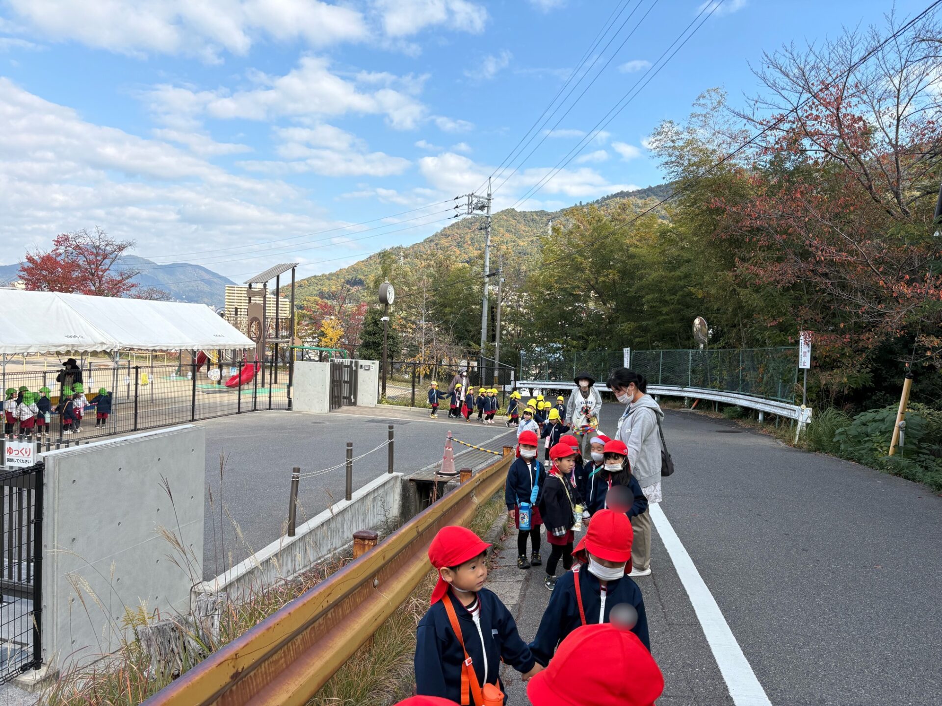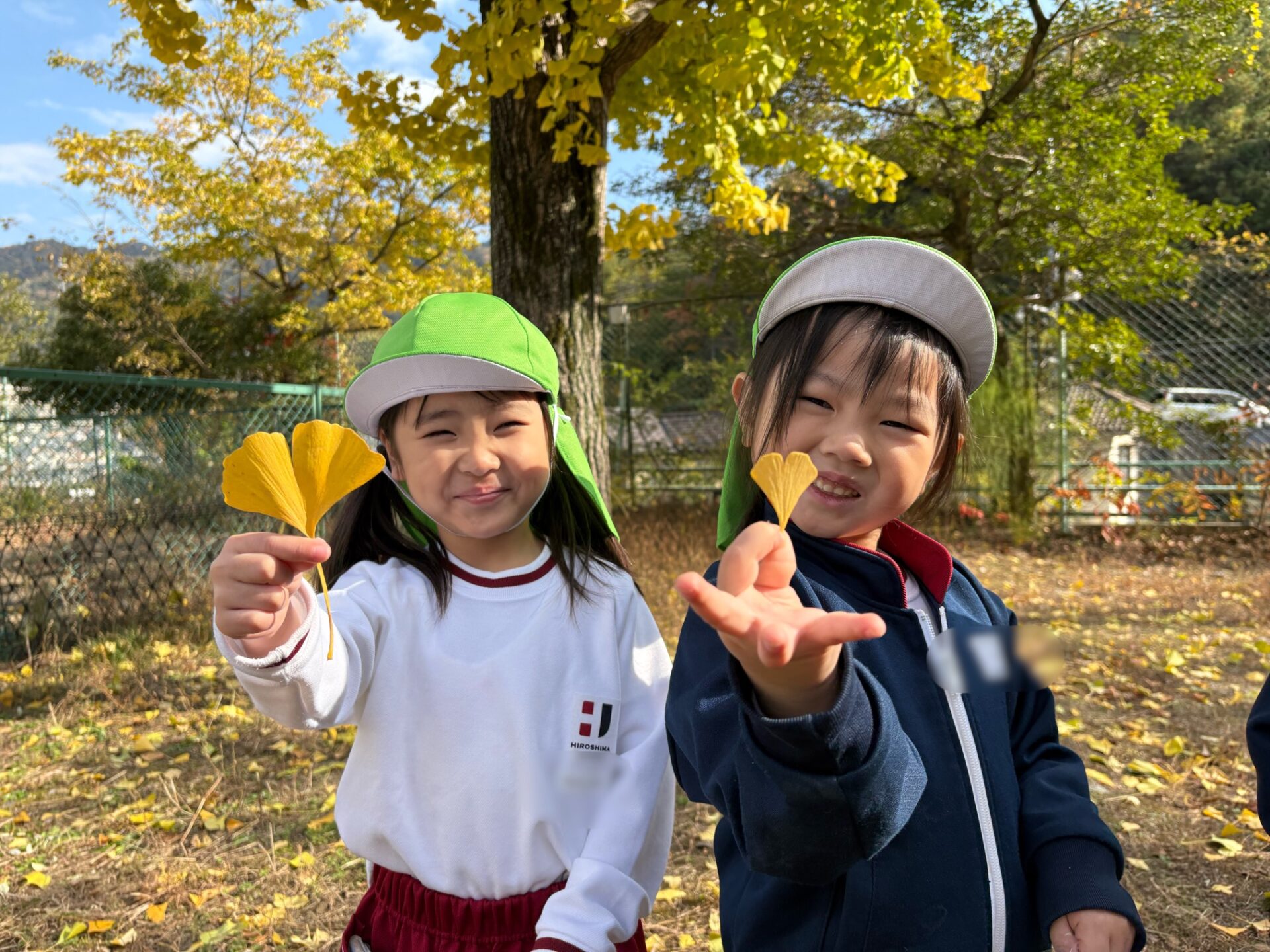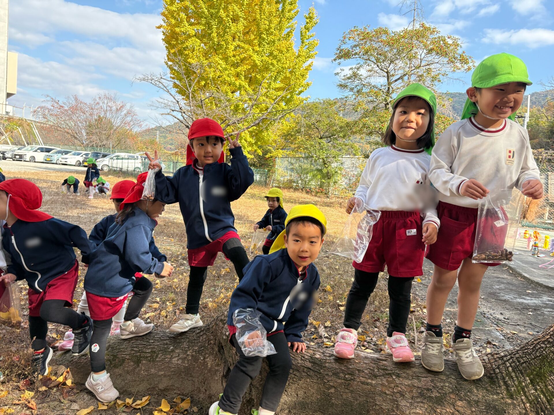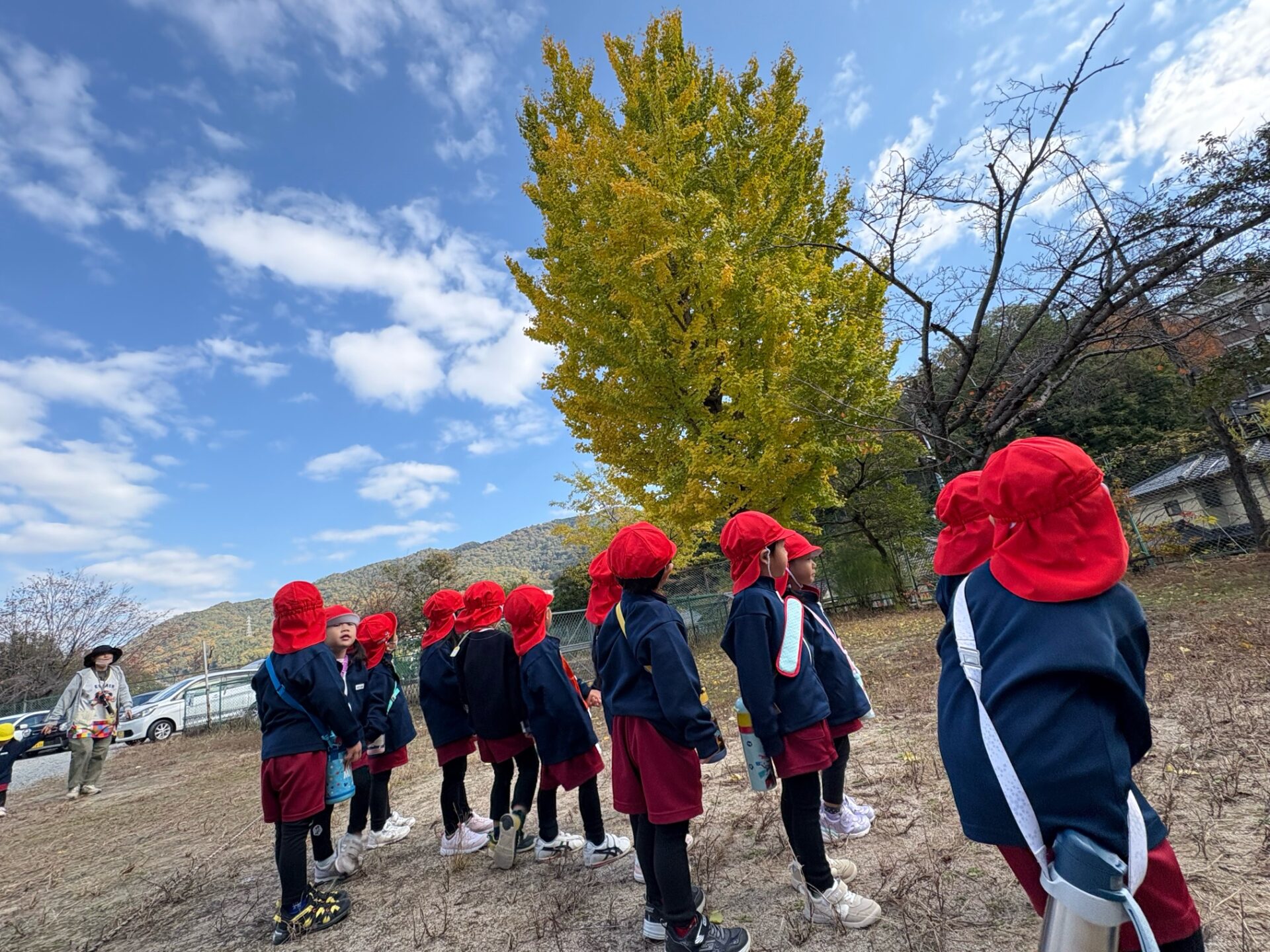 第2園庭に到着して目に飛び込んできたのは黄色く色づき始めた立派なイチョウの木。あともう少しで全て黄色になりそうです。「わあ、すごいね~」と見上げる園児たち。「全部黄色になったら、その後は葉っぱが落ちてきて、この辺りが黄色いじゅうたんを敷いたみたいになるんだよ」と保育教諭に教えてもらい「へえー、見て見たい!」とさらに期待を高めていました。