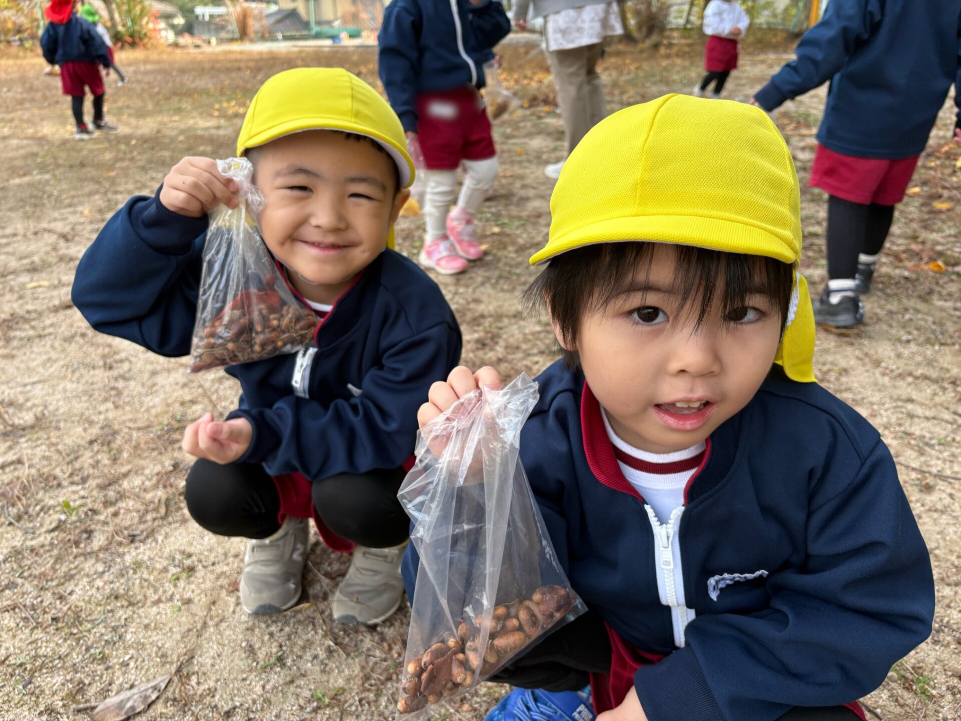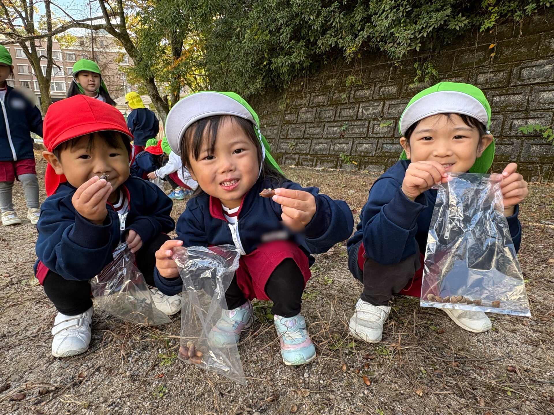 その後はそれぞれに『お宝探し』‼ 「どんぐり見つけた!」「ここにもあるー♪」「大きい葉っぱ見~つけた!」たくさんお宝を発見して秋を満喫した園児たち。「先生、お腹すいたー」「そろそろこども園に帰ろう!」「今日の給食なあに?」「あったかシチューだよ」「やったー!」帰りも楽しい散歩になりました。