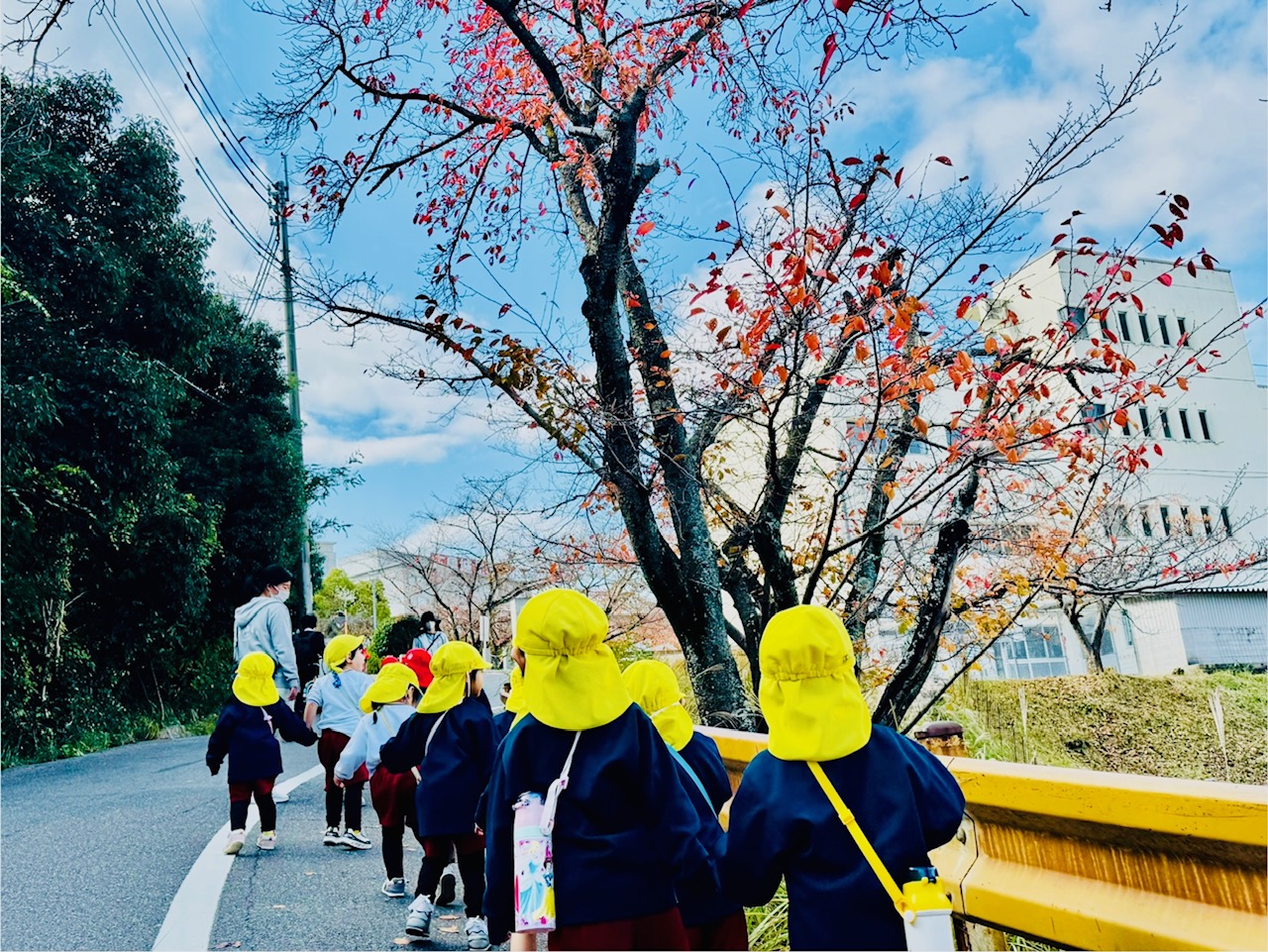 第2園庭に散歩に行きました。今日も友達と一緒に手をつなぎ、交通ルールを守りながら歩くことができました。到着するまでの途中の風景の中にも、おいしそうに実った柿やきれいな色の落ち葉などを発見して、「あ、あれ見て!」「きれいだね!」と友達や保育教諭に伝える様子が見られました。
