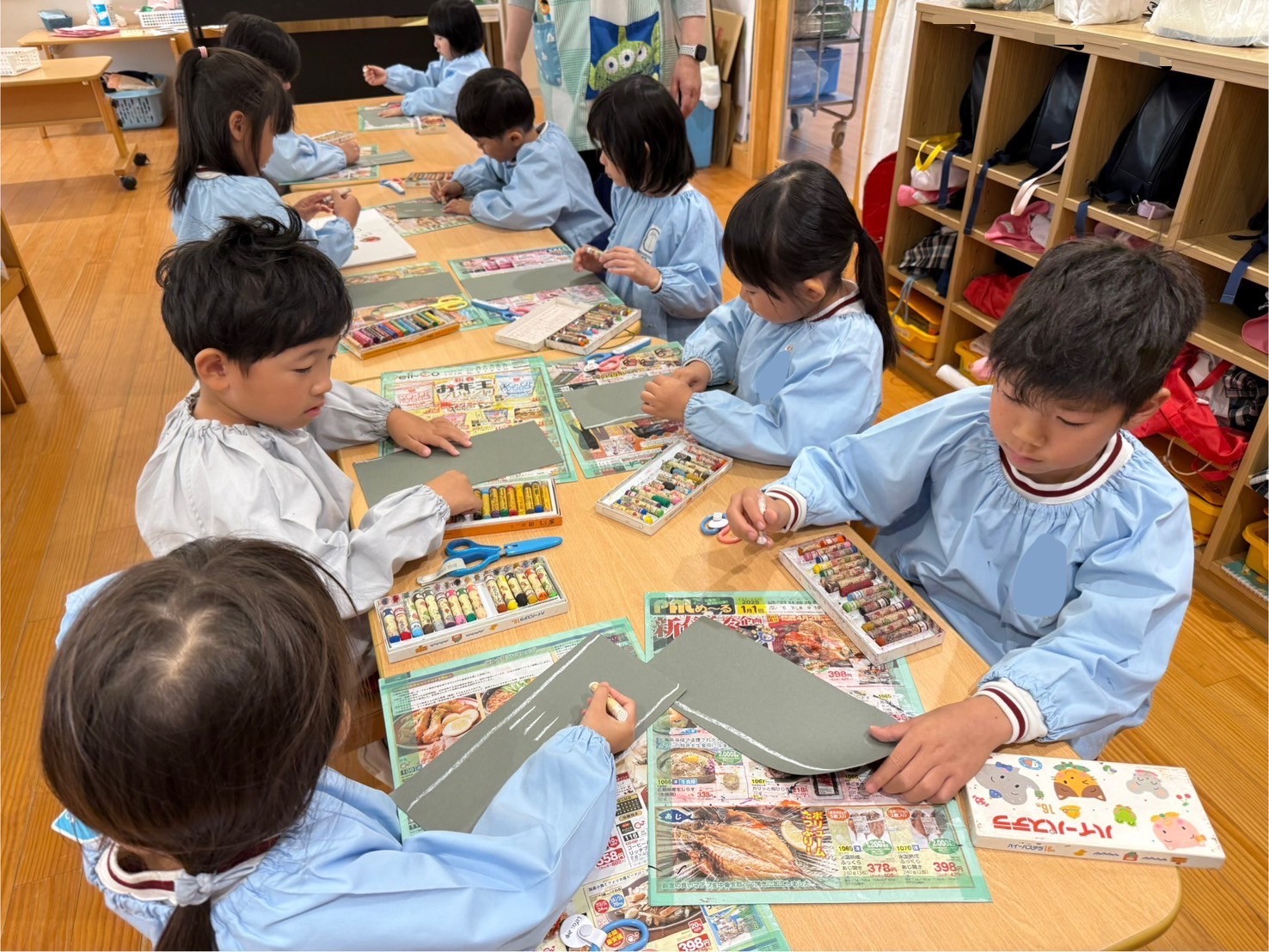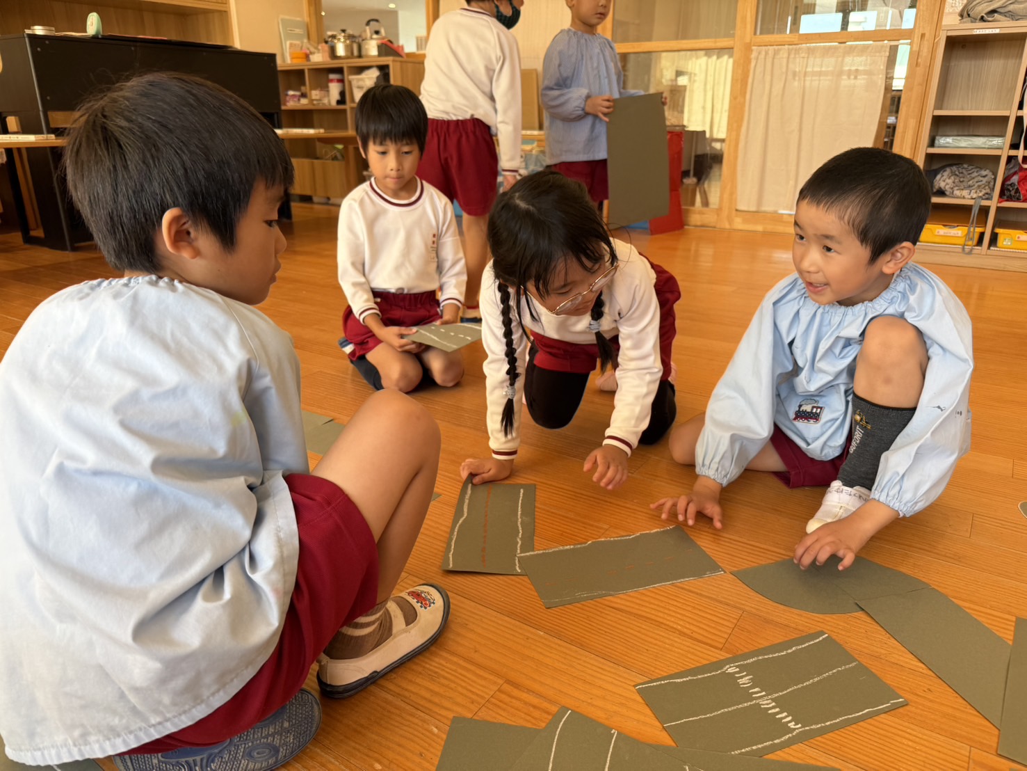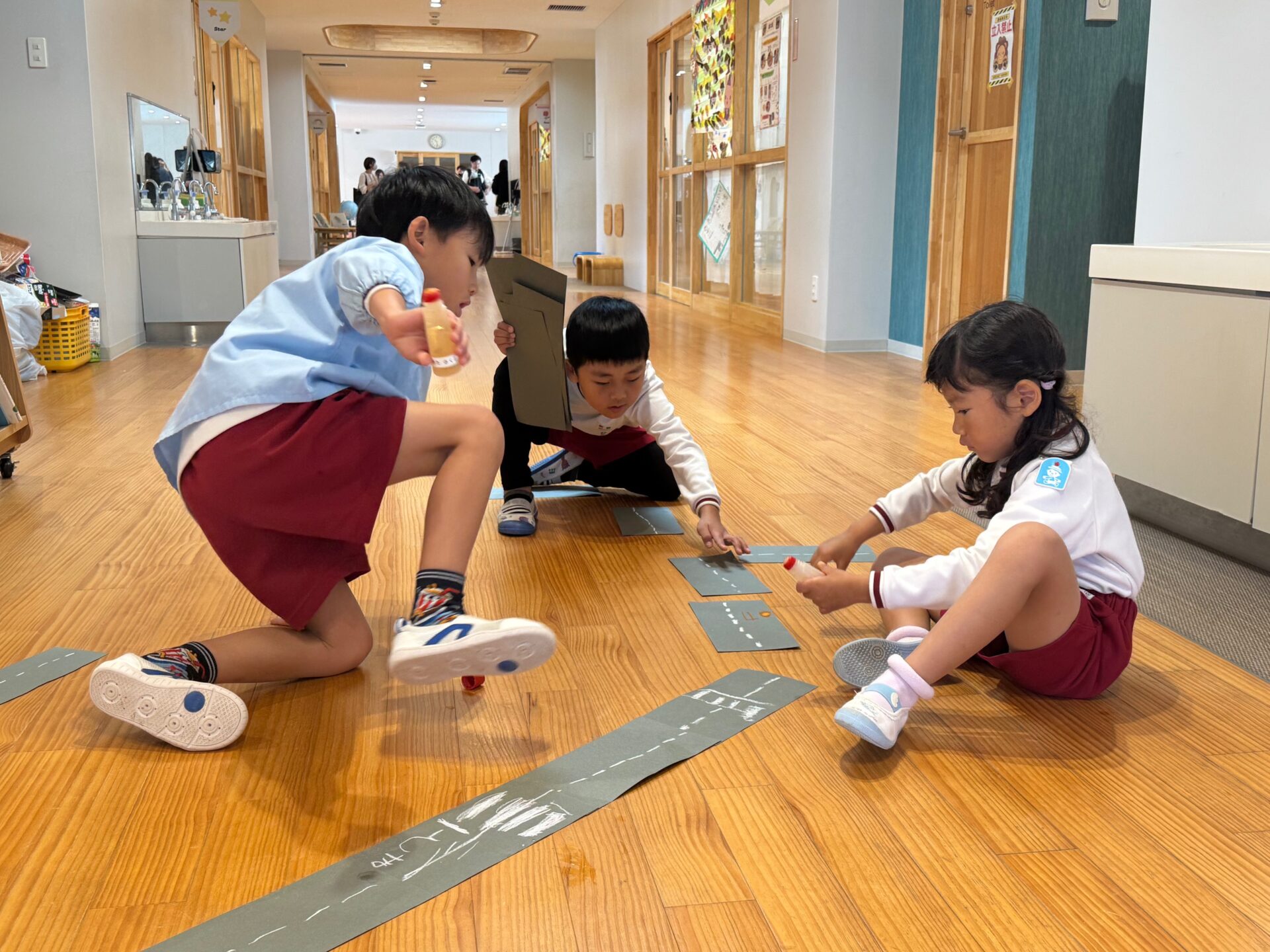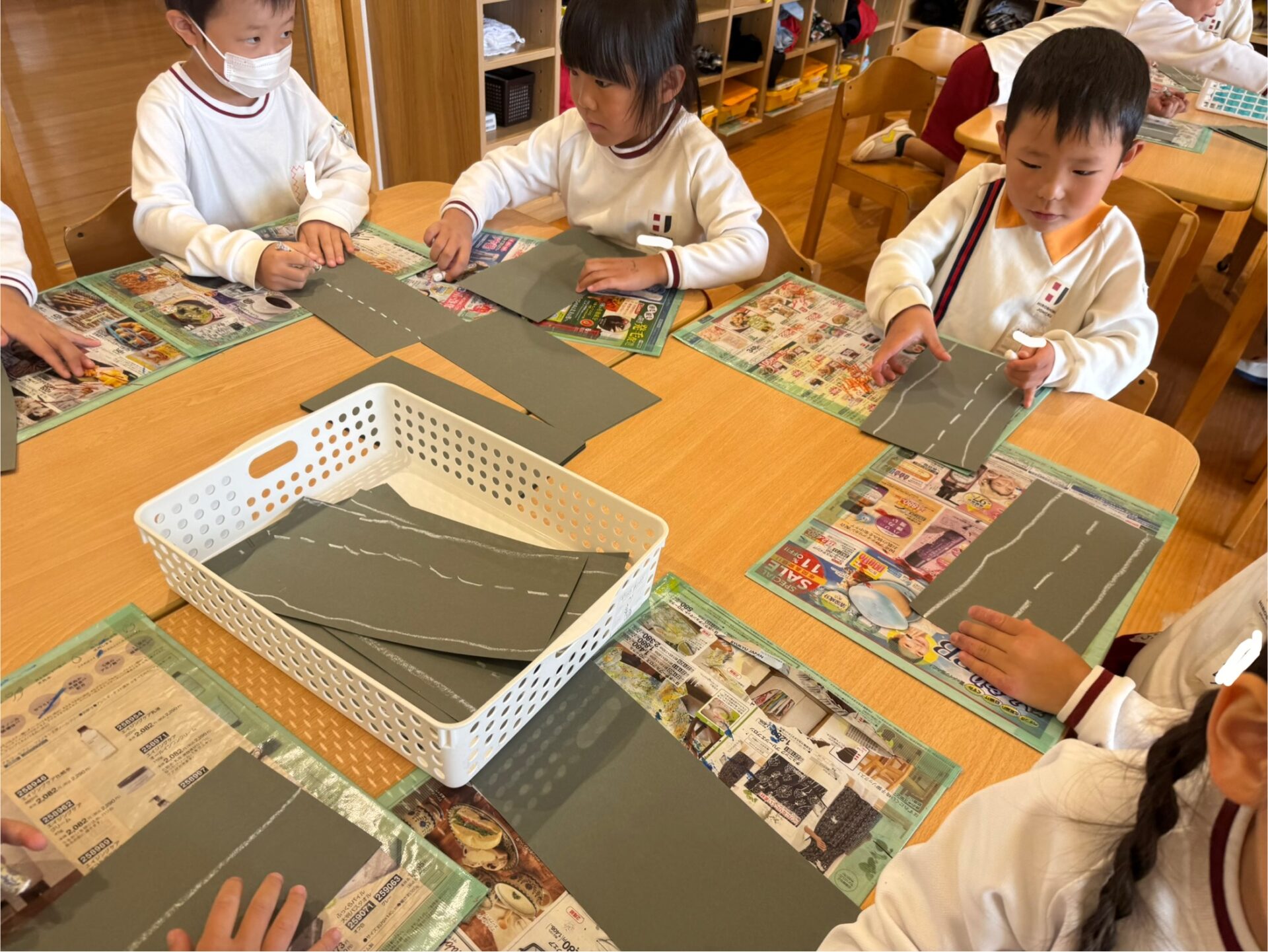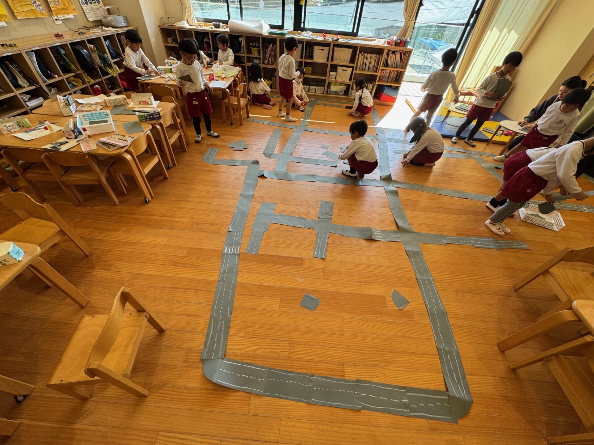 「カーブを作りたい!」という声があがると、ある園児が画用紙をカーブして切る方法を発見。その工夫が仲間に広まり、交差点や曲がり角も次々と生まれました。