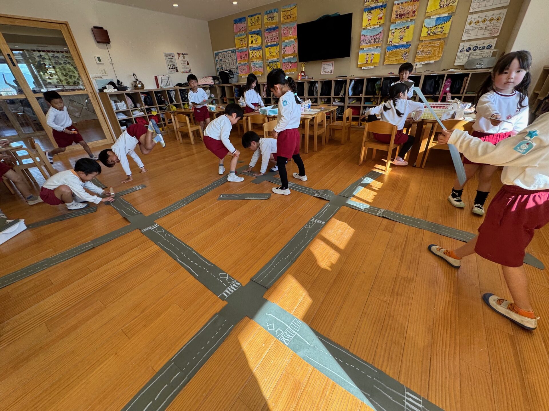 最後は、みんなで作った道路の一部分を大きな紙に貼り、作品として完成させました。さあ、この道路は参観日の時にも登場します。お楽しみに!