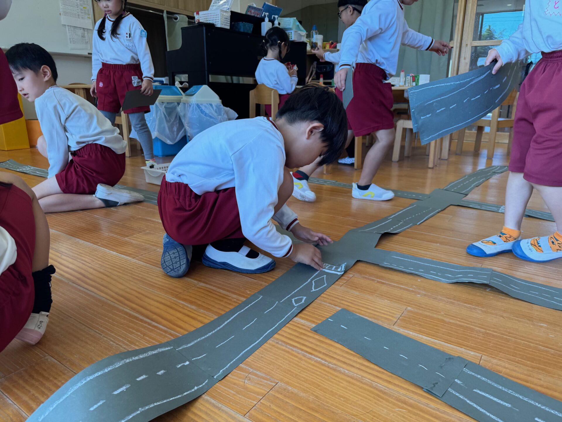 交通公園やお散歩など、日頃から目にしている道路をイメージしながら、灰色の画用紙に横断歩道や菱形マーク、歩道と車道を分ける白線、中央線、停止線などを描き、みんなで長い道路を作りました。