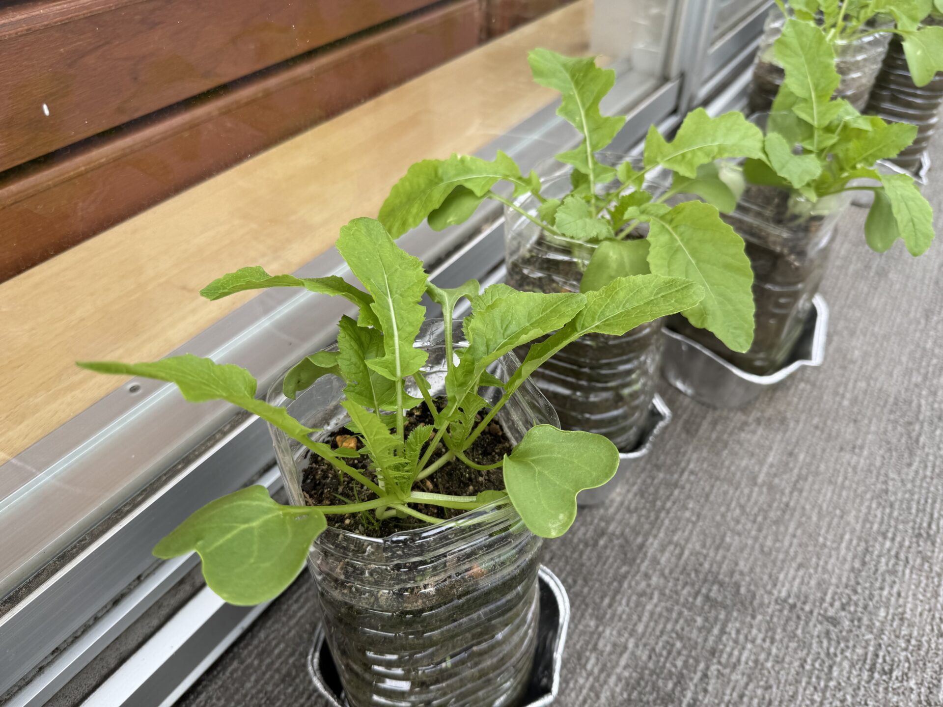 ペットボトルに蒔いた5つの種が発芽して、しばらくして小さな芽が顔を出し、元気に育ち始めました。