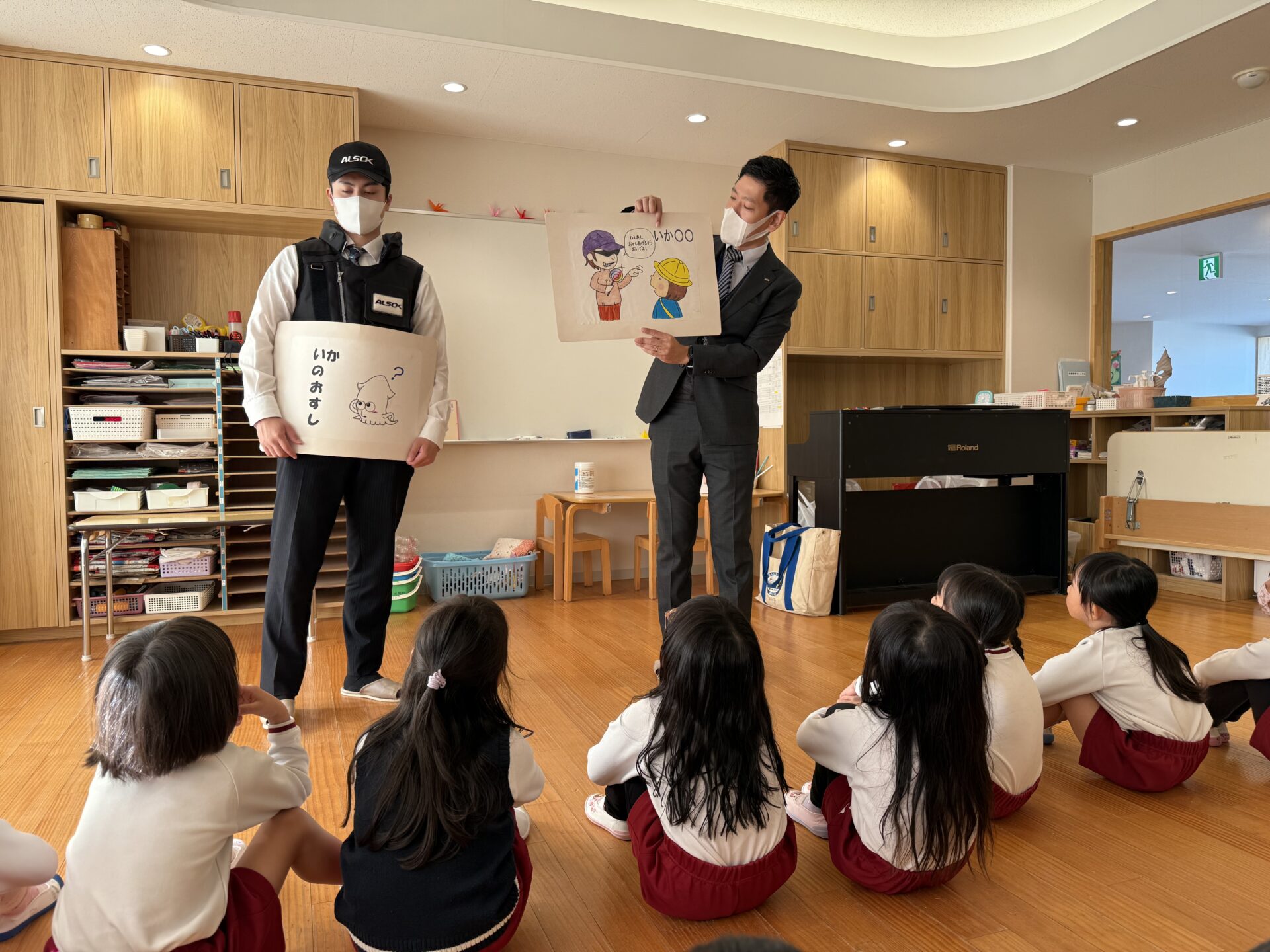 小学校就学にむけて、ALSOKの講師から防犯教室を実施していただきました。初めに、『防犯ブザー』を代表の園児が鳴らしてみると…