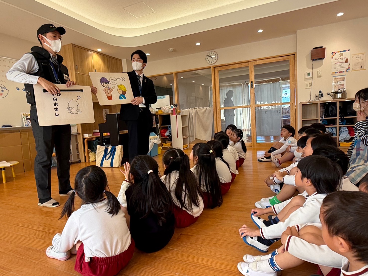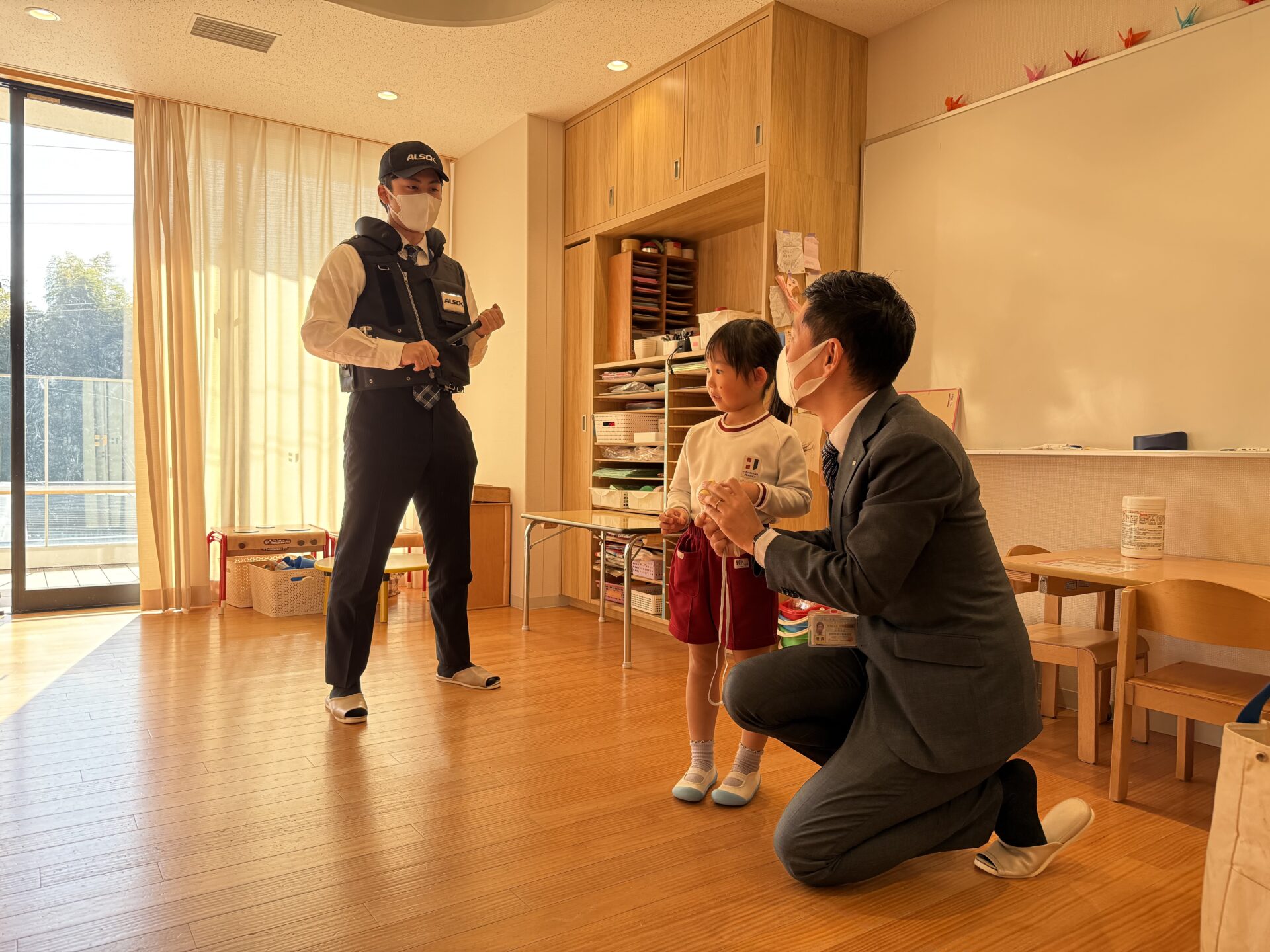 小学校就学にむけて、ALSOKの講師から防犯教室を実施していただきました。初めに、『防犯ブザー』を代表の園児が鳴らしてみると…