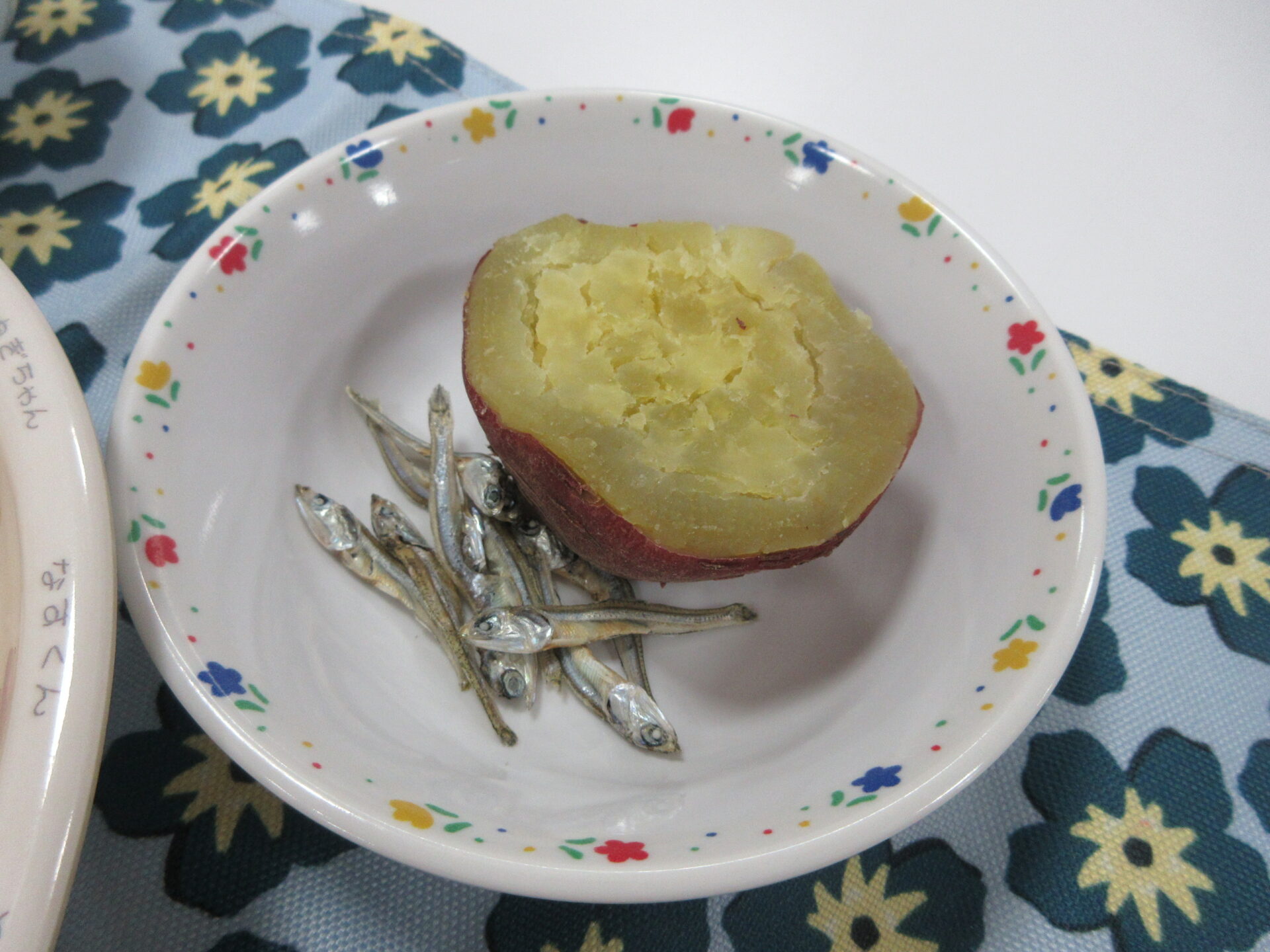 油揚げたっぷりのきつねうどんとのりの風味のチョレギサラダを食べました。さつま芋のふかし芋は甘くて美味しかったです。