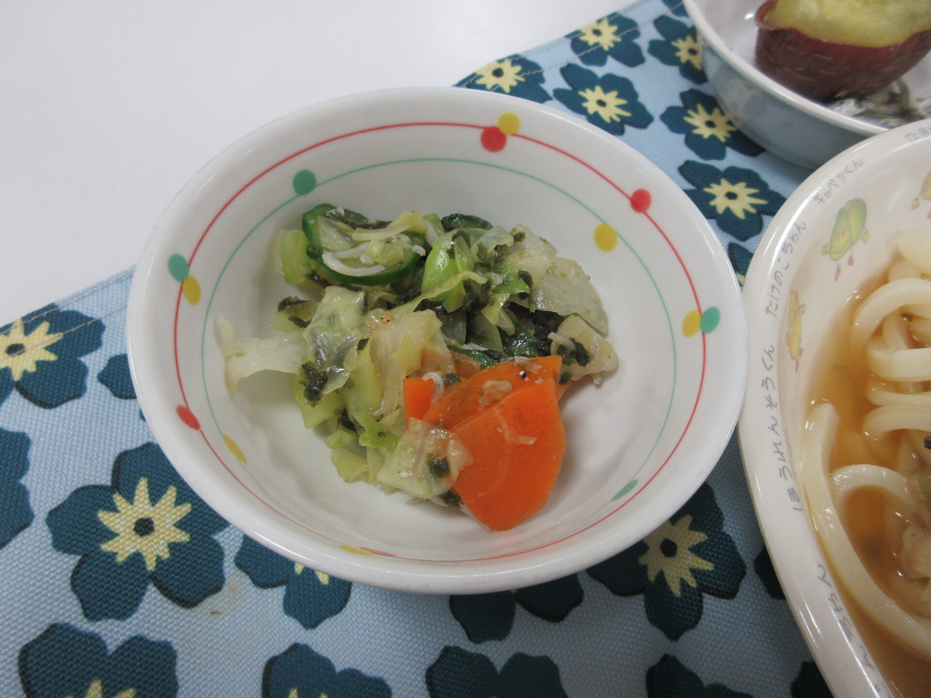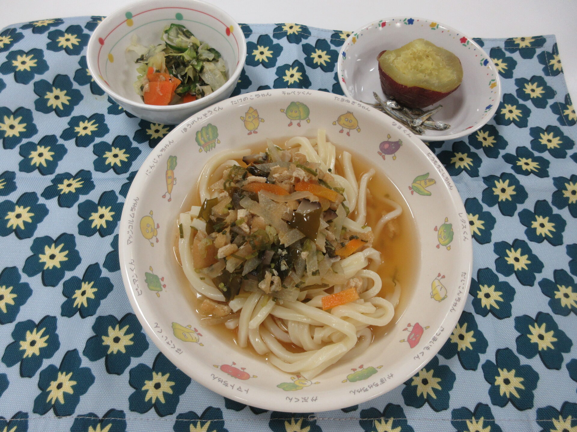 【🦊きつねうどん チョレギサラダ 🍠ふかしさつま芋 食べる煮干し】