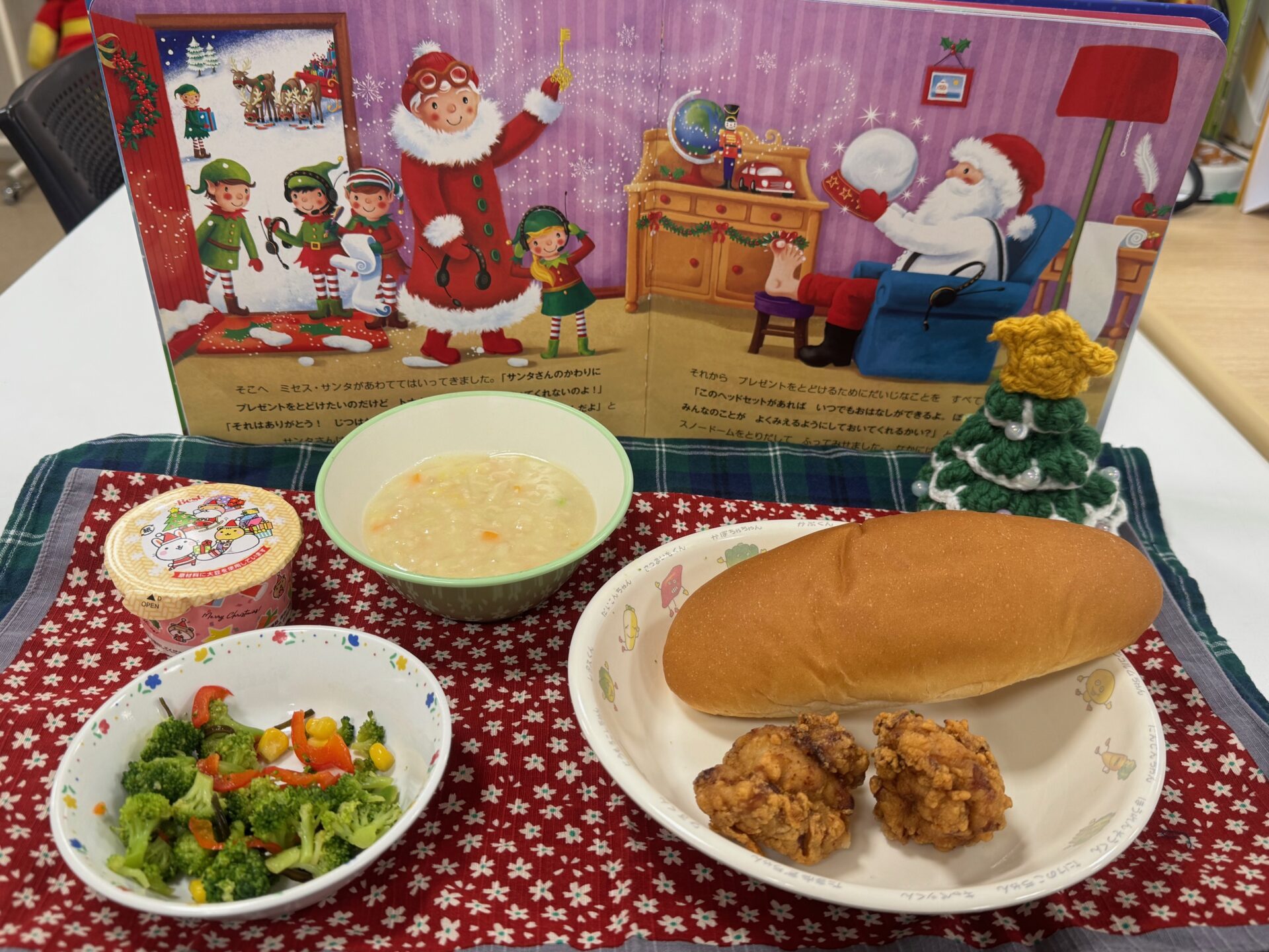 園では一足早いクリスマスでした。🎅サンタさんからのプレゼントや、美味しい唐揚げやクリスマスカラーのおかずに笑顔の絶えない楽しい一日になりました。メリークリスマス🎄