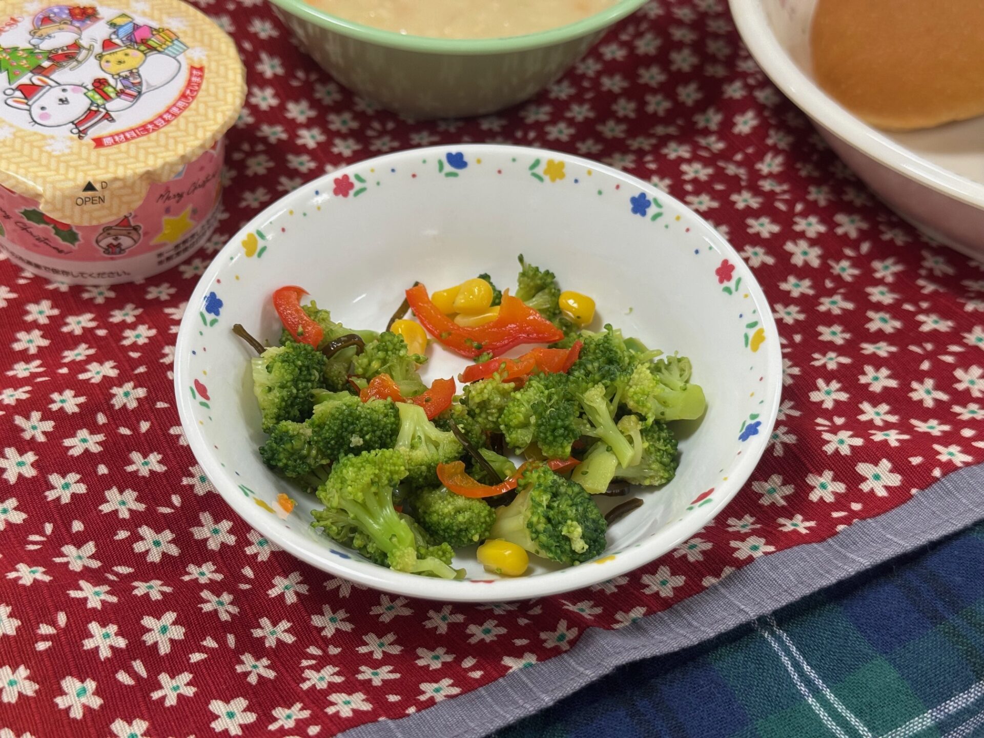 【コッペパン🥖 豆乳シチュー 鶏唐揚げ 🥦ブロッコリーの塩昆布和え クリスマス🍓イチゴプリン🍮】