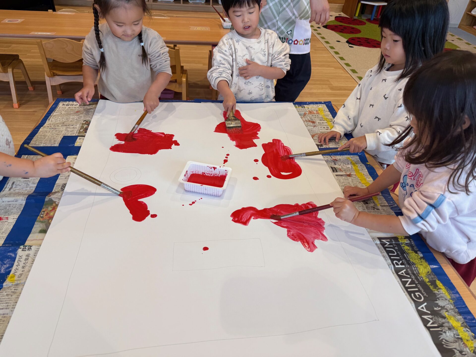 絵本の『とんとんとん』のお話を参考に、子どもたちが遊びや生活の中で楽しんでいることを発表に織り交ぜました。歌や動き、立つ場所なども少しずつ覚えて「やってみよう」「やってみたい」「頑張ろう!」という気持ちを大切に練習してきました。発表会に使用するドアも子どもたちが色を塗って作り上げました。最後の練習を終えてみんなやる気満々です!
