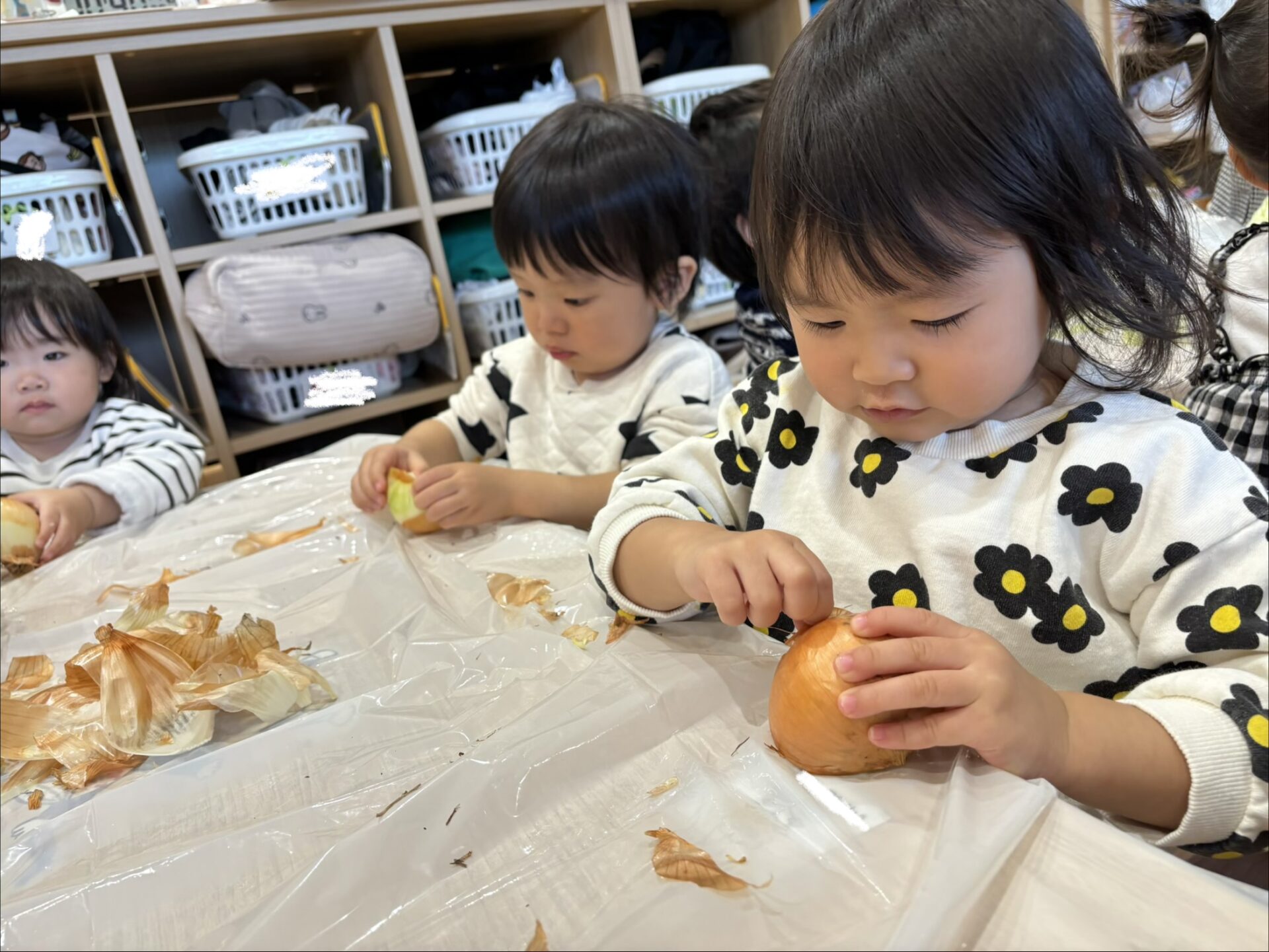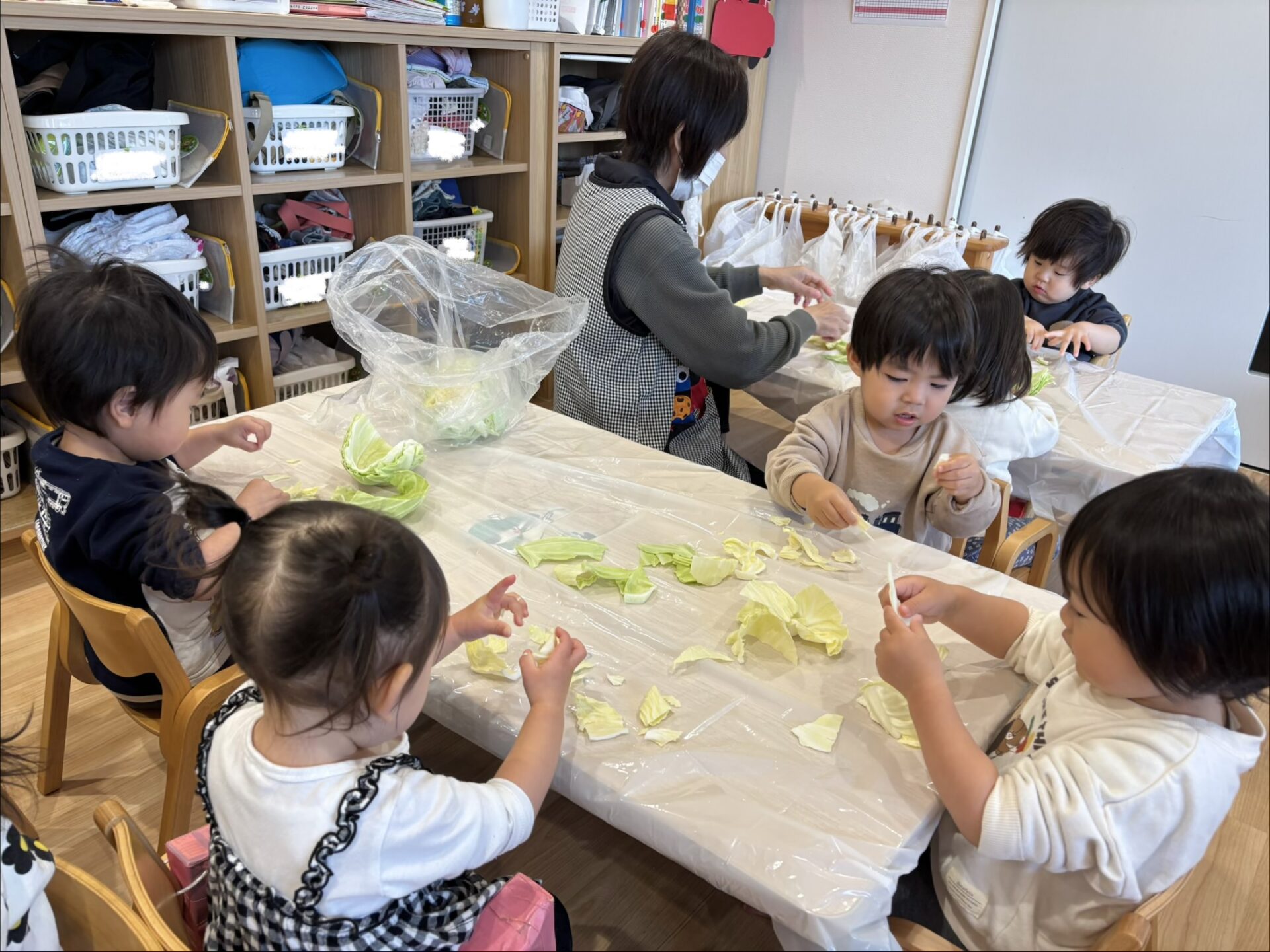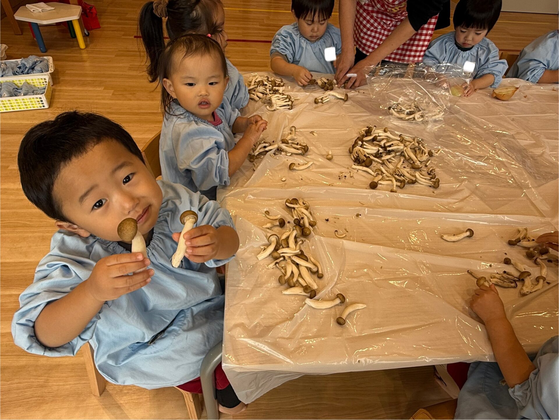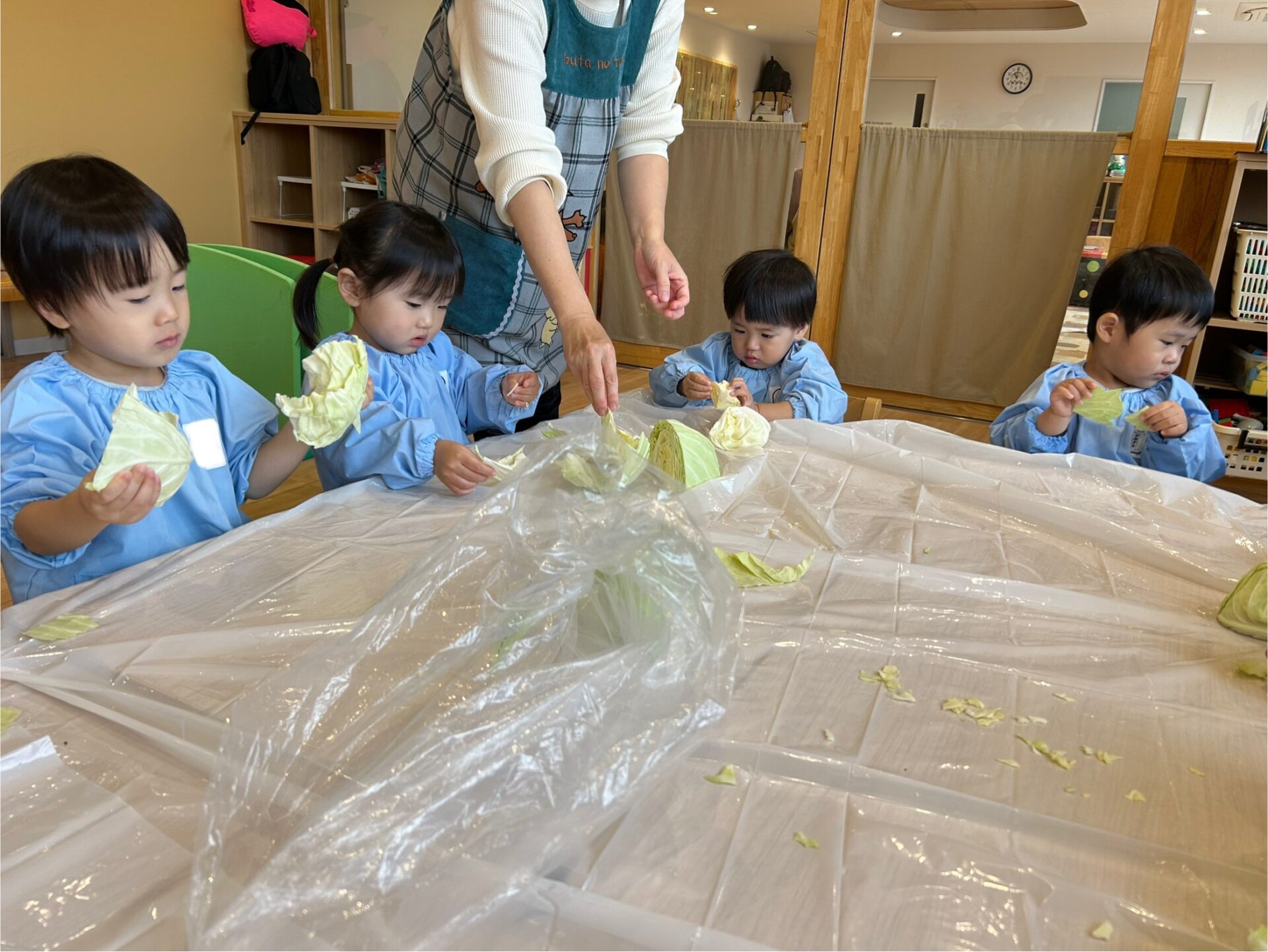 実は昨日、子どもたちはしめじほぐし、キャベツちぎり、玉ねぎの皮むきに挑戦し、給食の先生のお手伝いをしていました!