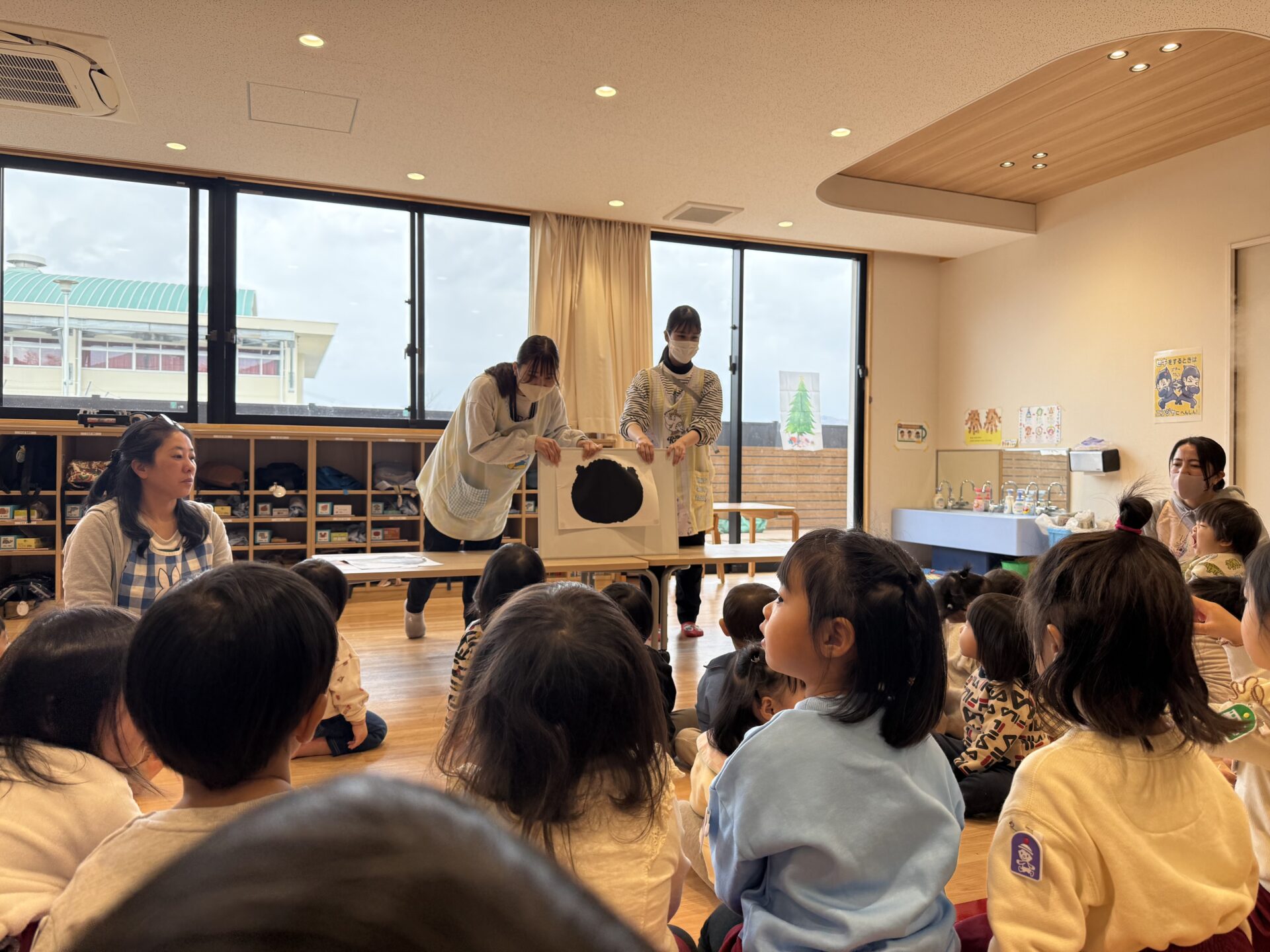 はじめに「やさいのうた」を元気に歌い、玉ねぎ🧅・キャベツ🥬・しめじ🍄のシルエットクイズに挑戦!