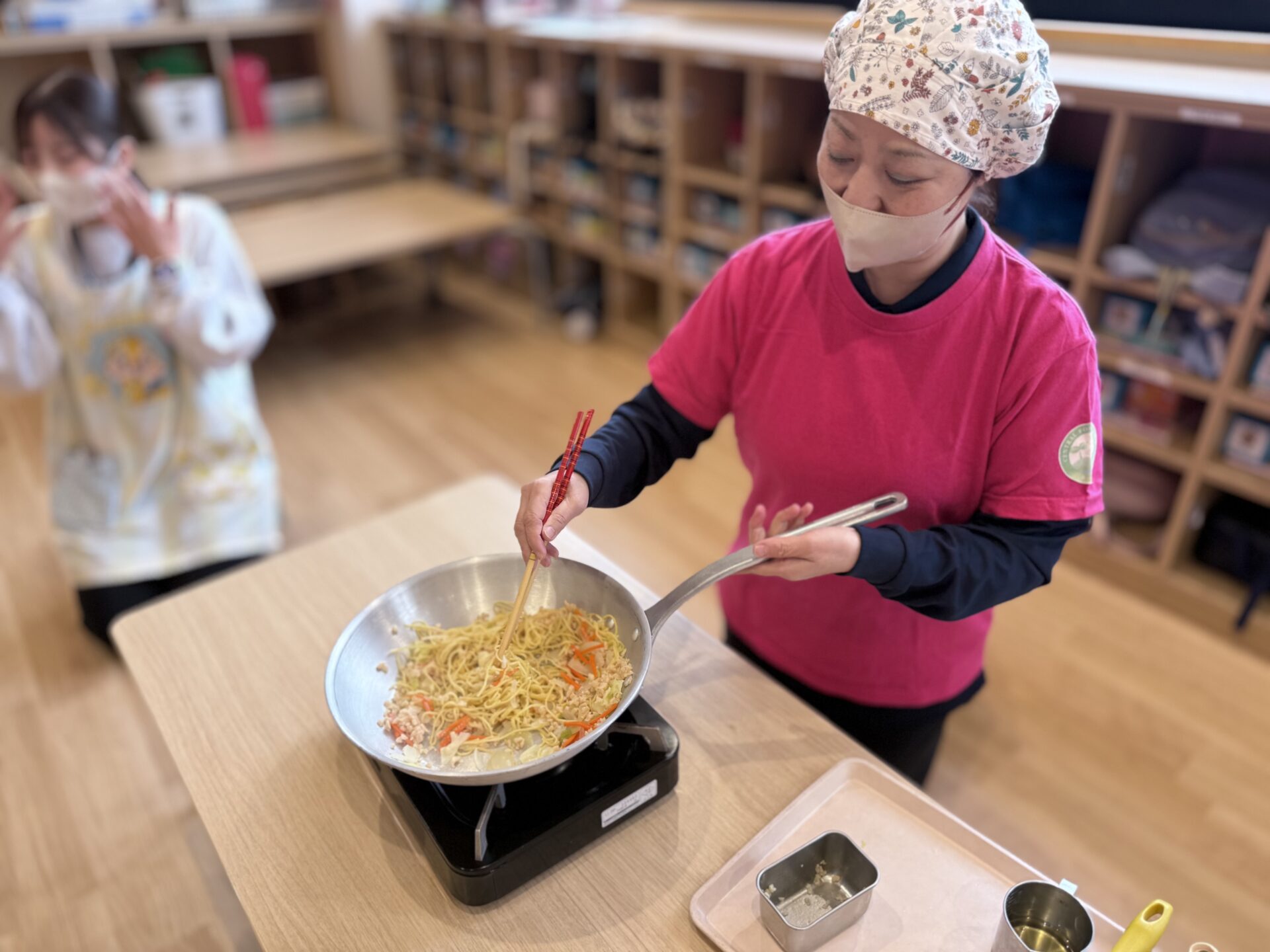 小さな手で準備したお野菜を、今日は目の前で給食先生がジュージューと炒めて焼きそばに!