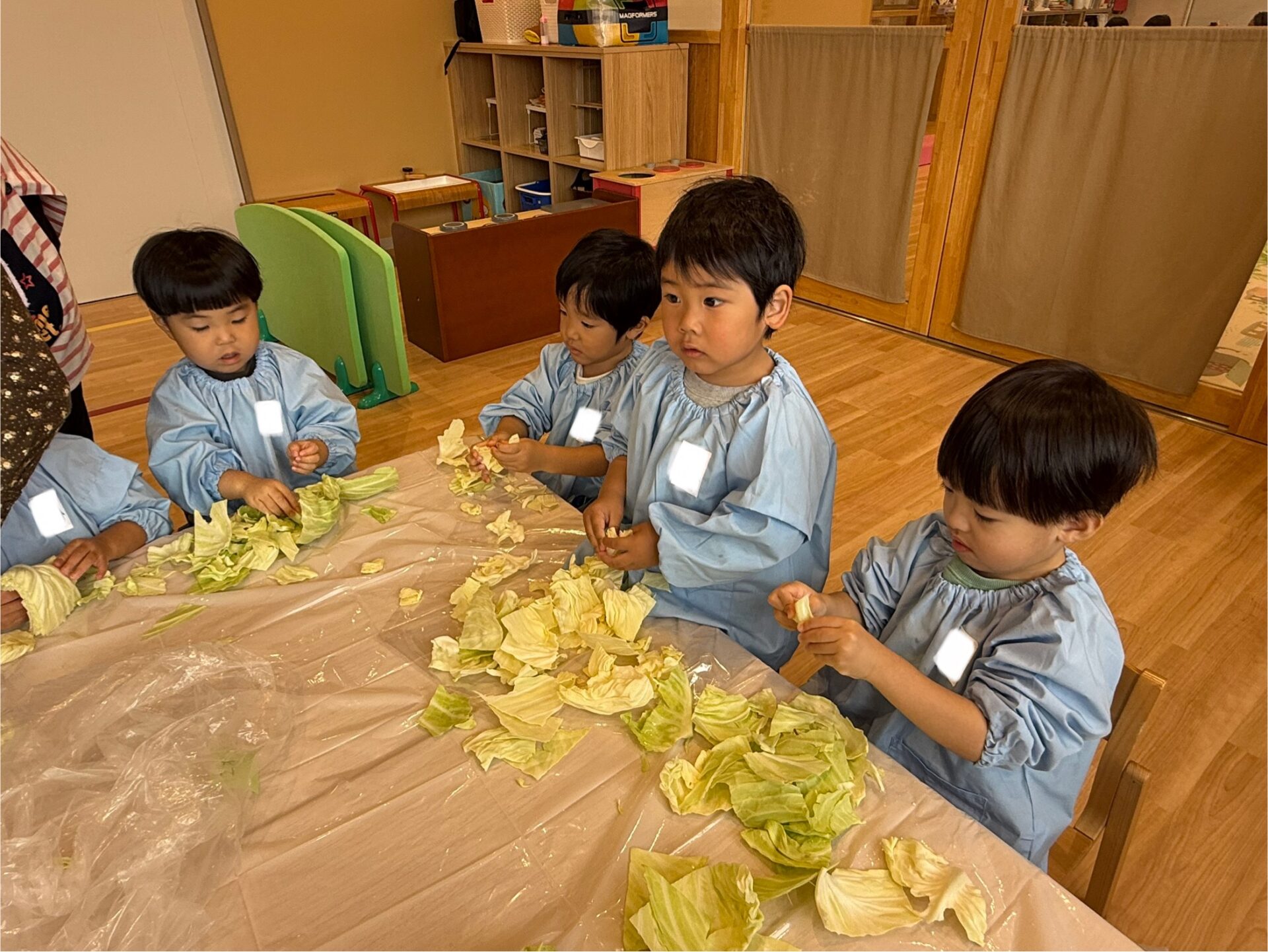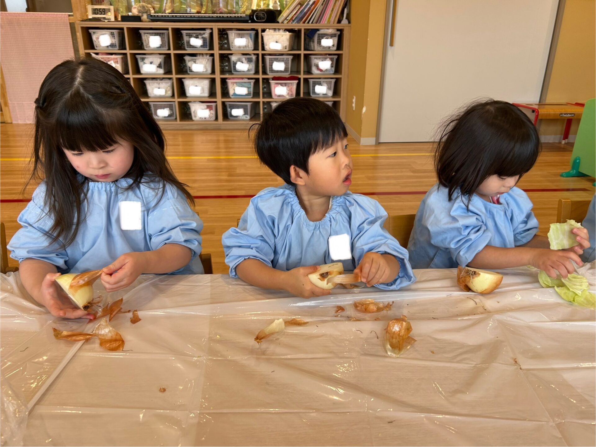 実は昨日、子どもたちはしめじほぐし、キャベツちぎり、玉ねぎの皮むきに挑戦し、給食の先生のお手伝いをしていました!