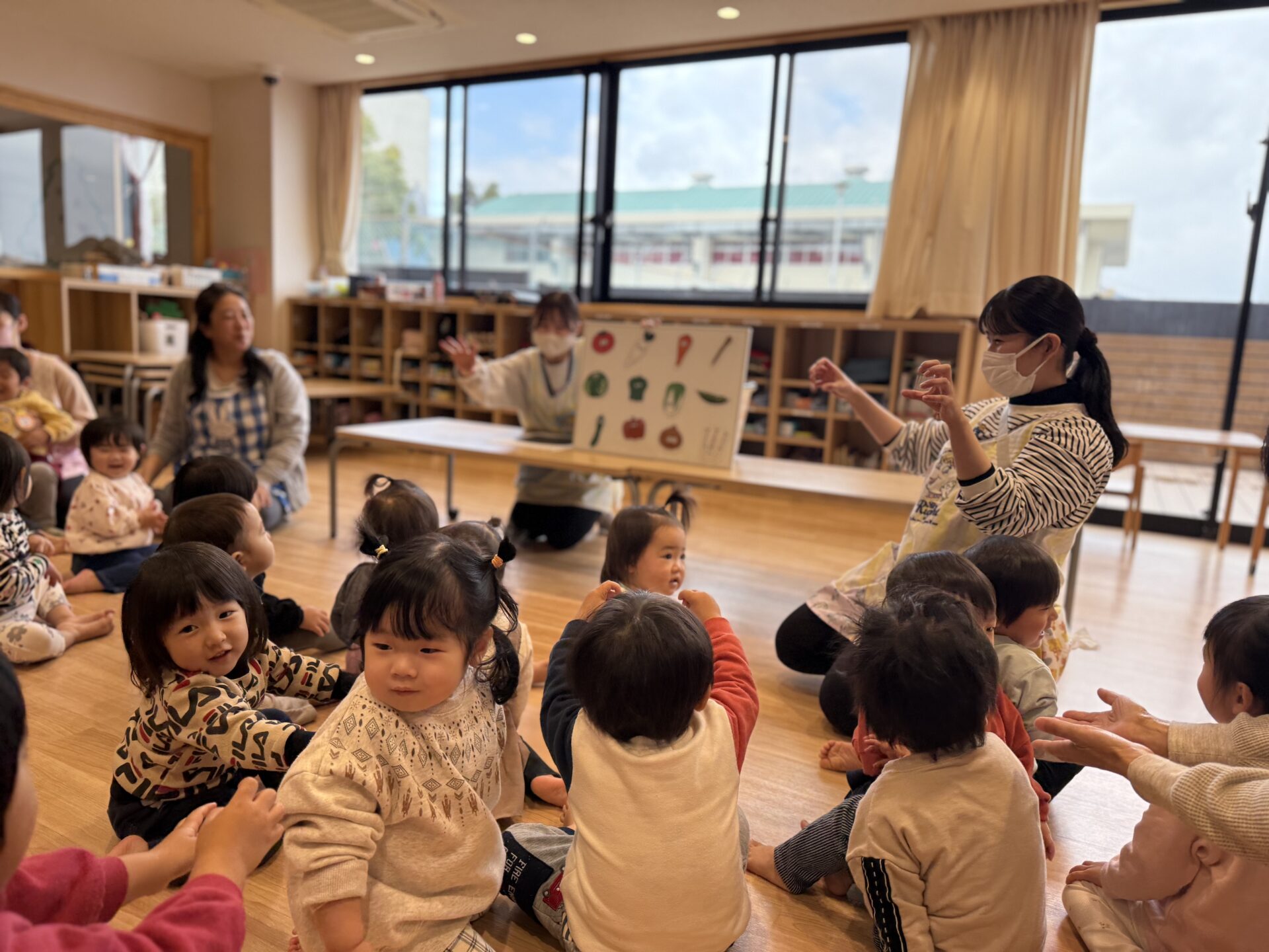 はじめに「やさいのうた」を元気に歌い、玉ねぎ🧅・キャベツ🥬・しめじ🍄のシルエットクイズに挑戦!