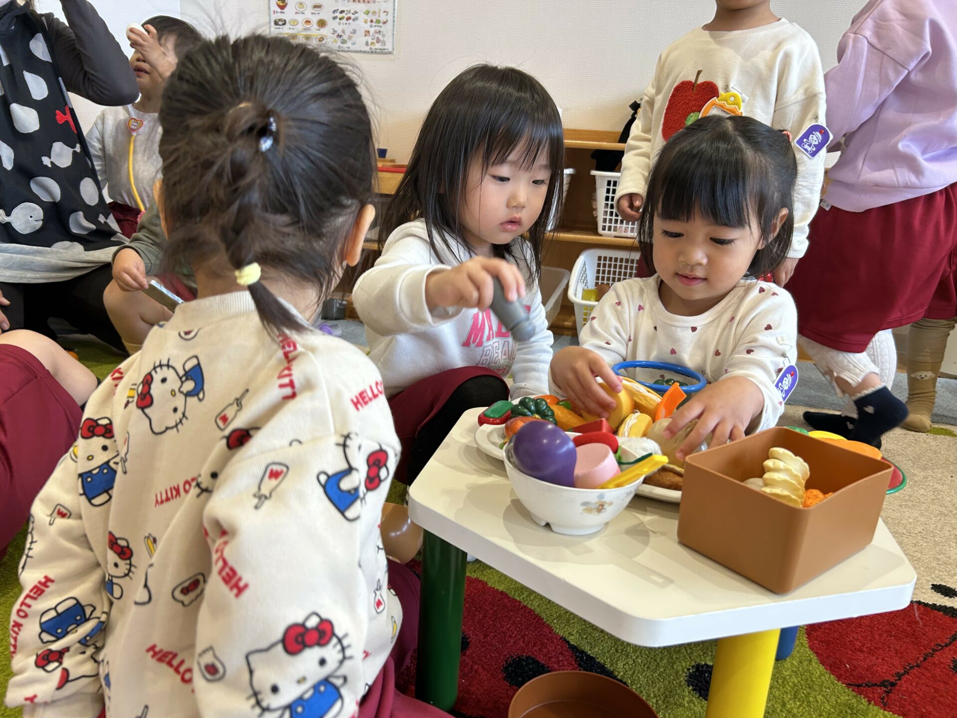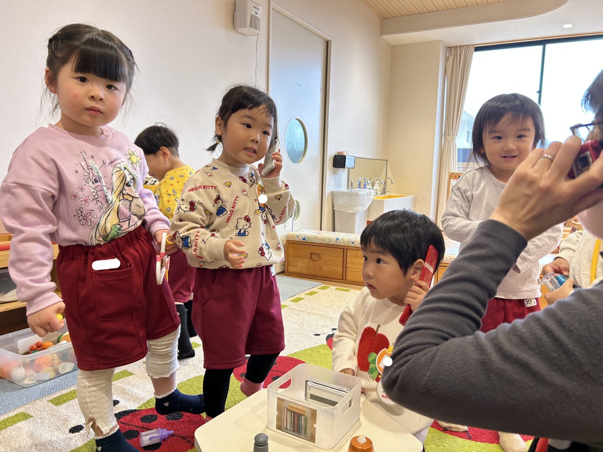 その後はクラスにあるおもちゃでみんなで仲良く遊びました。「一緒に遊ぼう」「一緒に見よう」「手繋ごう」と誘い合っている素敵な姿がたくさん見られました🥰