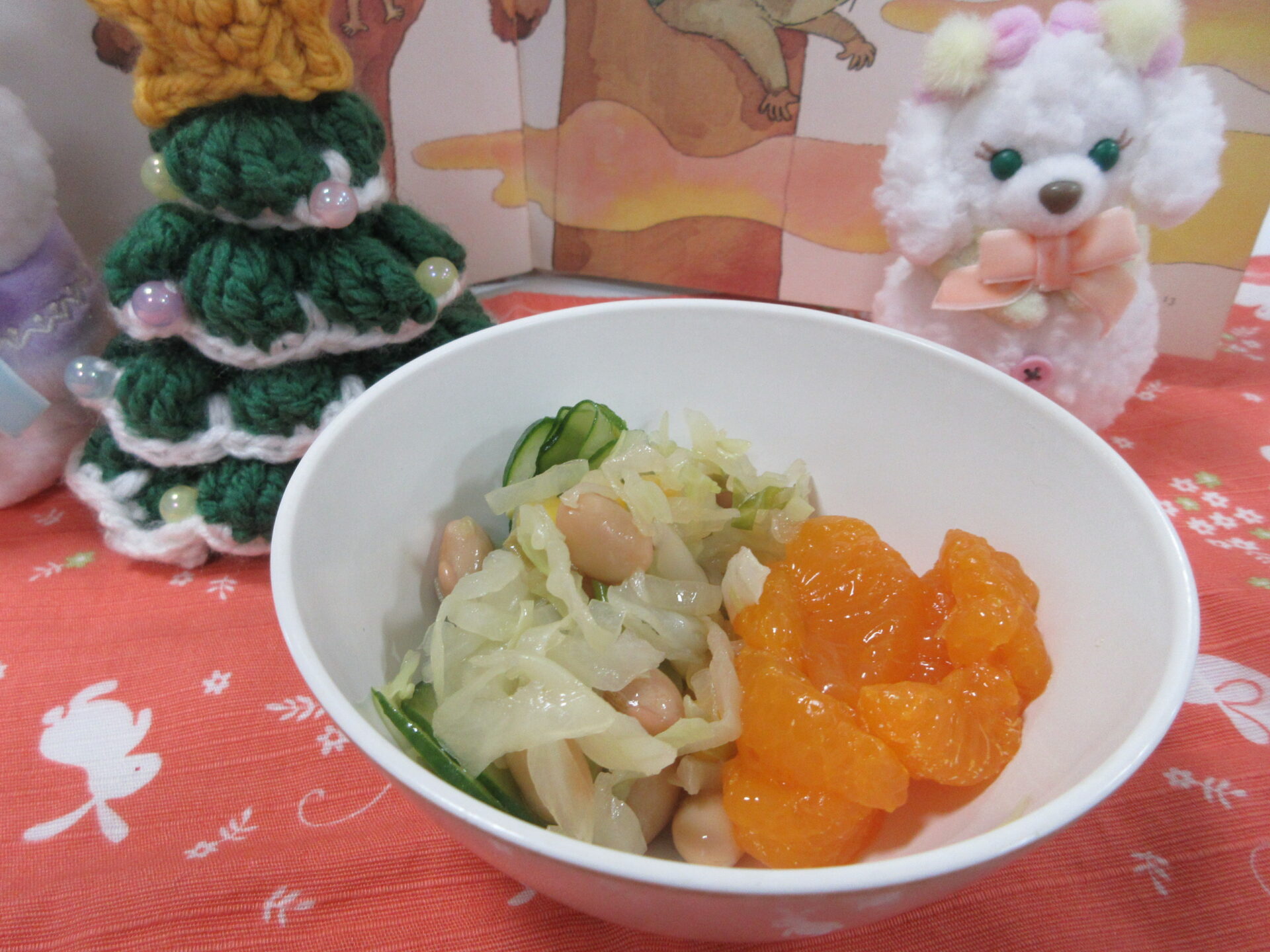 誕生会メニューでした。大きめの鶏唐揚げを口いっぱいにほおばって食べました。豆まめサラダはビタミン豊富でデザートもあり美味しかったです。