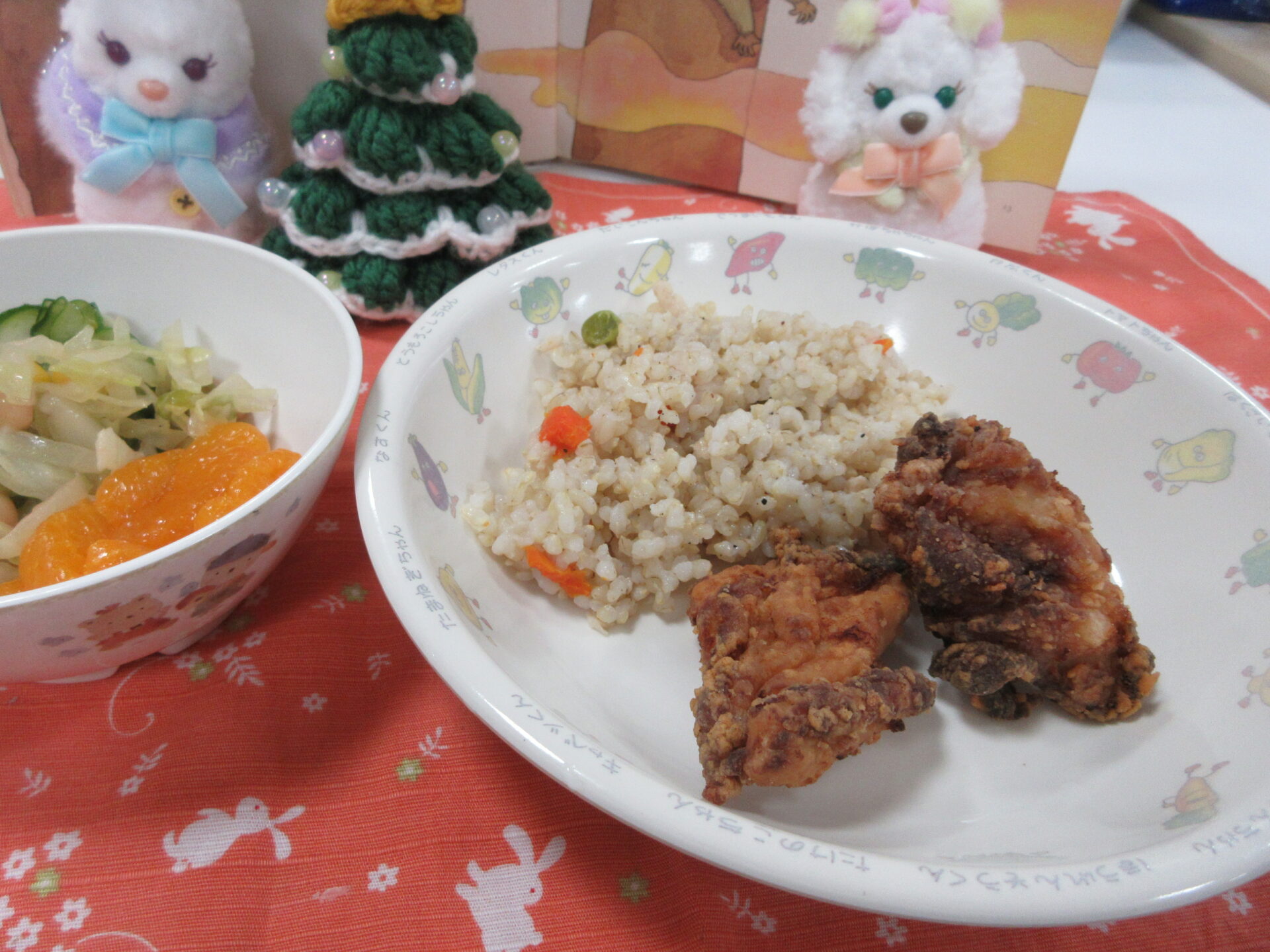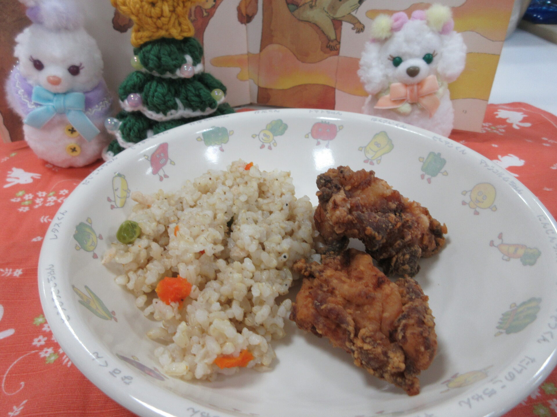 誕生会メニューでした。大きめの鶏唐揚げを口いっぱいにほおばって食べました。豆まめサラダはビタミン豊富でデザートもあり美味しかったです。