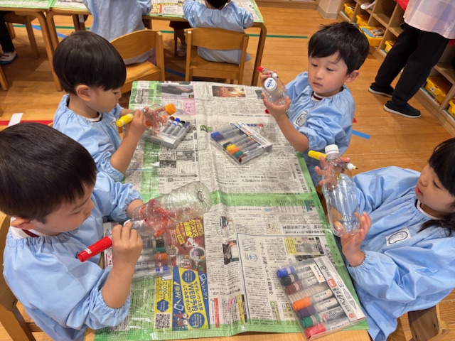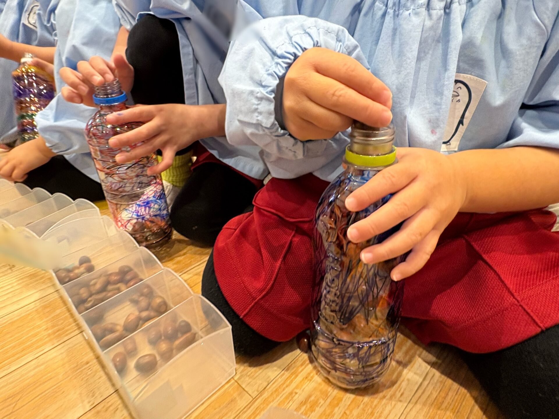散歩に行った時にみんなで拾ったどんぐりで「マラカス」を作りました。好きな大きさや形のペットボトルを選び、油性ペンで絵や模様を描きました。どんぐりと一緒にキラキラスパンコールも入れてできあがり。