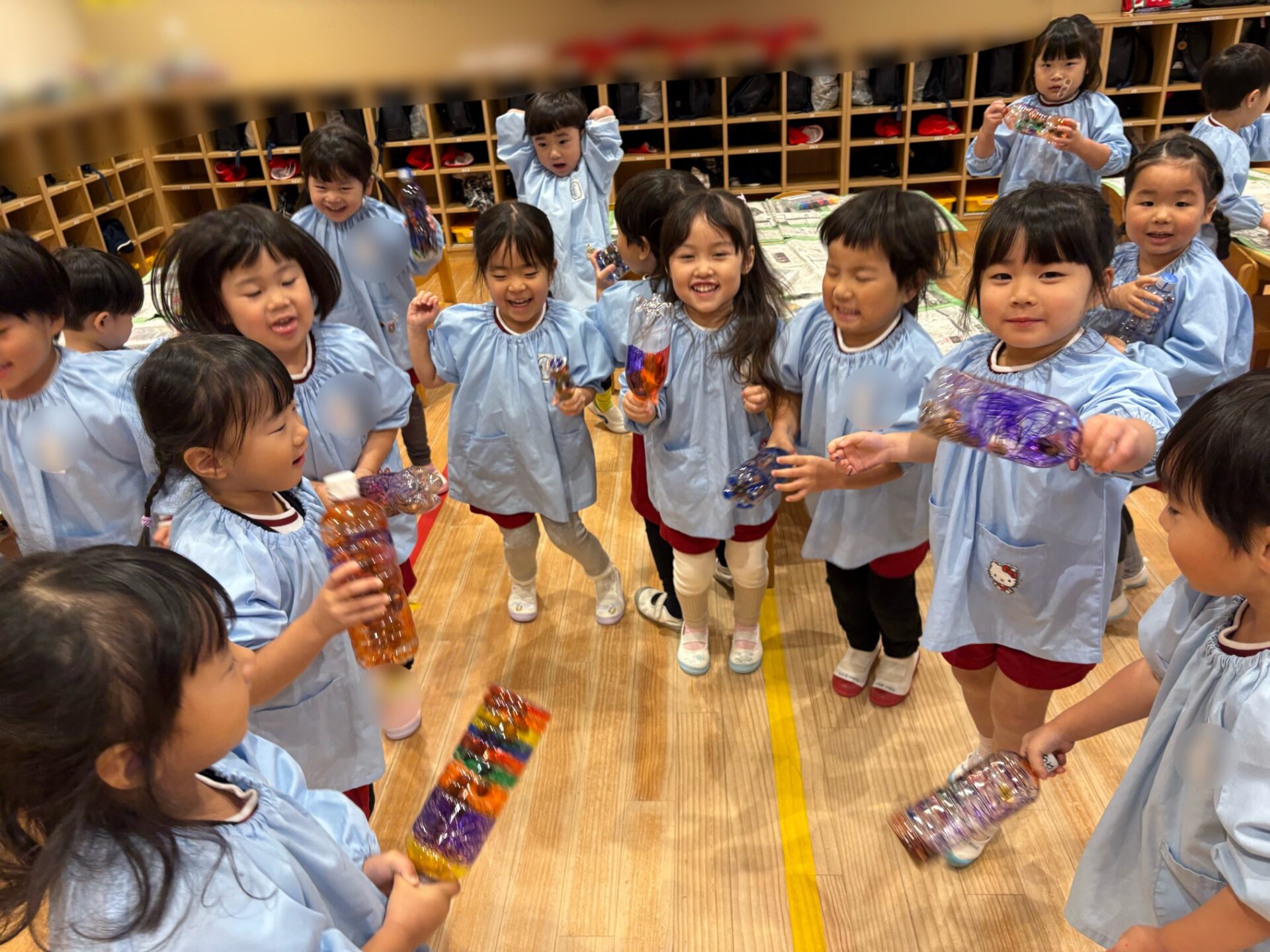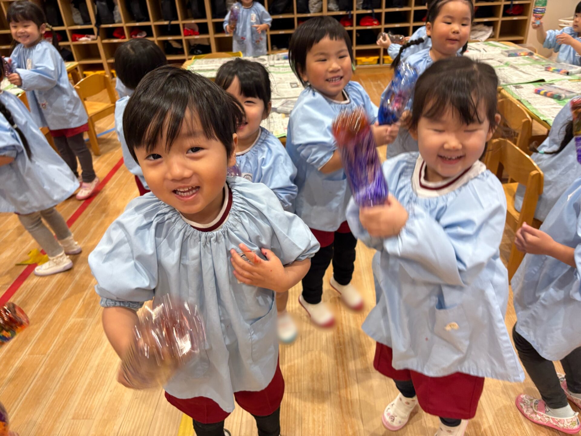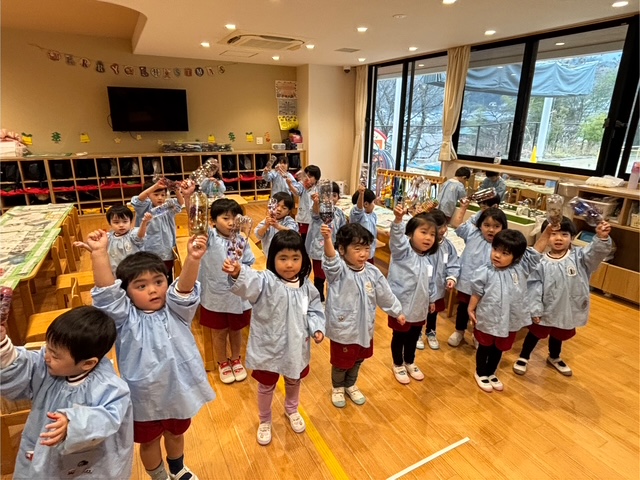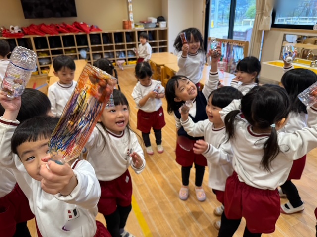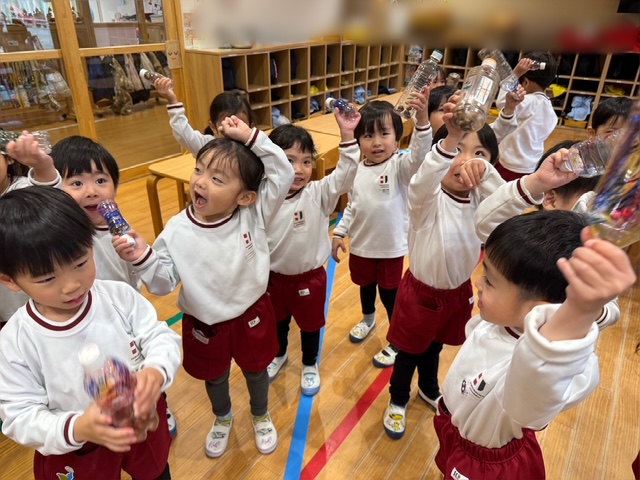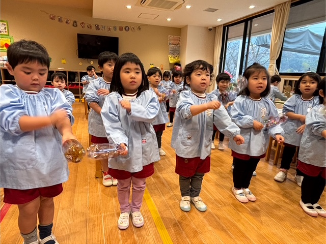 早速、振ってみました。「いい音がする!」「楽しいね!」次は音楽に合わせて振ってみよう!一人で音を鳴らすのも楽しいけど、みんなで合わせるともっと楽しいね!楽器遊びの楽しさをみんなで味わいました♪