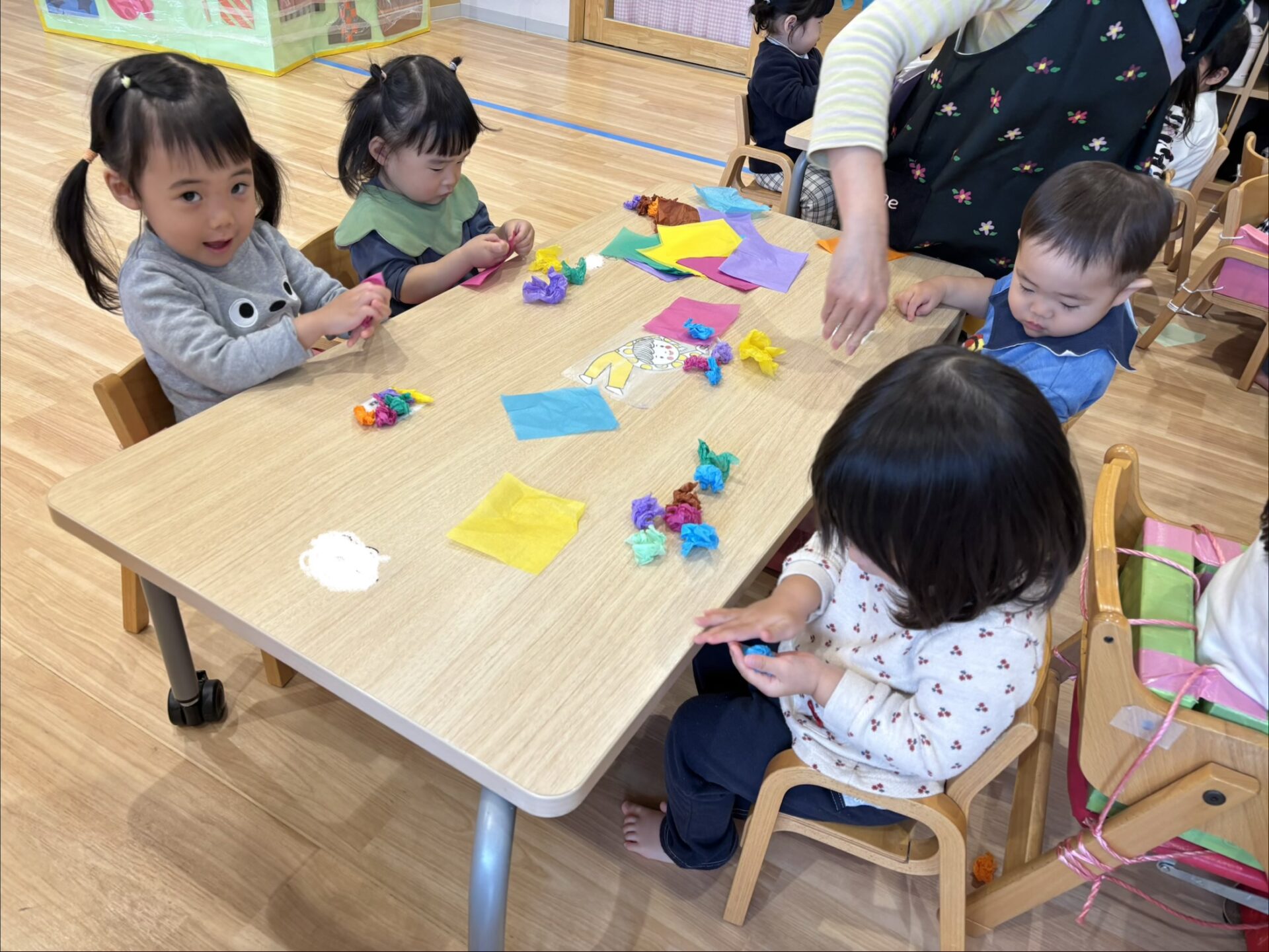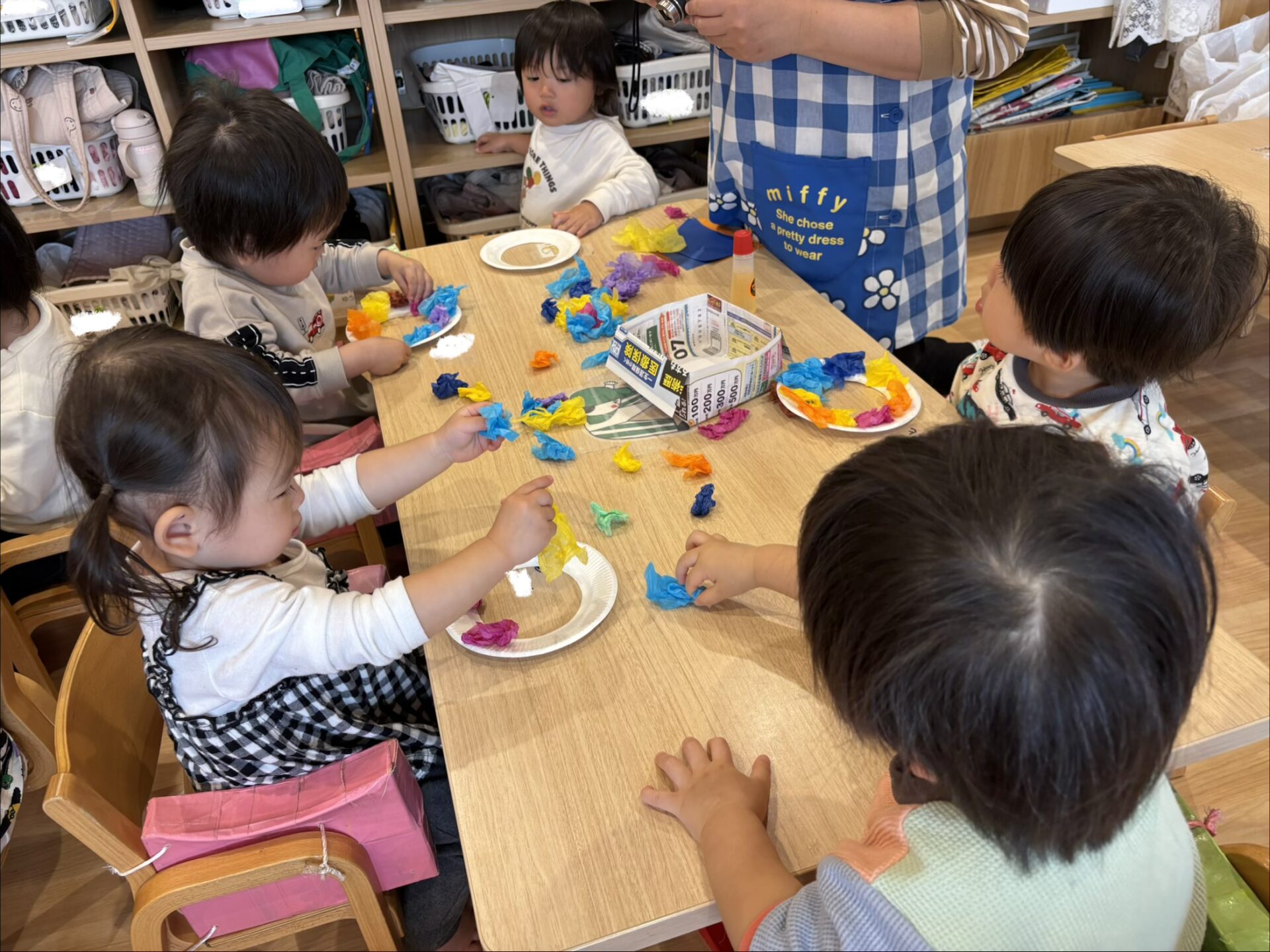 Spuirrel組は、シールを上手にはがしてペタペタ紙皿に貼ります。Rabbit組は、花紙をくるくる丸めて紙皿に貼りました。カラフルな雪だるまさんがたくさん出来ました⛄