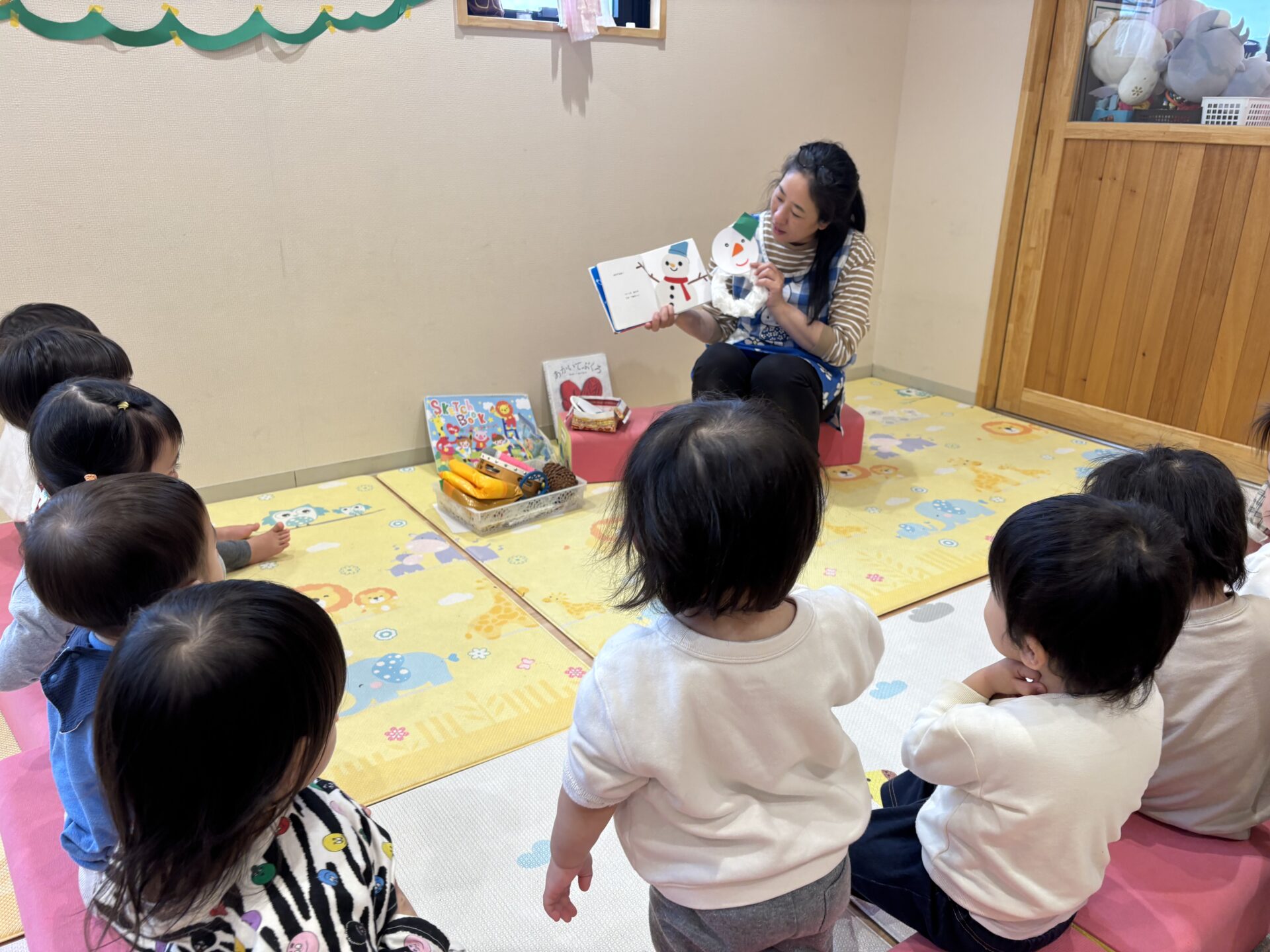 「ゆきのペンキ屋さんがお空から…ちらちら~♪」と歌をうたいました⛄雪だるまの絵本も読むと興味津々です💛みんなで雪だるま製作をしました❣