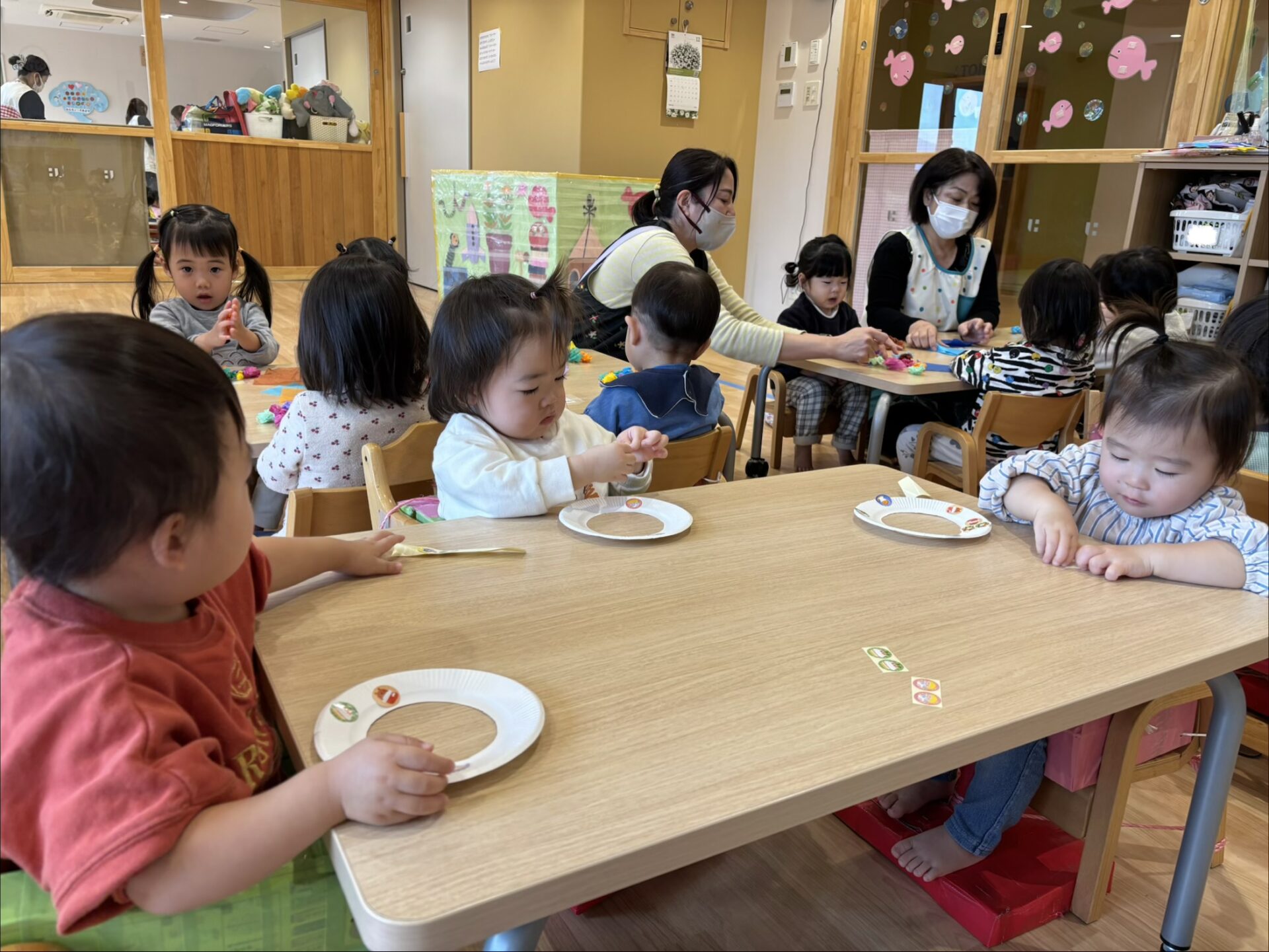 Spuirrel組は、シールを上手にはがしてペタペタ紙皿に貼ります。Rabbit組は、花紙をくるくる丸めて紙皿に貼りました。カラフルな雪だるまさんがたくさん出来ました⛄