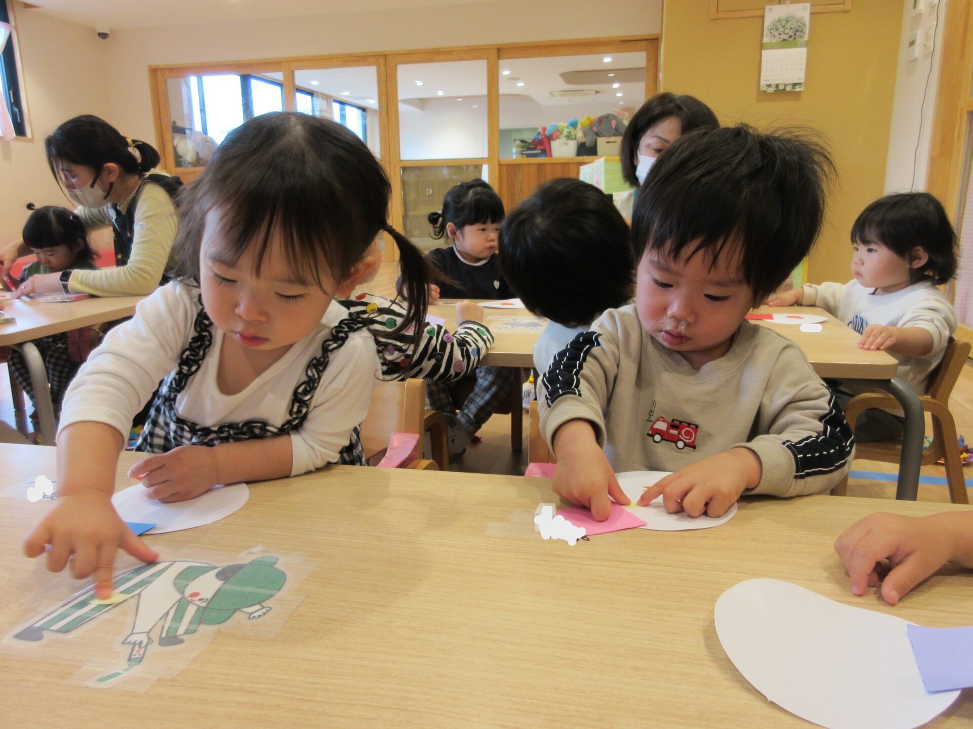 雪だるまの帽子を貼ったり、目や口を描くことにもチャレンジしました✨保育室前に掲示していますので、ぜひご覧ください☺