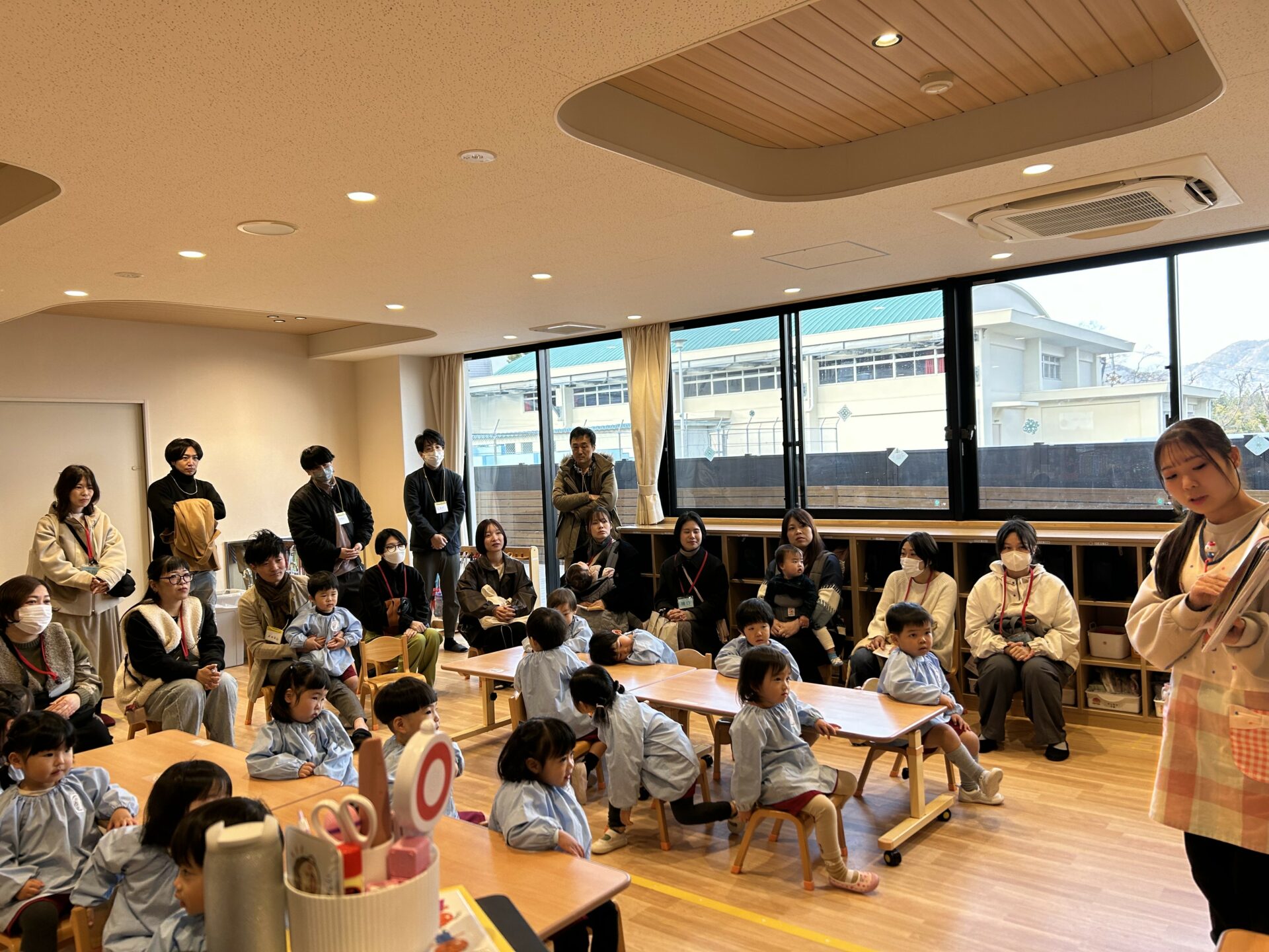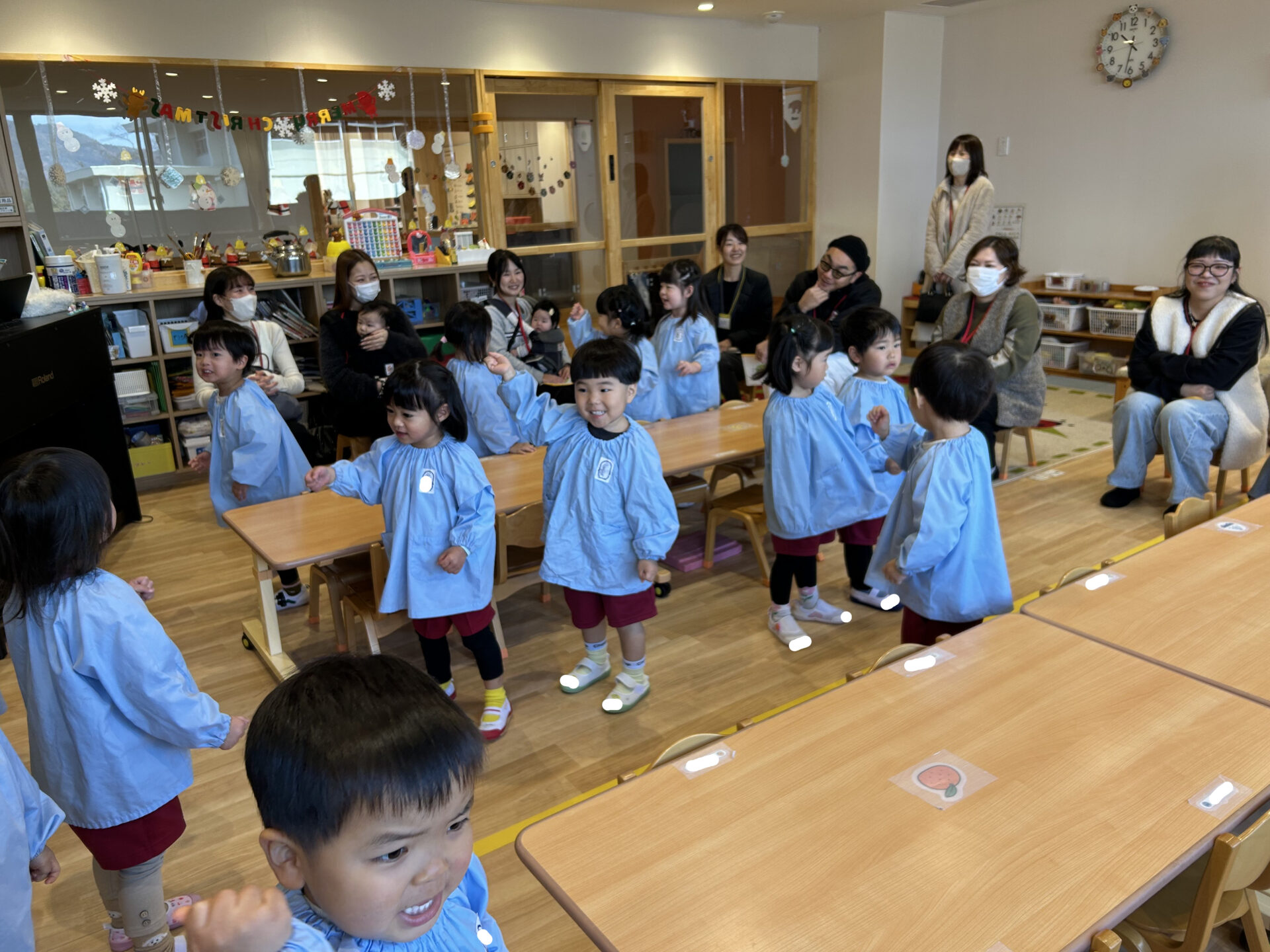 「あわてんぼうのサンタクロース」「しあわせならてをたたこう」の2曲を歌うと、おうちの方から大きな拍手をもらい嬉しそうな園児たち❤️温かい雰囲気の中で楽しく歌うことができました🎤