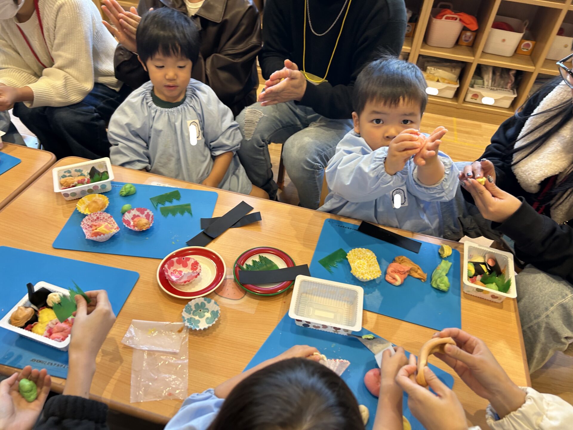 次はおうちの方にも参加してもらい、一緒にお弁当作りを楽しみました。おかずカップやバラン、のりを使ってだんだんとお弁当が出来上がってきました!「おにぎり作ったよ🍙」「ミートボールいっぱい!🟤」「トマト好きだからトマト作るね🍅」などイメージが膨らんでいる様子でした!