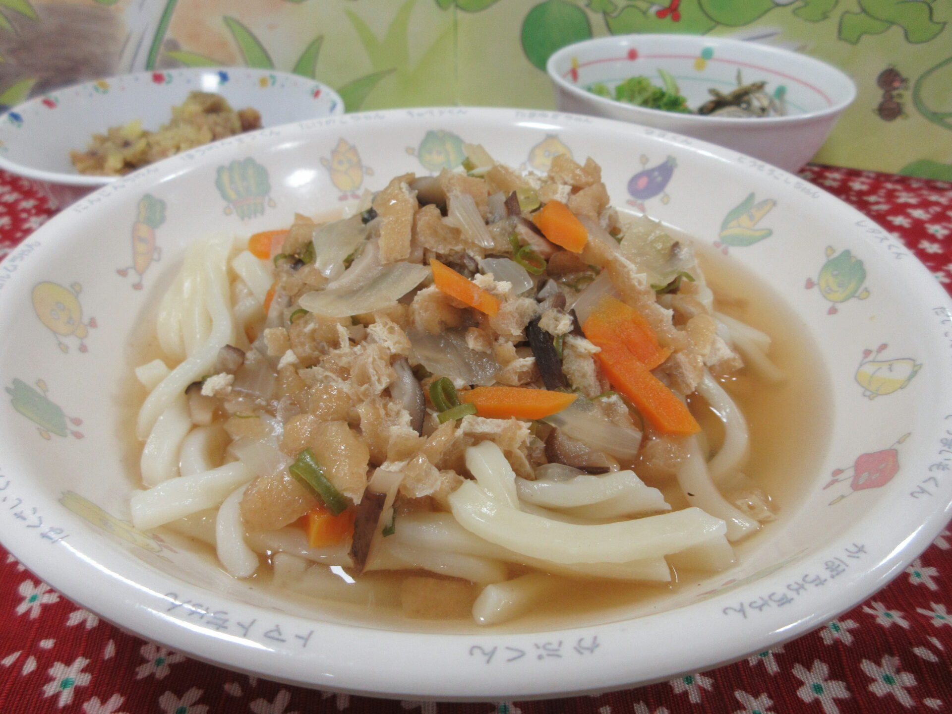 油揚げがたくさん入って椎茸風味のだしが美味しい、うどんでした。小豆煮は甘く、🥦ブロッコリーはおかか風味で食べやすかったです。