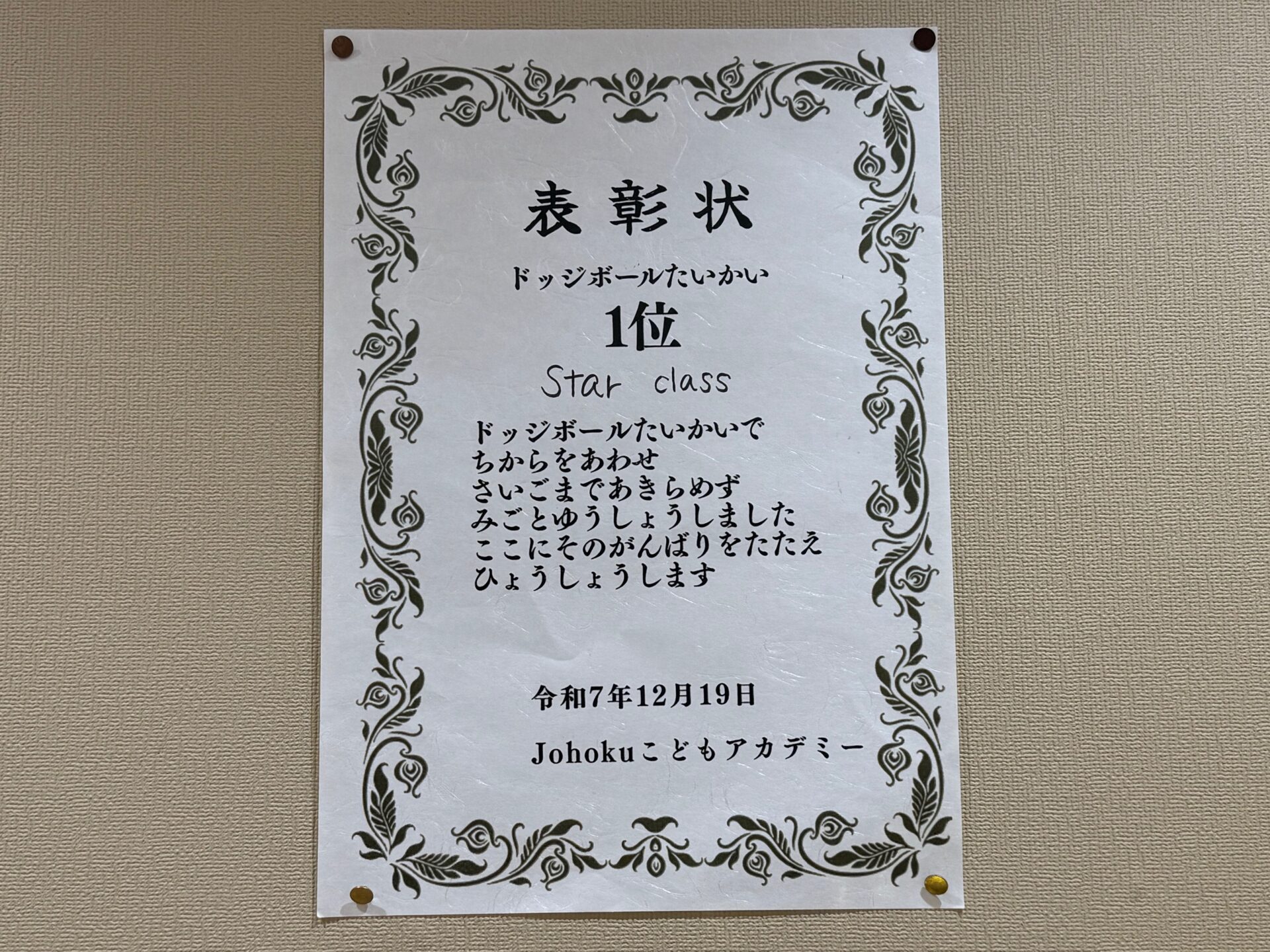白熱した試合の末、見事1位になったStarクラスには表彰状が贈られ、園長先生から手渡されました。