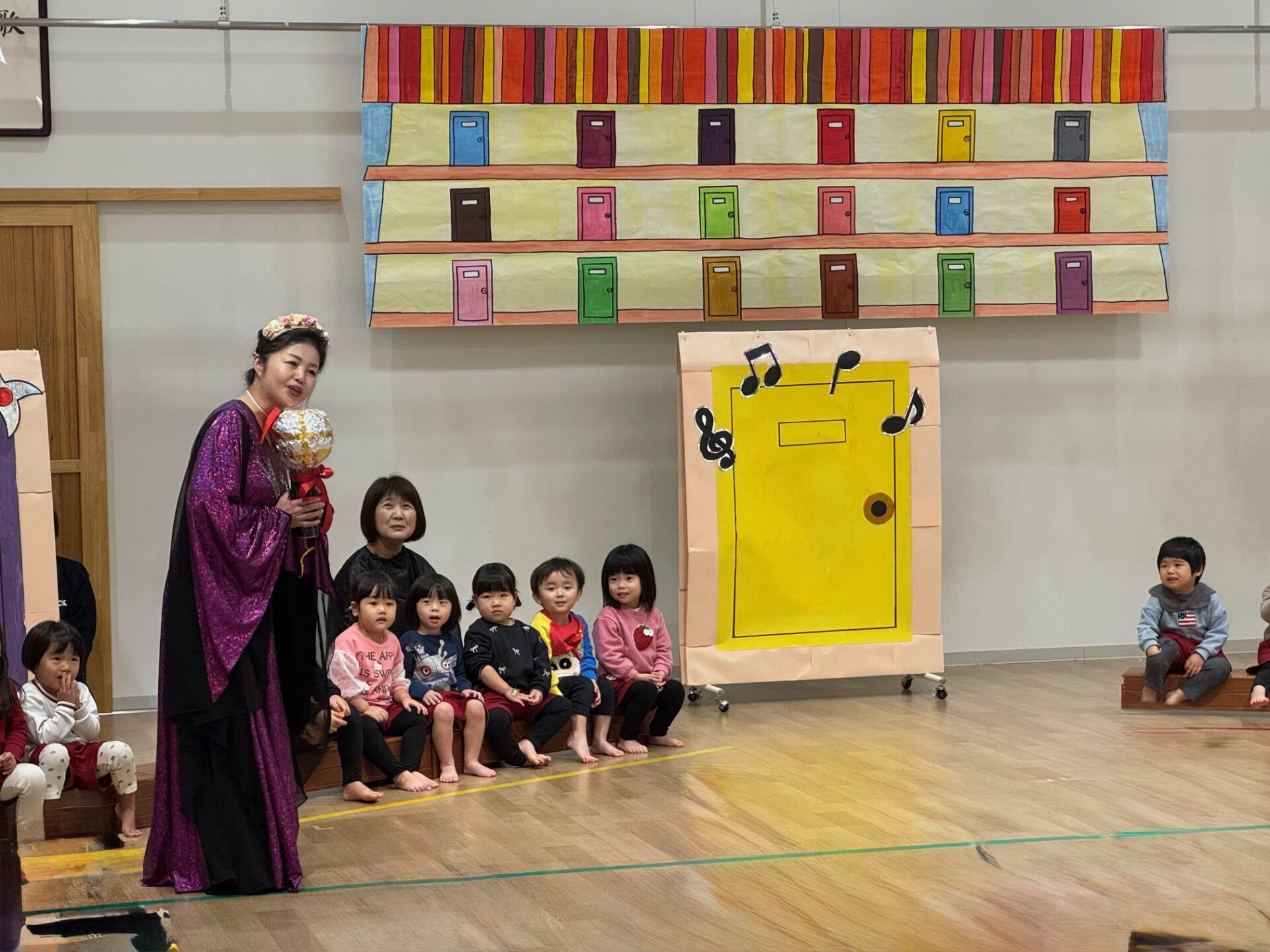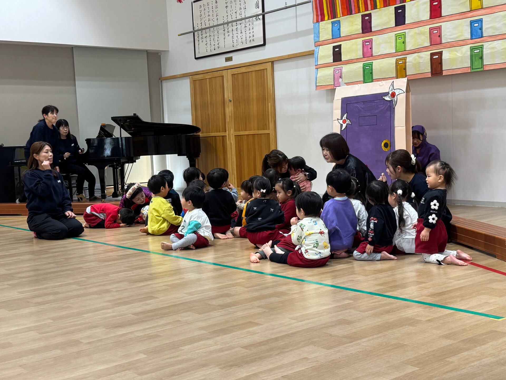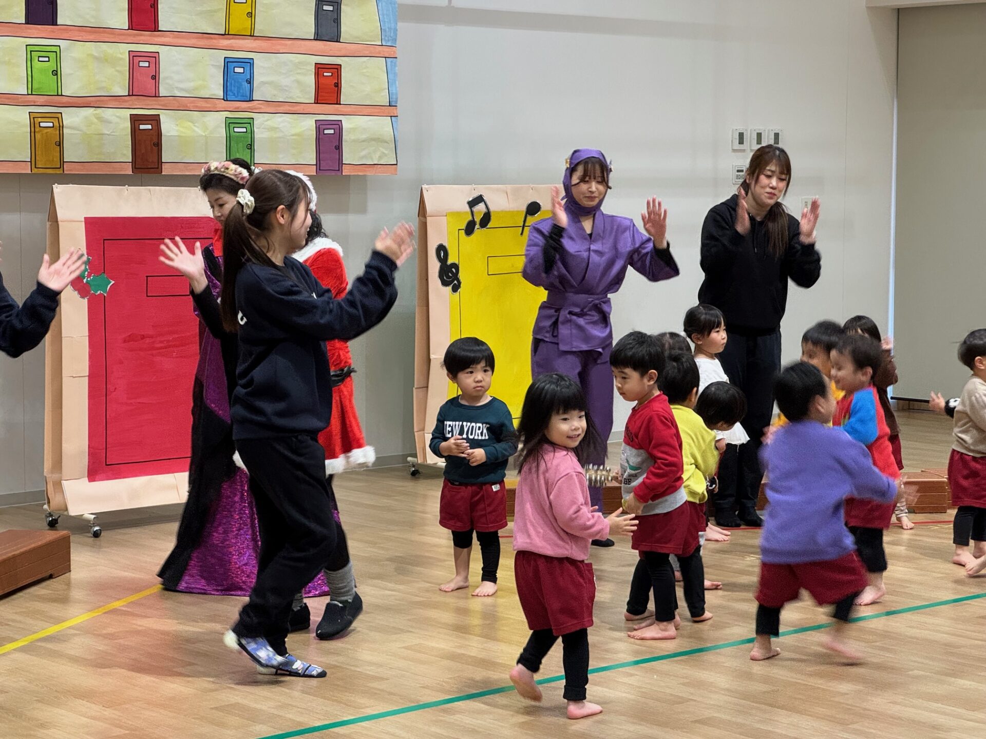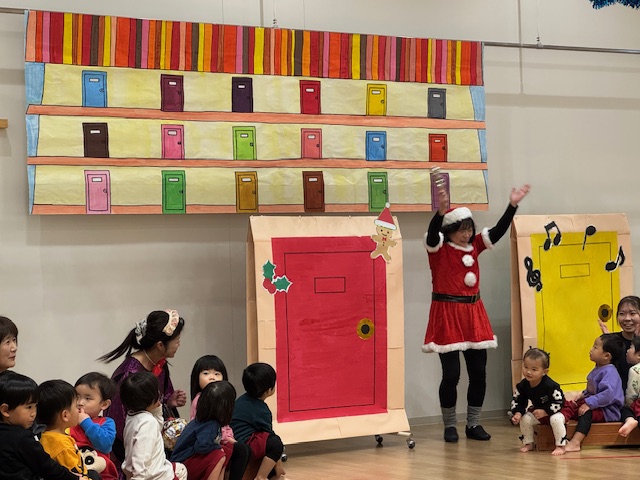 そしてついに赤色のドアをノックすると、、、そこからサンタさんが軽快なダンスで登場🎅お手紙をくれたのはサンタさんだったのがわかり、みんなで『ジングルベル』を踊って楽しみました!