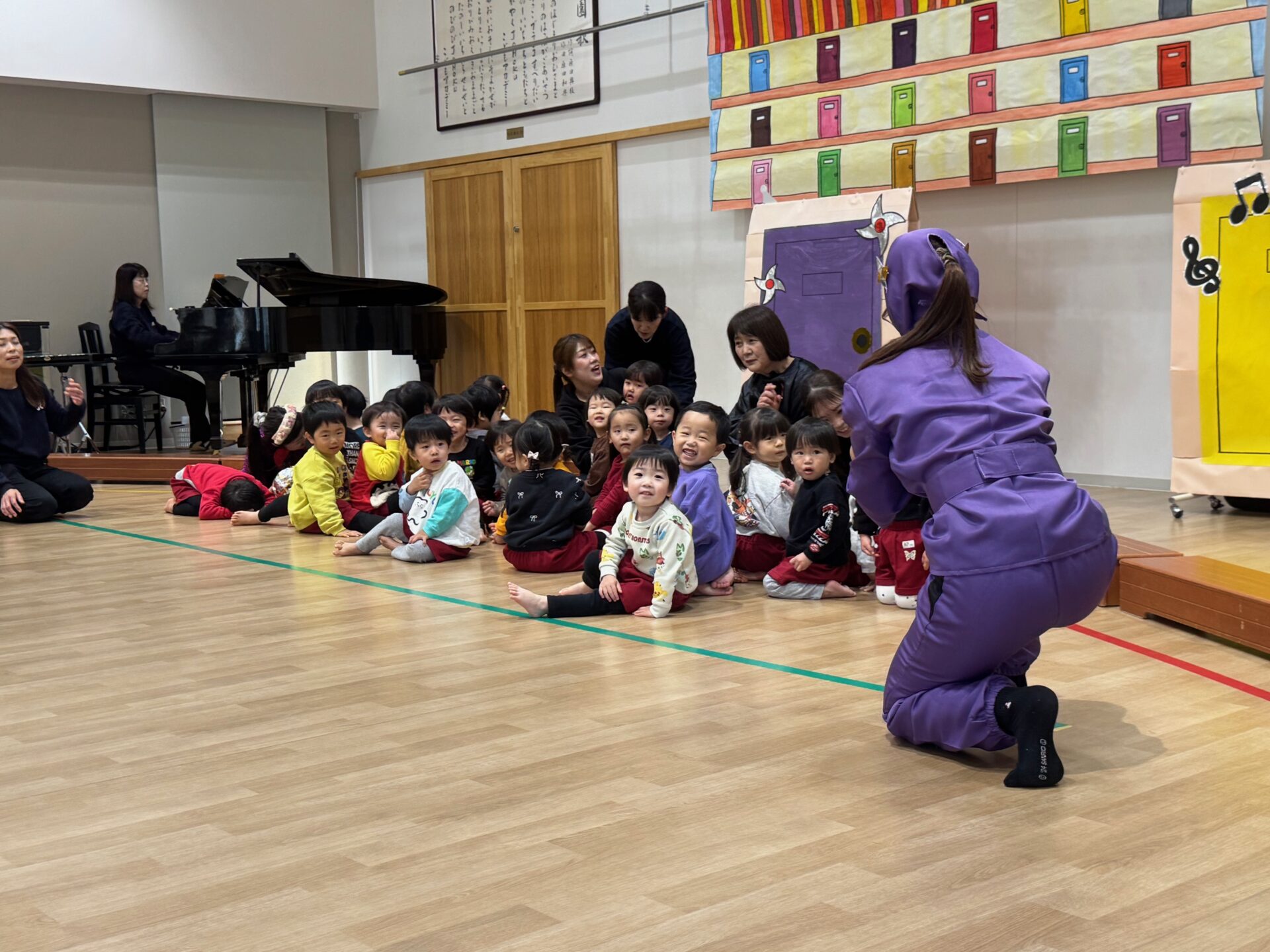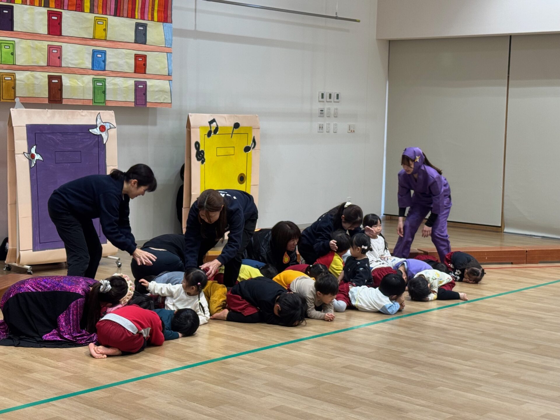 何だか怪しいドア・・・小さな声で「とんとんとん」。忍者参上!修行は【隠れ身の術(石)】、【俊足の術(自転車)】【忍びの術(抜き足差し足)】。普段の生活の中でおこなっているリズムあそびを取り込みました。